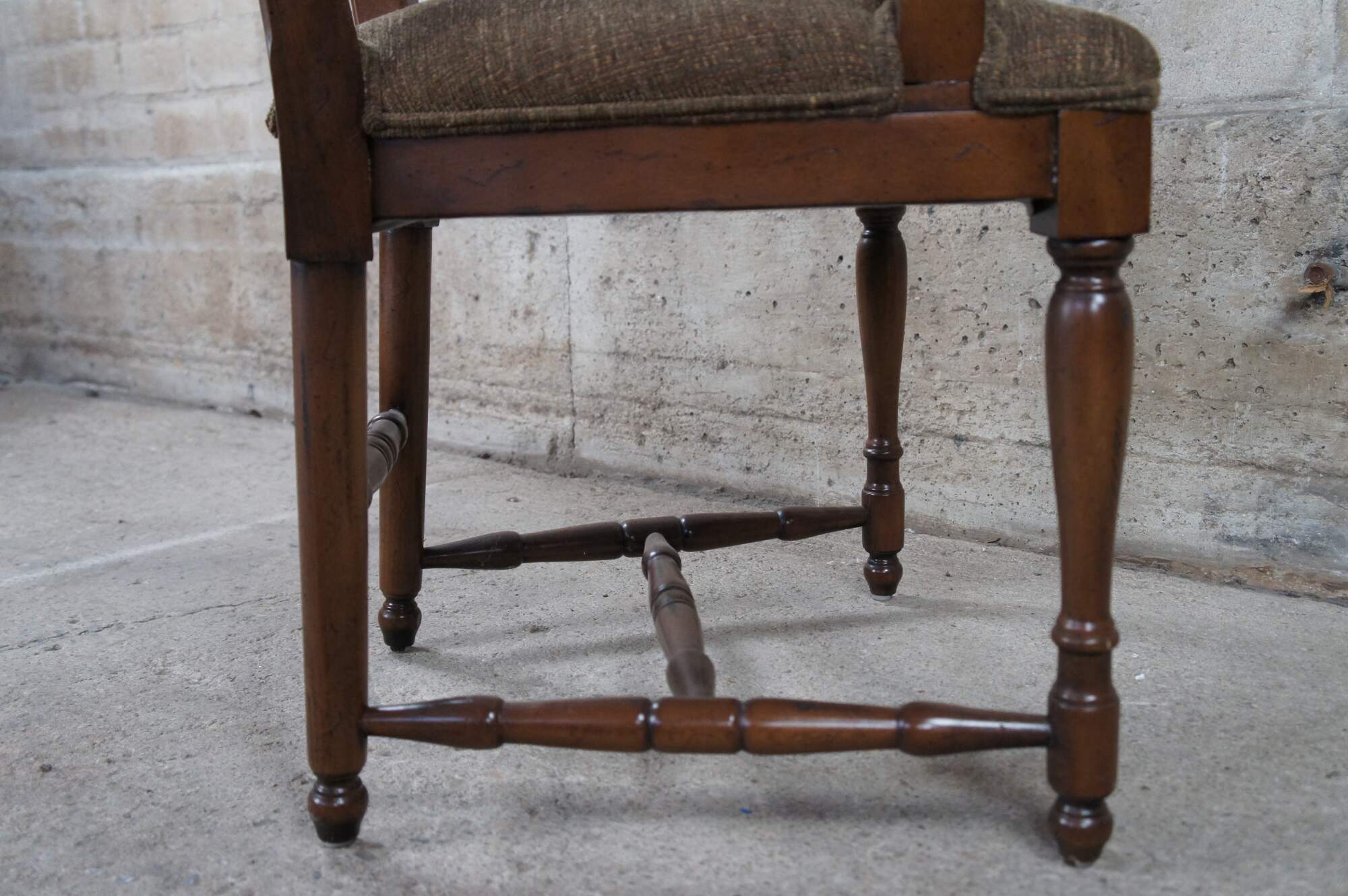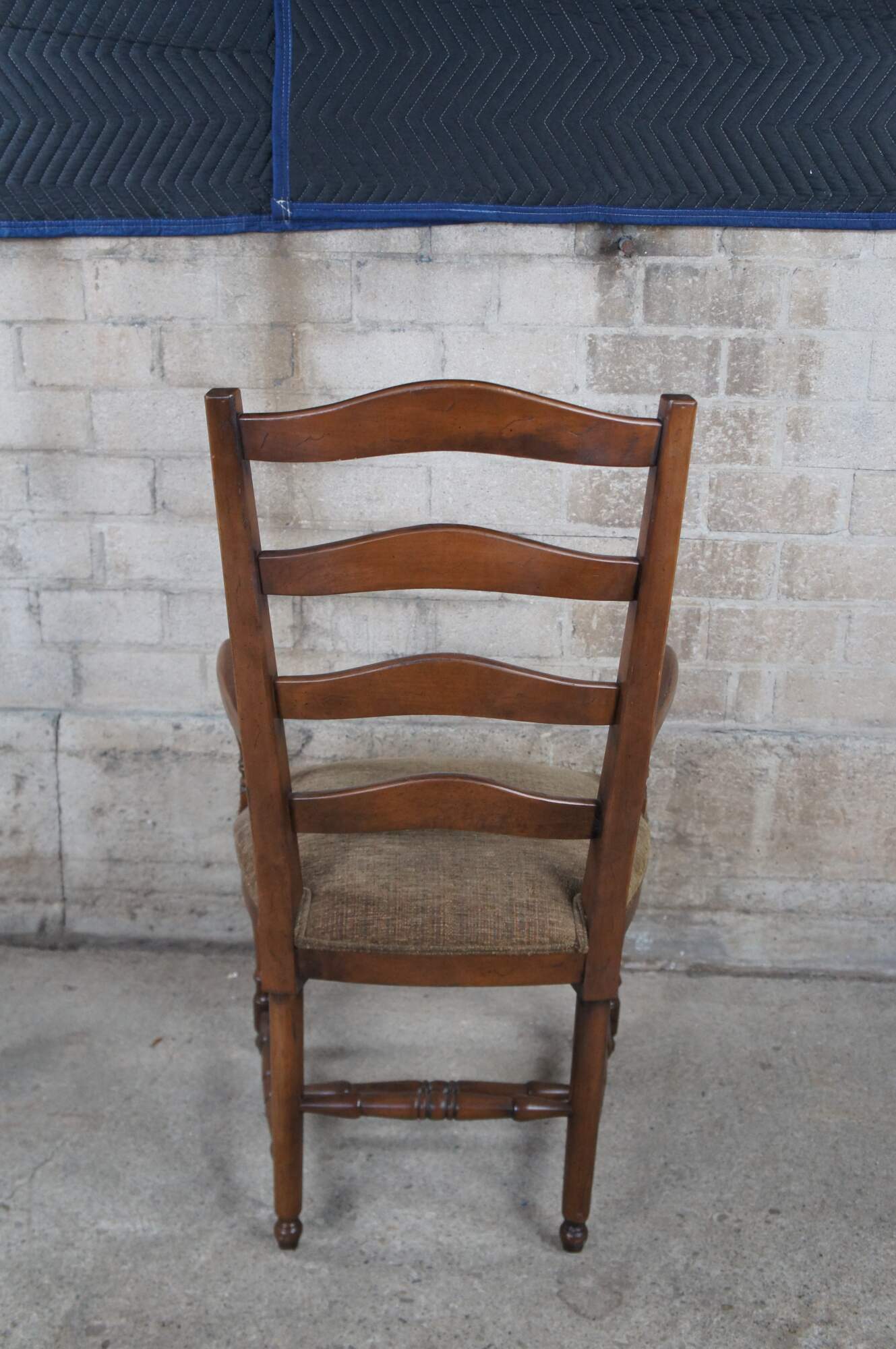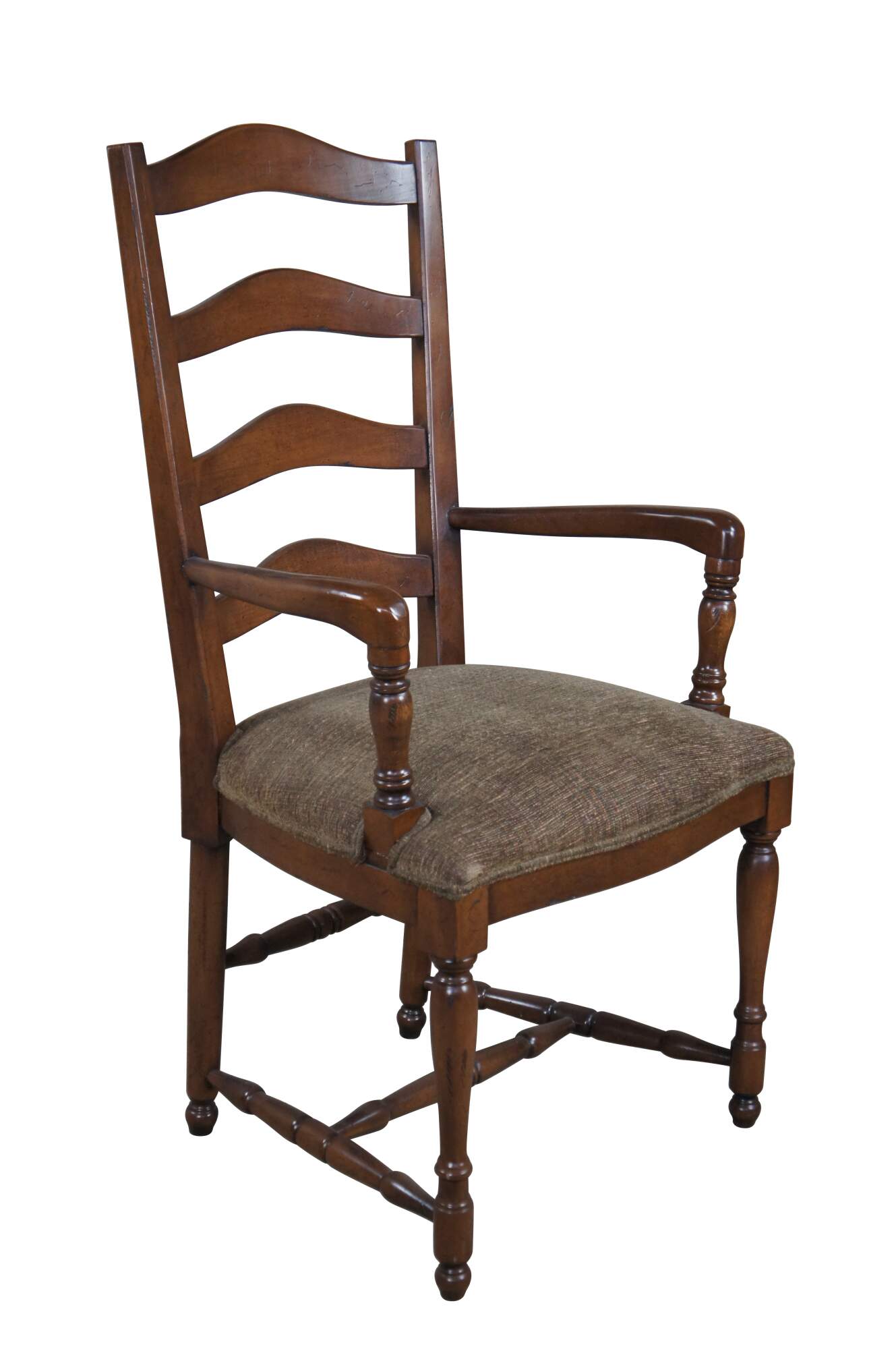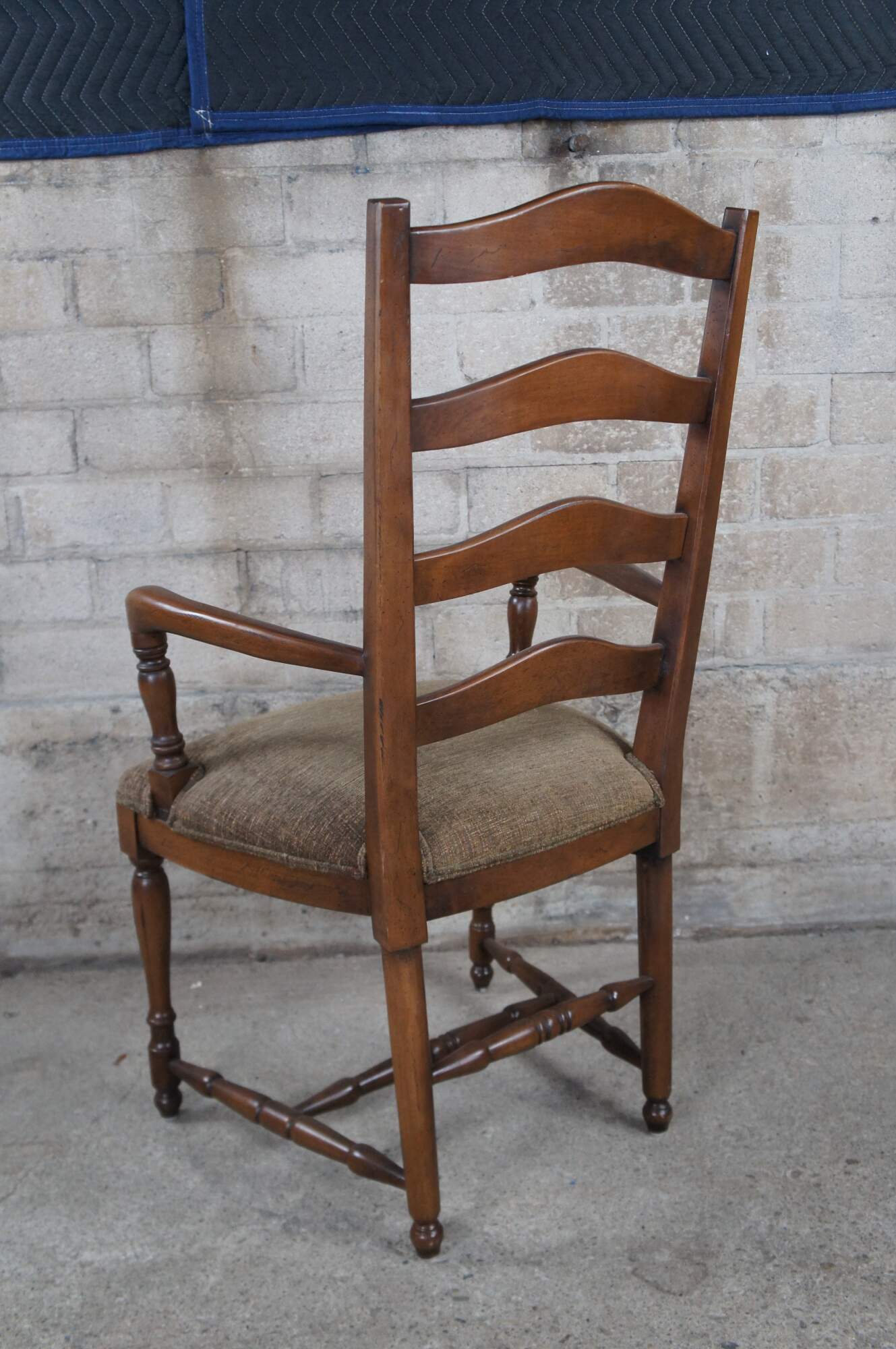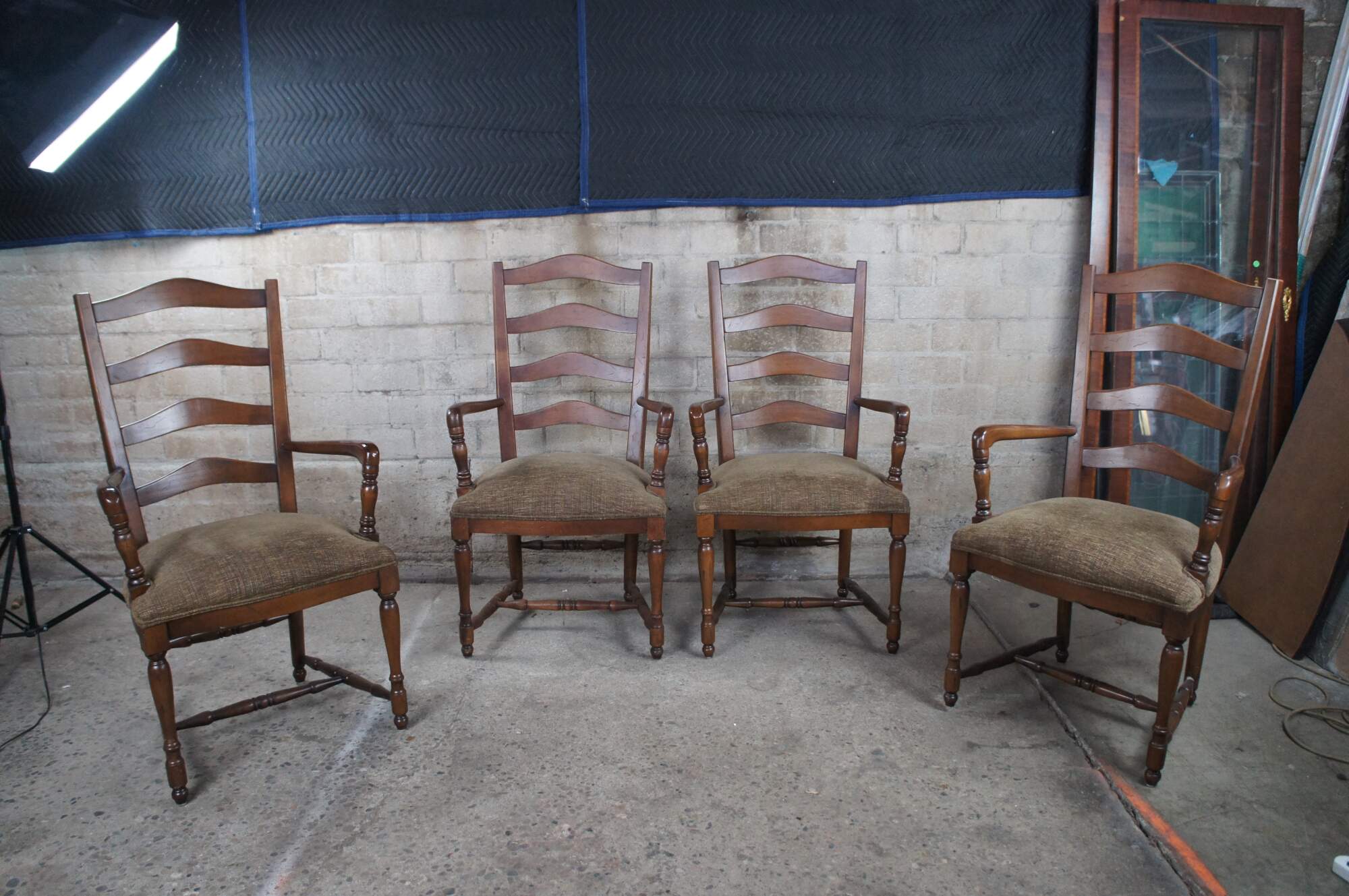 4 vintage country French dining chairs, circa late 20th century. Attributed to Guy Chaddock. Features a distressed oak frame with ladderback, leading to pronounced arms over an upholstered seat and turned legs with an H stretcher and turnip feet.