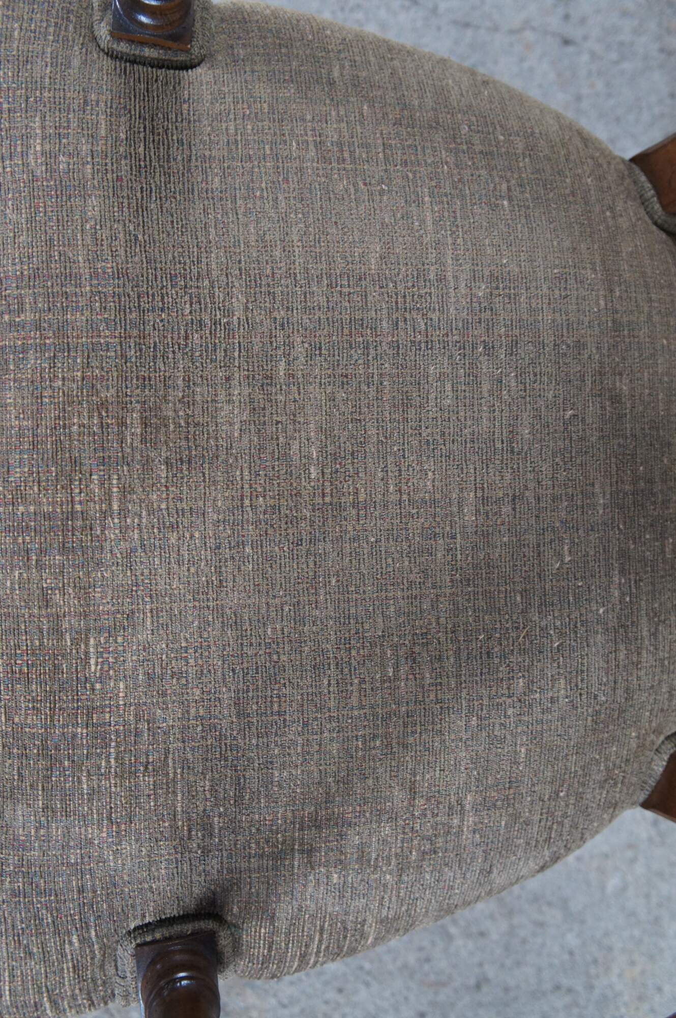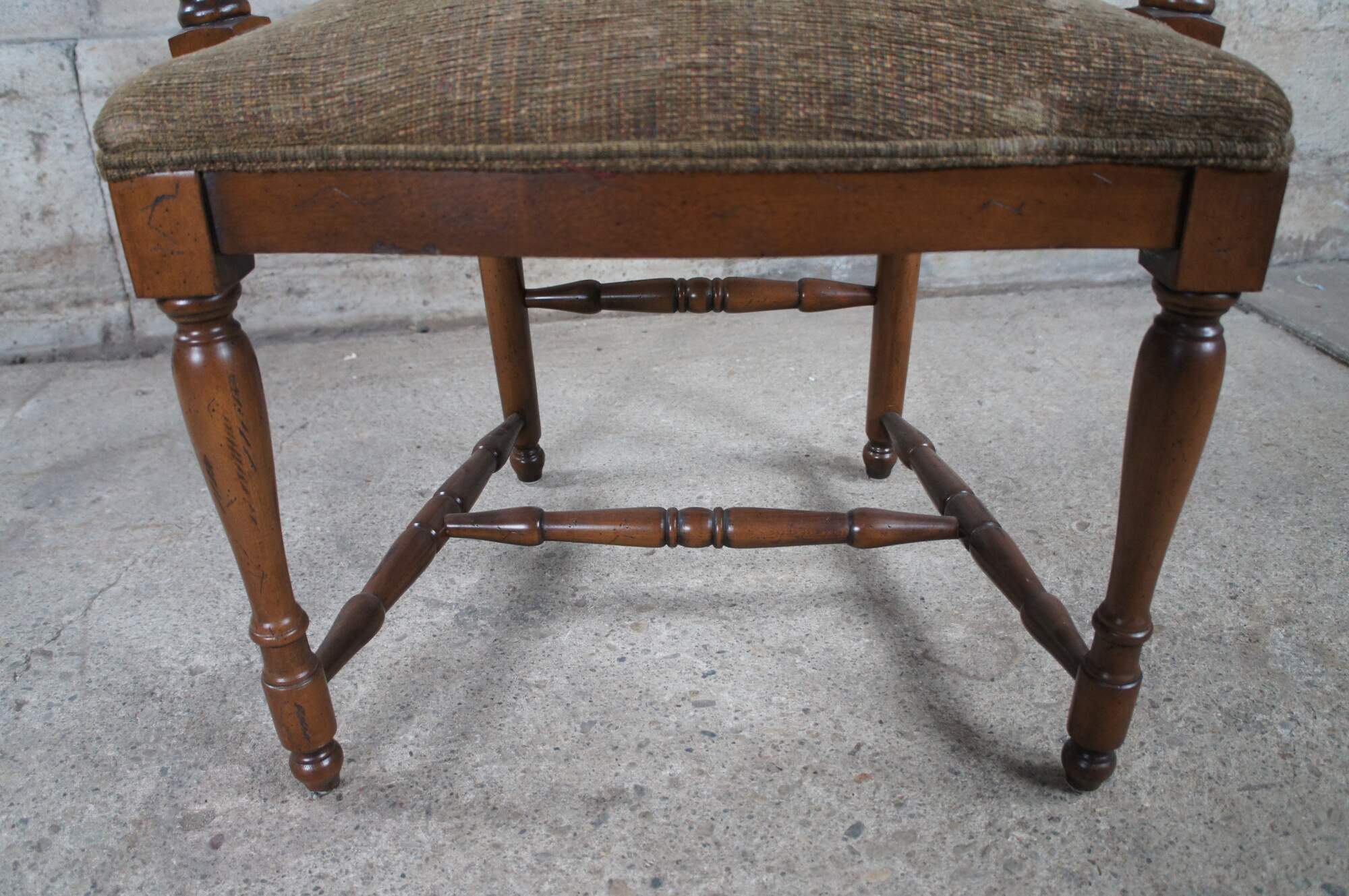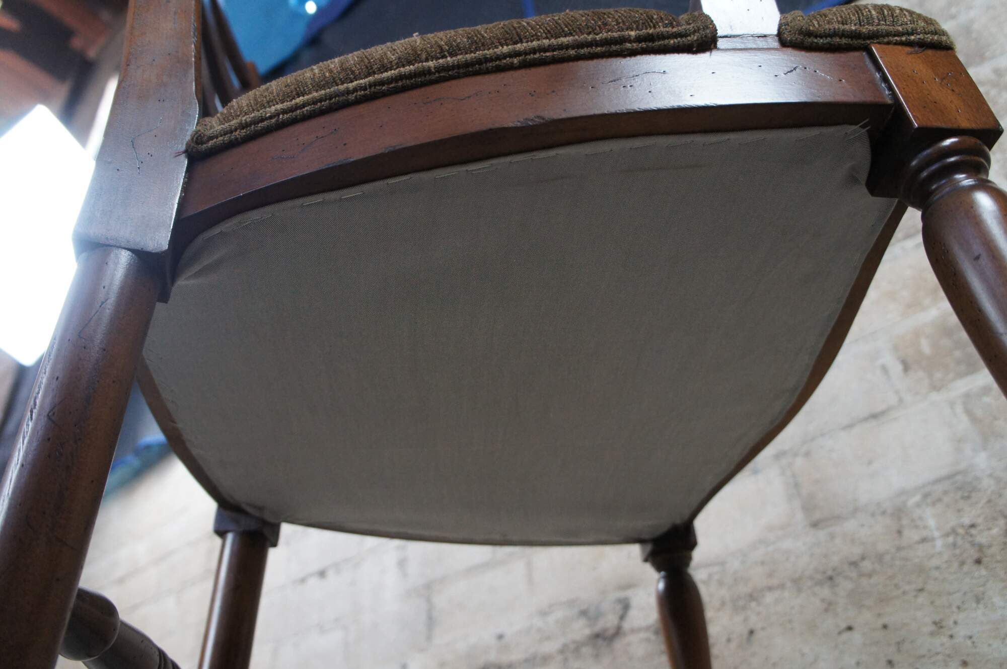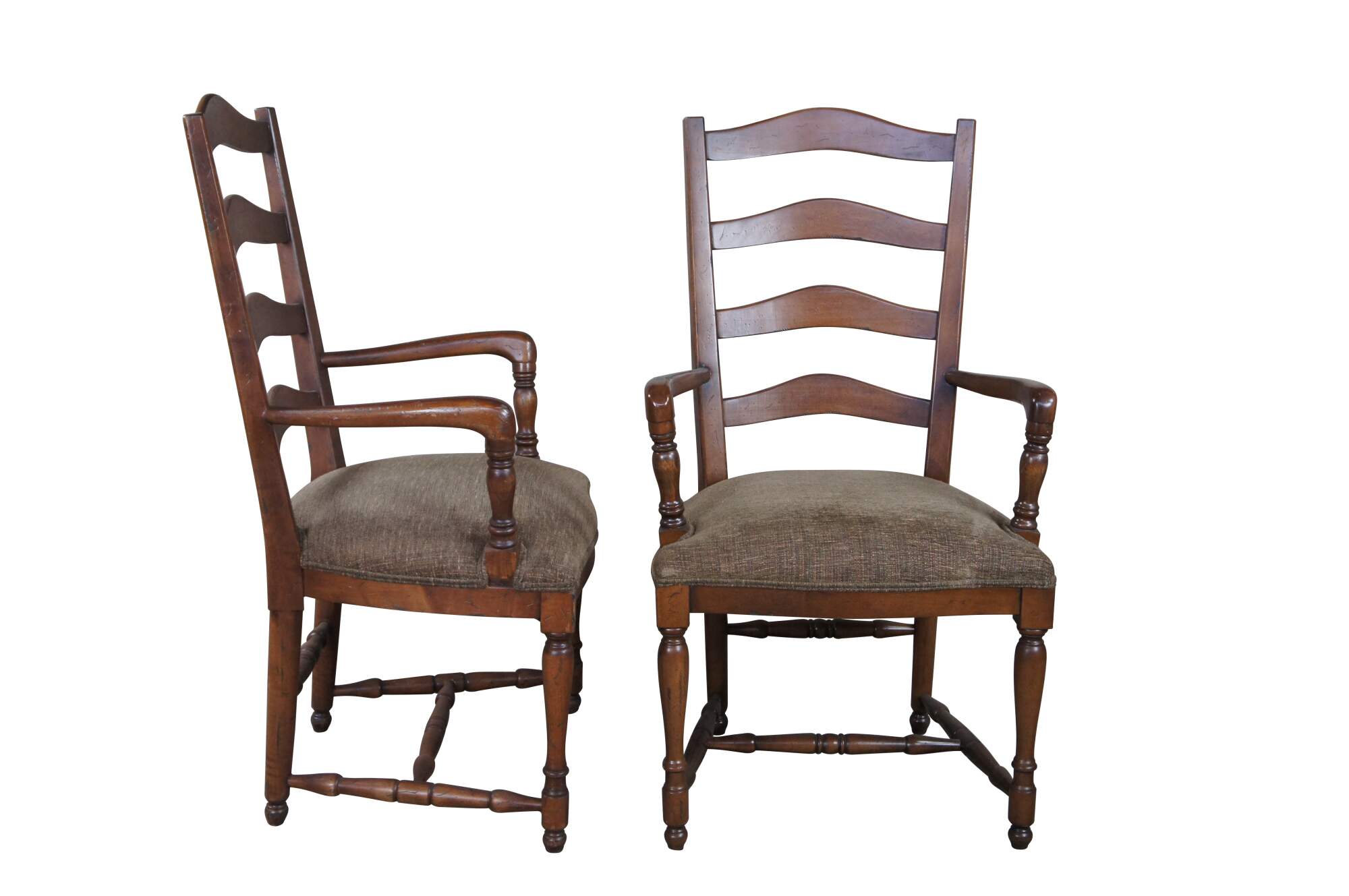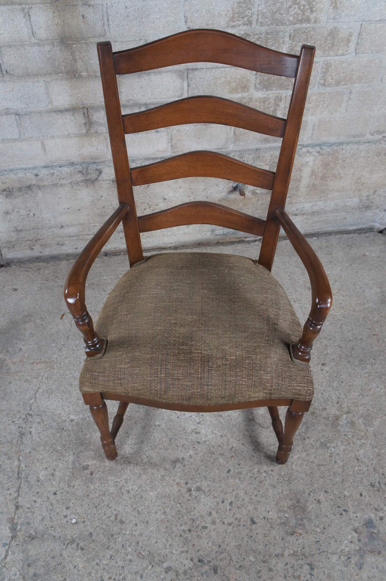 4 vintage country French dining chairs, circa late 20th century. Attributed to Guy Chaddock. Features a distressed oak frame with ladderback, leading to pronounced arms over an upholstered seat and turned legs with an H stretcher and turnip feet.