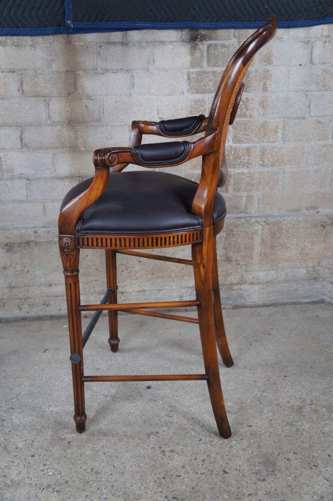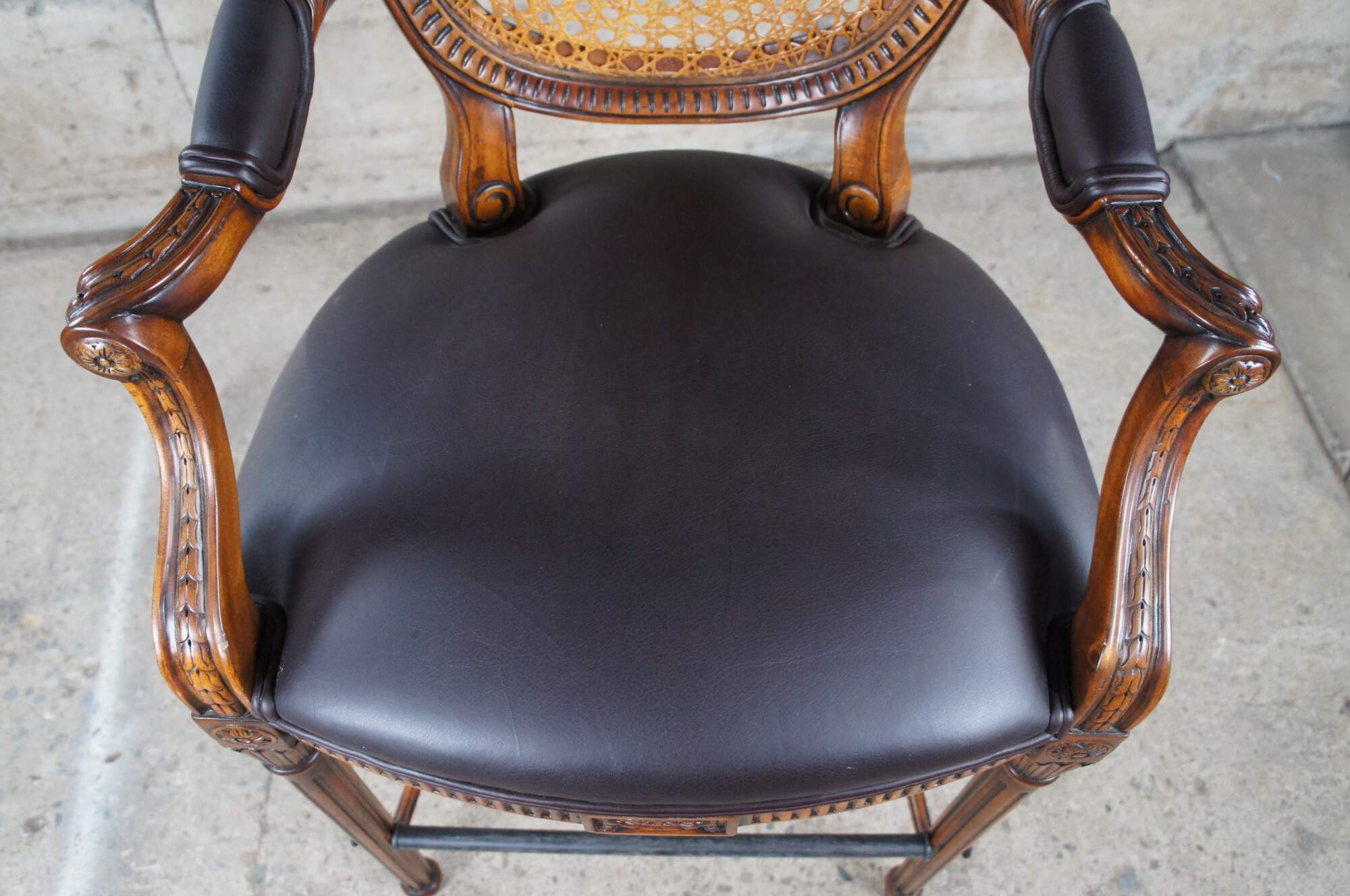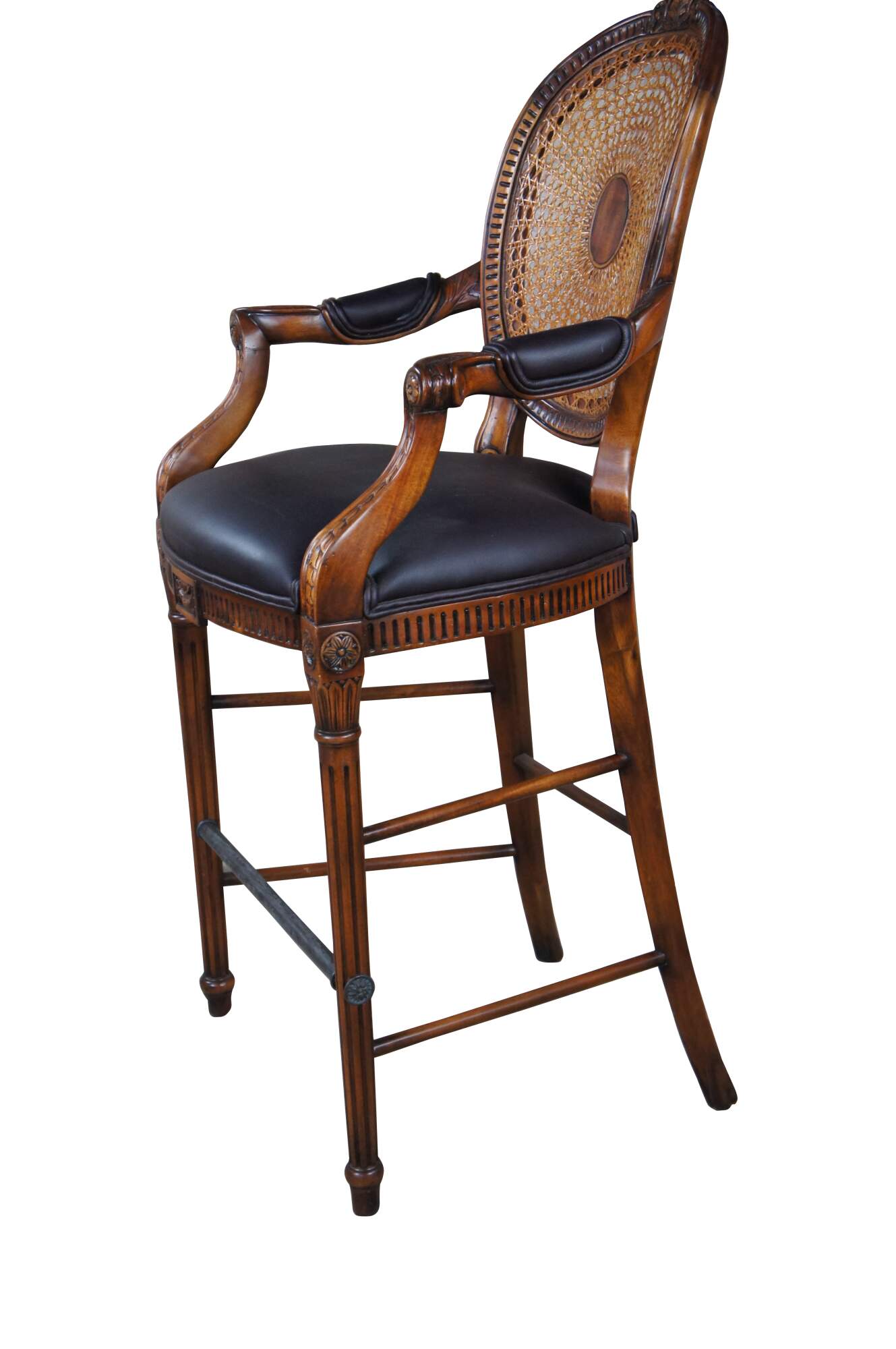 Theodore Alexander French Louis XV Bar Stool. Made from mahogany with cane back, padded arms, brown leather seat and turned fluted legs leading to foot rest and turnip feet. The chair is carved with traditional french medallions, fluting and foliate detail.