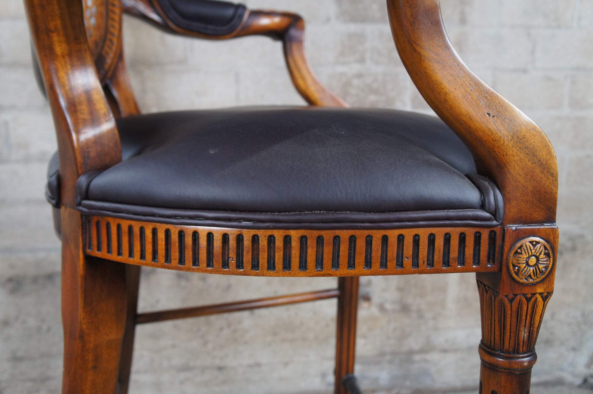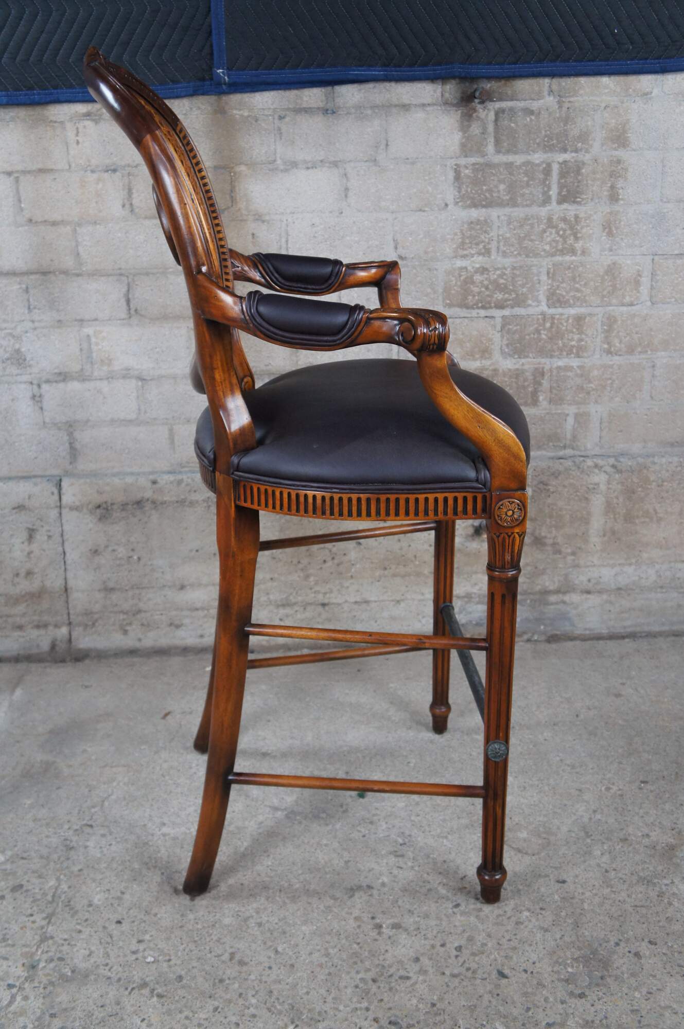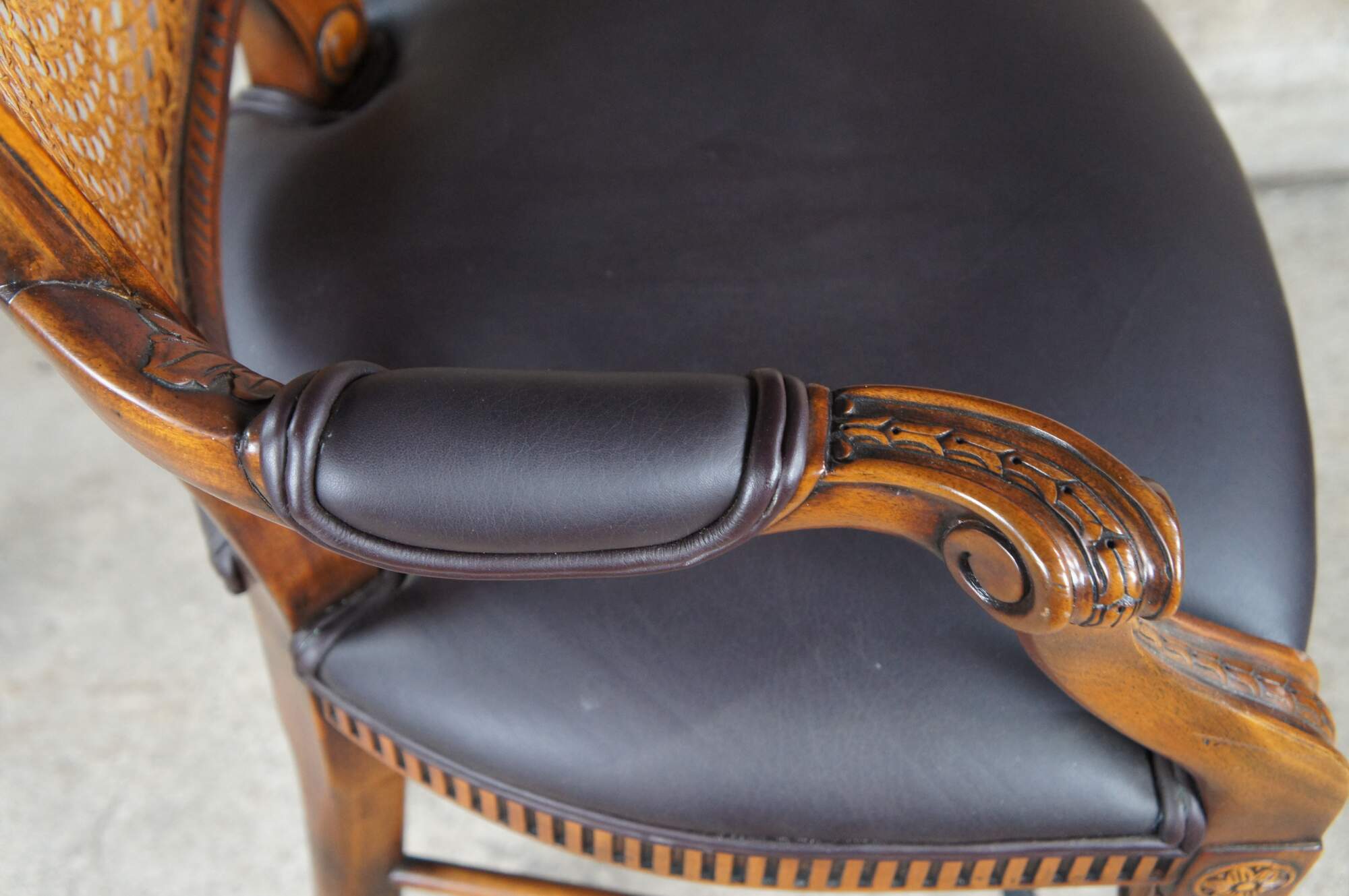 Theodore Alexander French Louis XV Bar Stool. Made from mahogany with cane back, padded arms, brown leather seat and turned fluted legs leading to foot rest and turnip feet. The chair is carved with traditional french medallions, fluting and foliate detail.