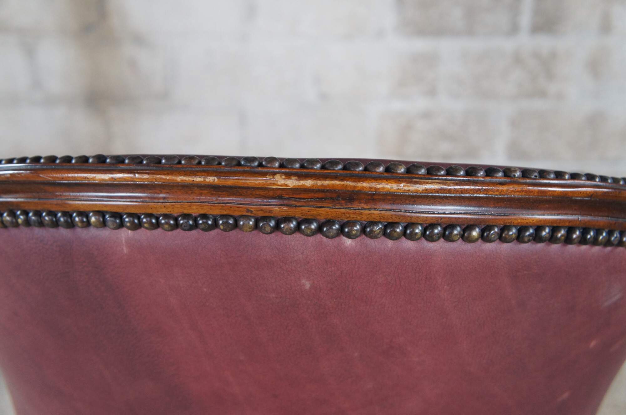Set of 3 An Evening At Ease by Theodore Alexander. Inspired by Napoleon III and Louis XV styling. Features a hand carved mahogany scoop back, a padded red leather upholstered seat, with scroll arms and cabriole legs with a verdigris brass foot rest. MSRP $4,119/ Per chair