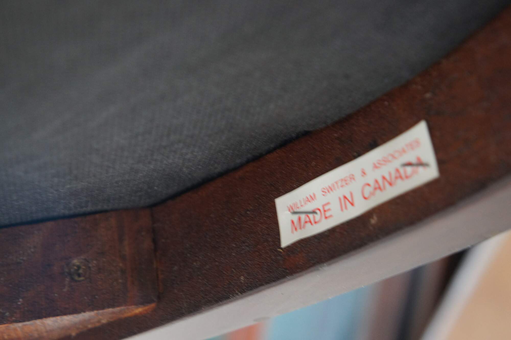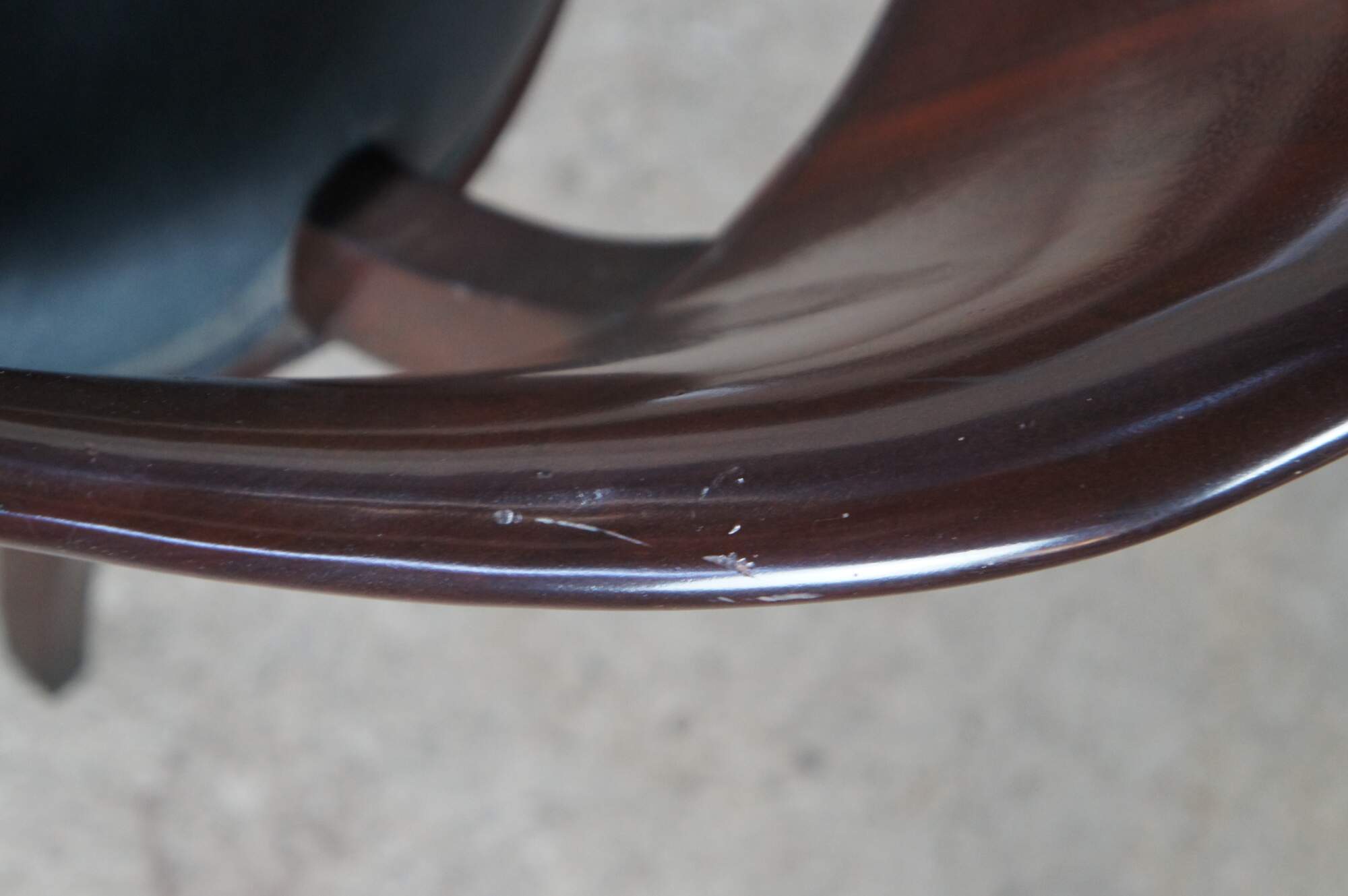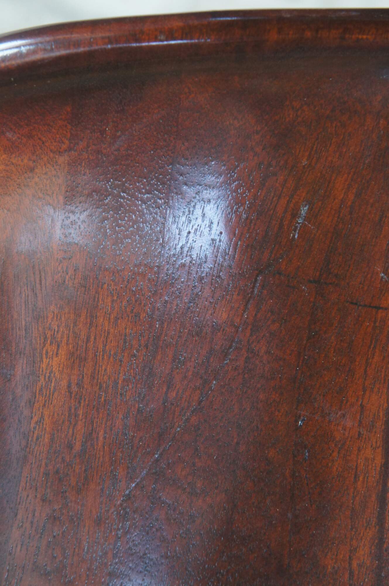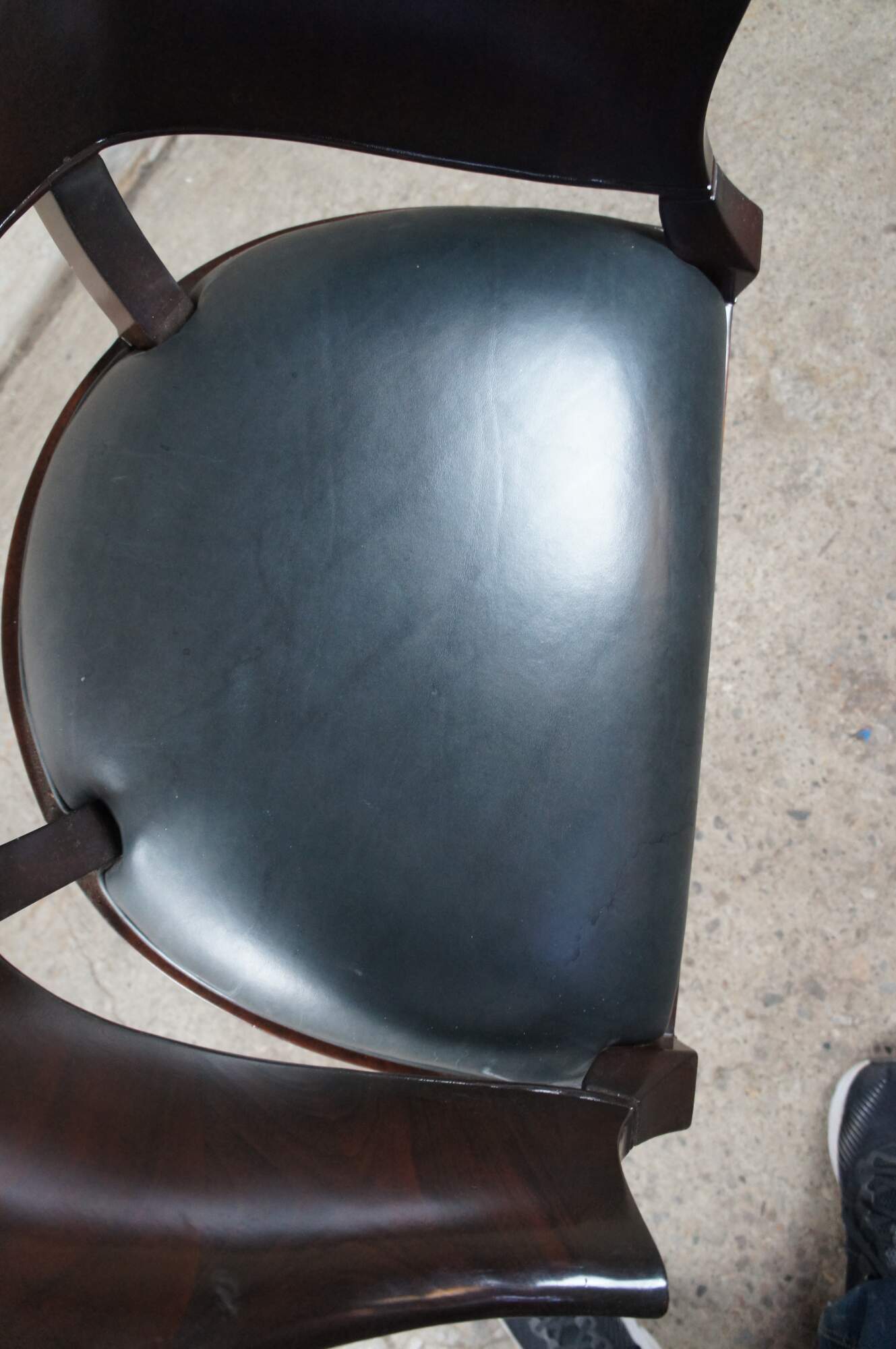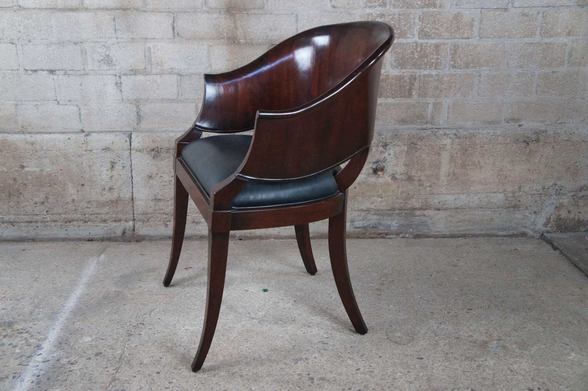 William Switzer Austrian Biedermeier style yoke back Arm Chair. Made from mahogany with beautiful barrel back and leather upholstered seat. Features square tapered saber legs. William Switzer Fine Furniture Made in Canada, WS1B-0952