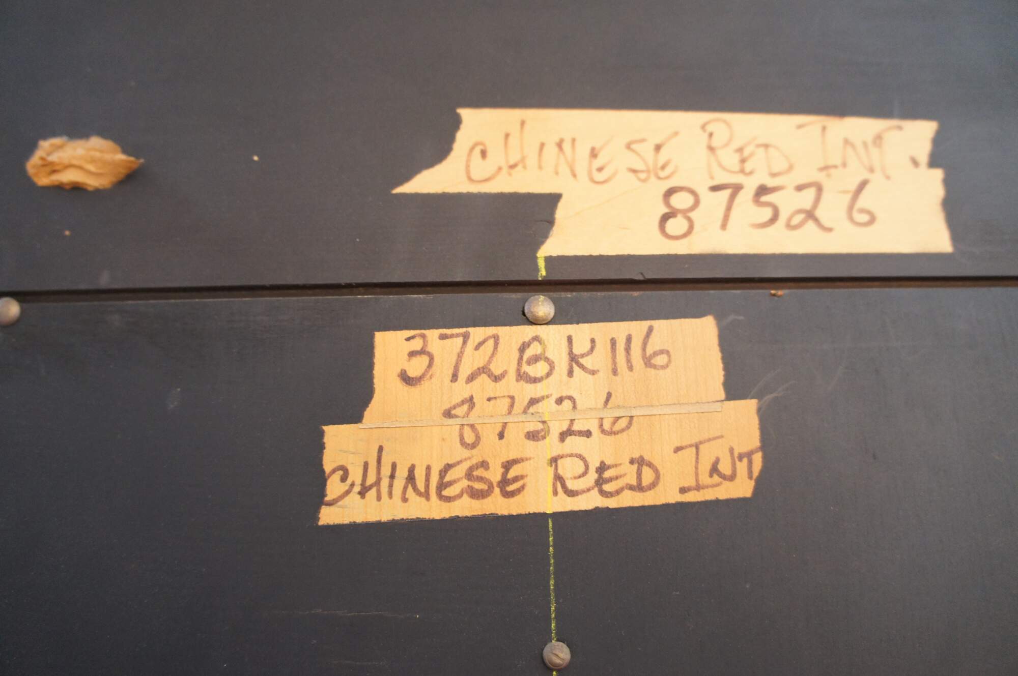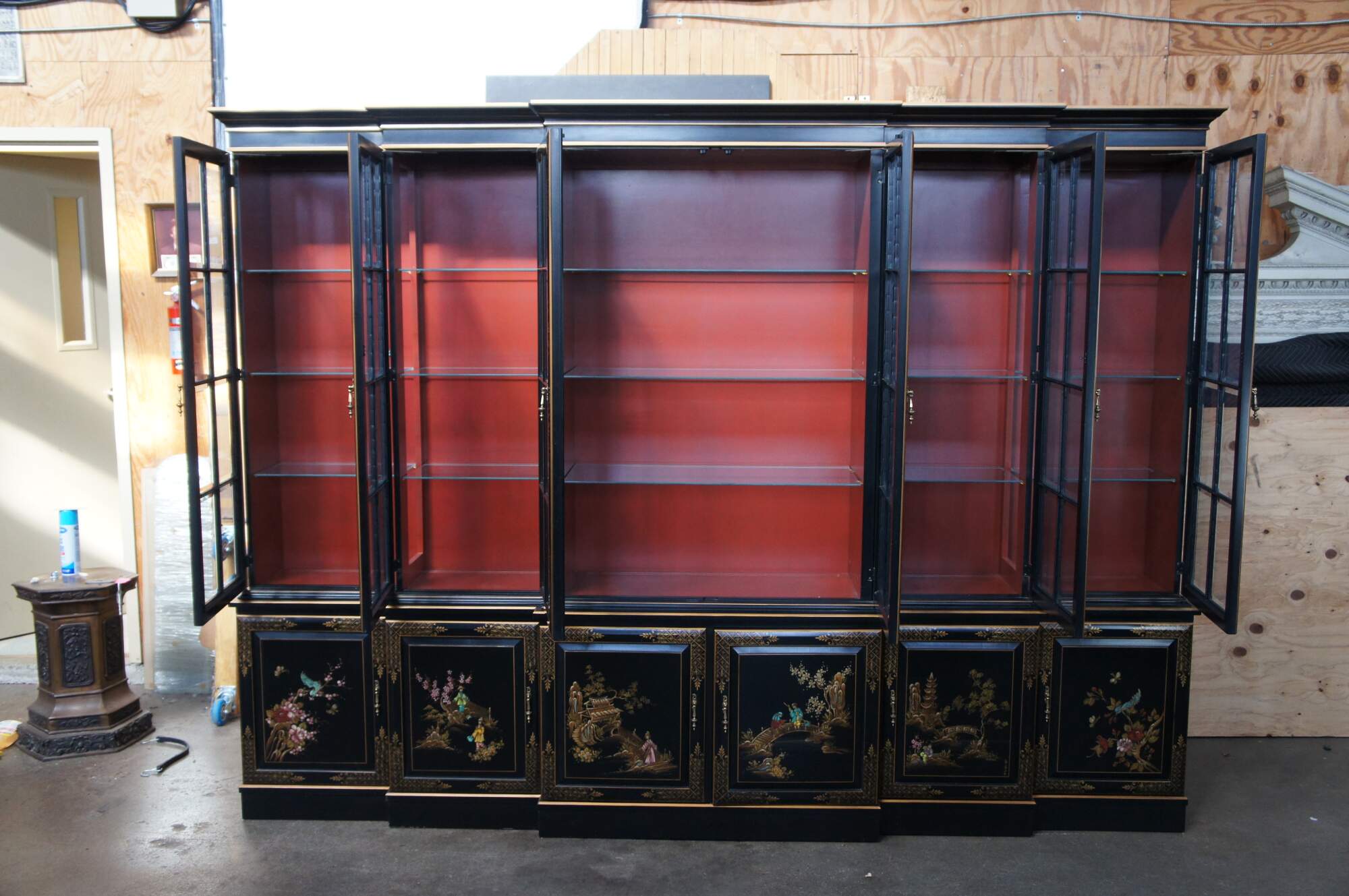 The Union National breakfront was rated as the finest breakfront in the world. In 1980, after flying in the magazines Lear jet to inspect the factory and the breakfront, the publisher of Leaders magazine rated it as the finest available anywhere in the world. If you've never heard of Leaders magazine, don't be surprised because if you aren't one of the worlds leaders, you can't even buy a copy. Built of solid maple and finished in hand rubbed black lacquer with 42 panes of hand beveled glass. The interior is painted in chiense red to contrast with the exterior and show off whatever is showcased within. The whole piece is hand striped in gold with snowflakes, fretwork and scrolls on each panel. To top it off Chinoiserie landscape designs were then hand painted on each door with birds, butterflys, flowers, figures / geishas and pagodas. Hand Signed along the lower right door by the artist Delores Dimas. Union National made fewer than 20 of these breakfronts per year while they were in business and even if 2 were ordered with the same description, each would be unique because the artwork was always original
