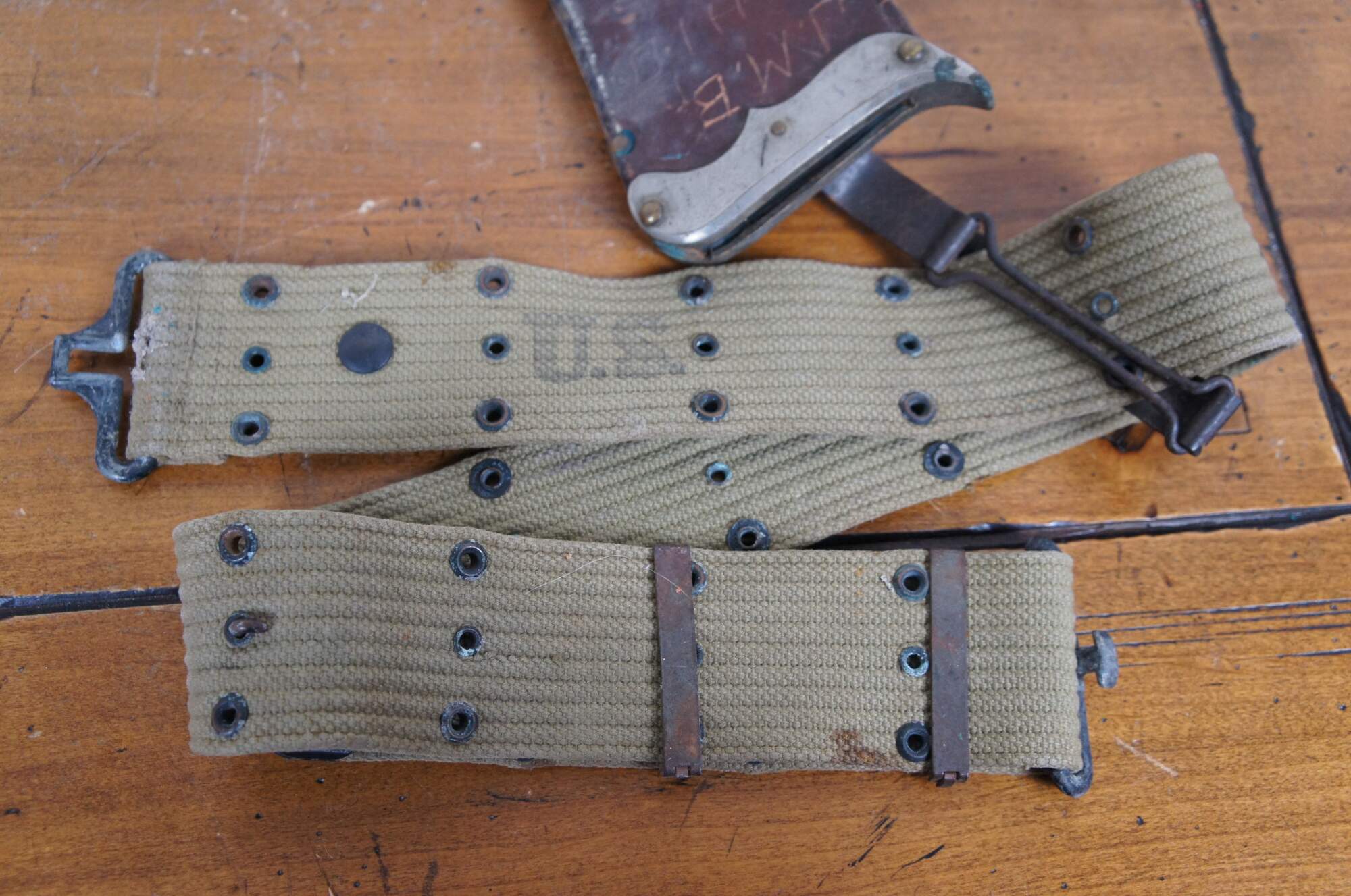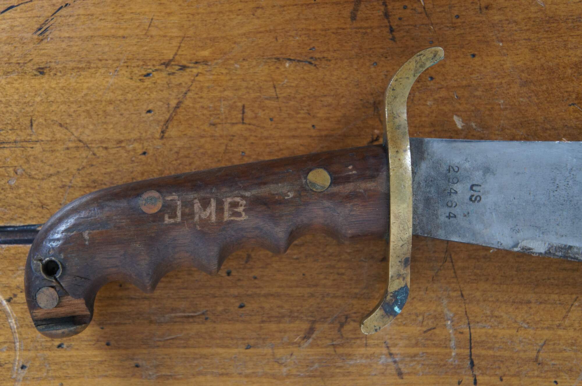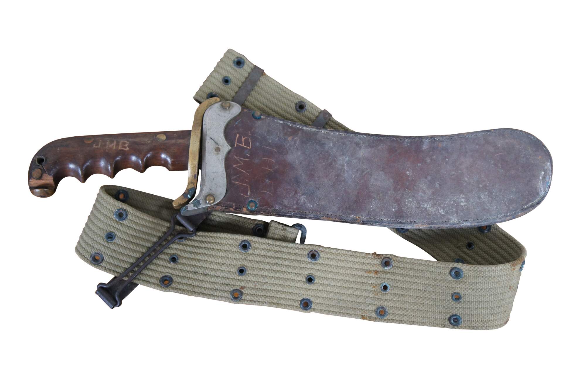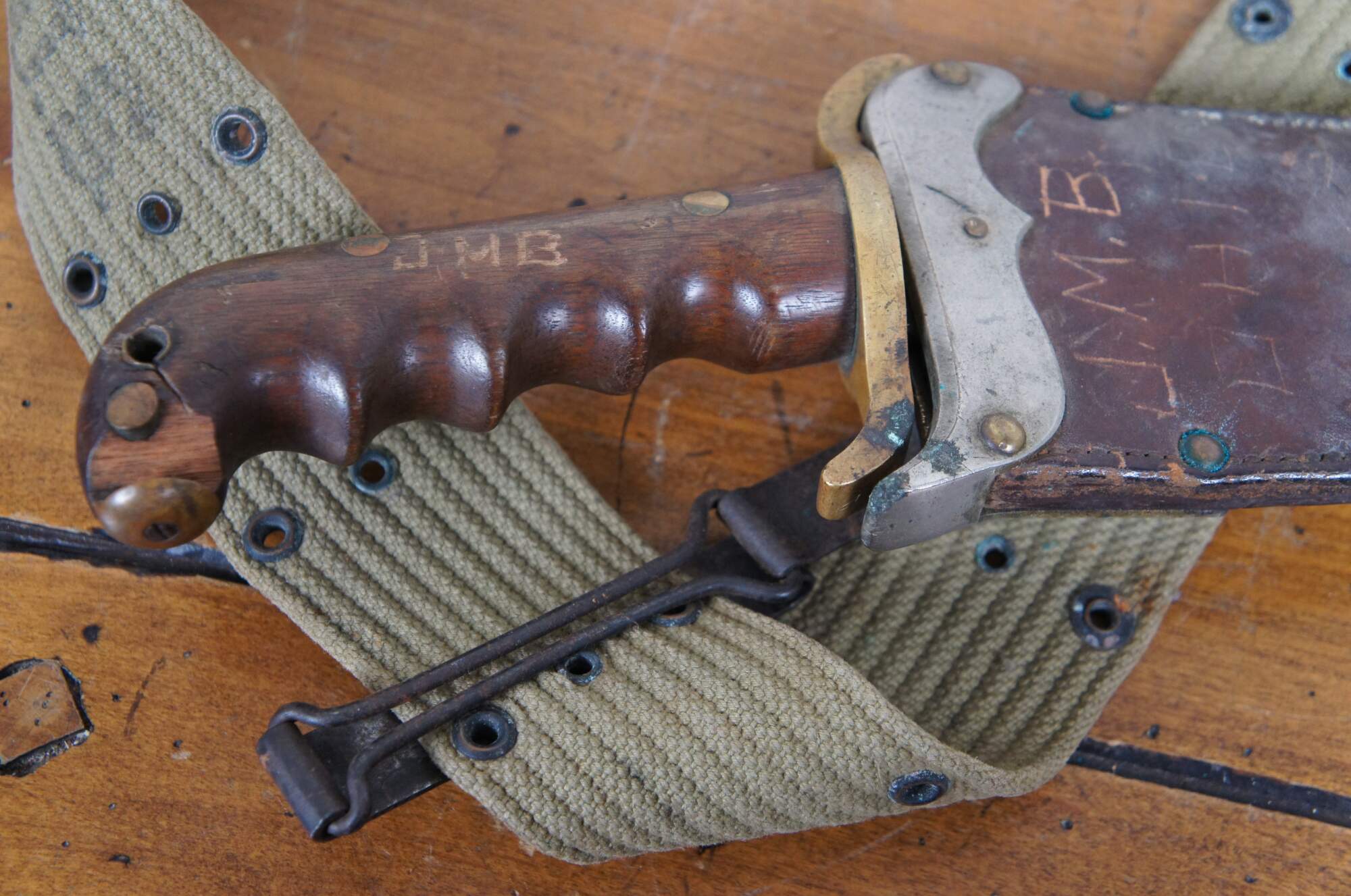 Antique World War I M-1904 US Hospital Corps bolo / machete / knife. Heavy duty, bolo style, round tipped blade. Recurved brass handguard and walnut scales / grip with finger grooves, brass rivets and hole for lanyard loop. Grip is stamped / impressed with the number 11 near the guard and Ryan along one side; the opposite is crudely engraved with the initials JMB. Obverse of blade marked US over serial number 29464. Reverse of blade marked SA (Springfield Armory) over Flaming Ordnance Bomb acceptance stamp and the year, 1912. Brown leather scabbard with brass top and krang style belt hanger; crudely etched with "JMB Ohio." Includes khaki cotton canvas pistol belt.