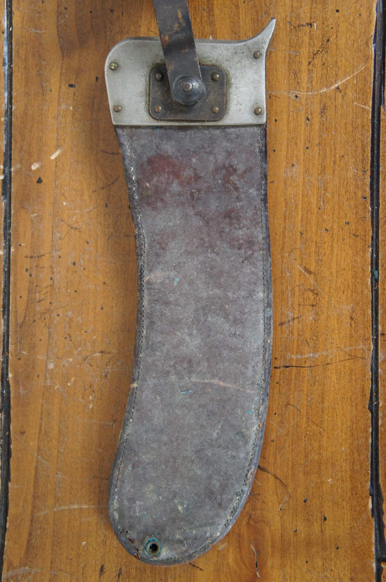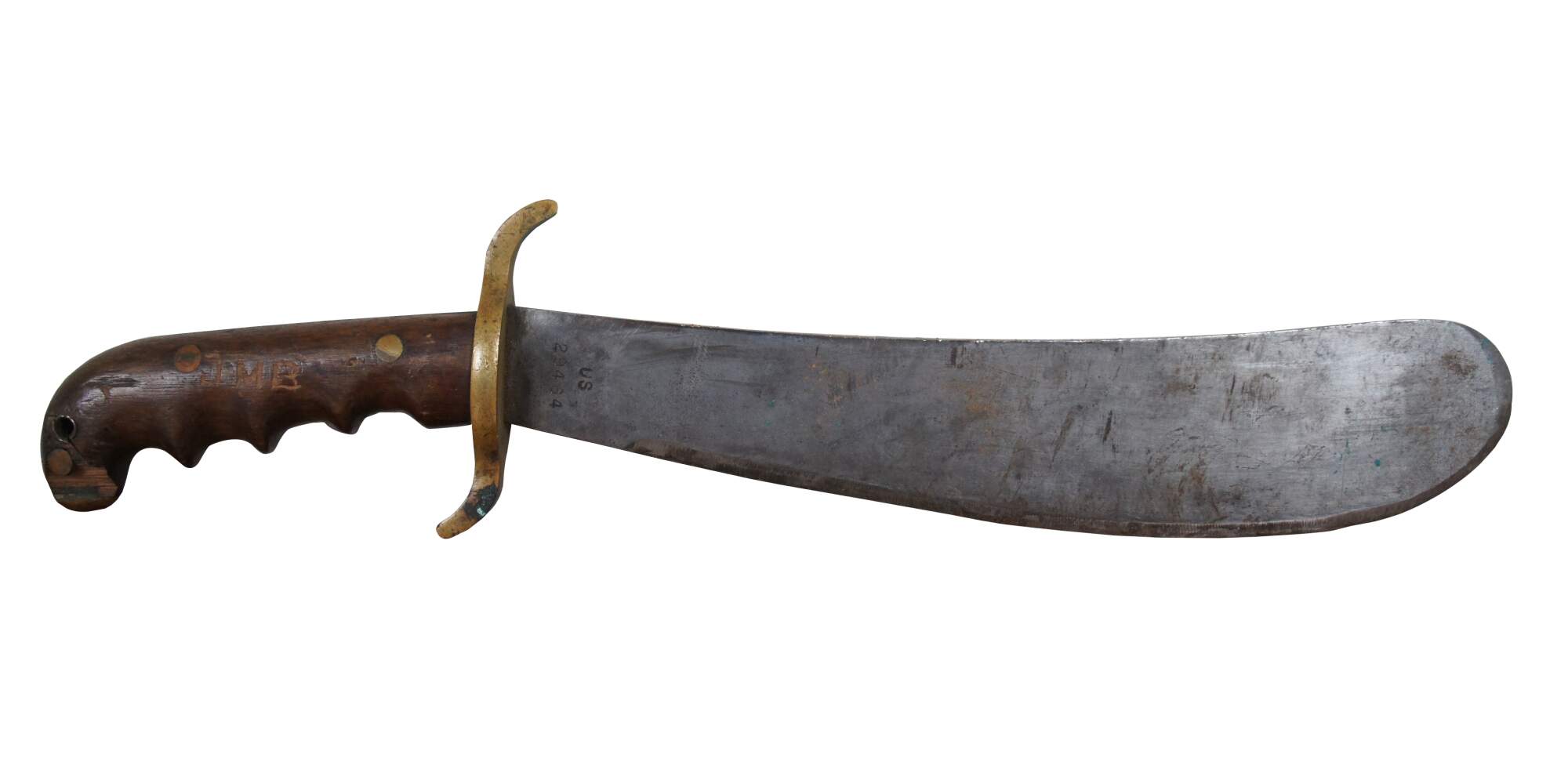 "The M-1904 was adopted by the US military in 1904, and all of the bolo style knives were manufactured at Springfield Armory, in Springfield, MA. During the production run from 1904 to 1914, some 40,000 Hospital Corps Knives were produced at Springfield. The M-1904 was the first widely issued medical department knife. They were designed for use in clearing brush, cutting field expedient splints, and in some cases, stretcher poles. It was a simple utility machete for the medical corpsman to use. The knives were heavy duty with a 12” long rounded tip bolo style blade that was 2 ““ wide at the widest point and 3/8” thick. The bolo knife had an overall length of 17 “. The knives had a re-curved brass handguard and two piece walnut scales (grip panels), which had 4 finger grooves and Mameluke style curved pommel cap. The scales were secured to the tang by three large brass rivets, and a hole for a lanyard loop was in the pommel cap. The knives were marked U.S. on the obverse ricasso, over a serial number. The reverse ricasso was marked with the Springfield Armory mark, over a Flaming Ordnance Bomb acceptance stamp, over the year of manufacture. The knives were issued with a heavy-duty leather scabbard with a large brass throat. The majority of the scabbards had metal, Krag bayonet style metal belt hangers, but some of the early knives were issued with scabbards that had a simple leather belt loop." (Source: College Hill Arsenal)
