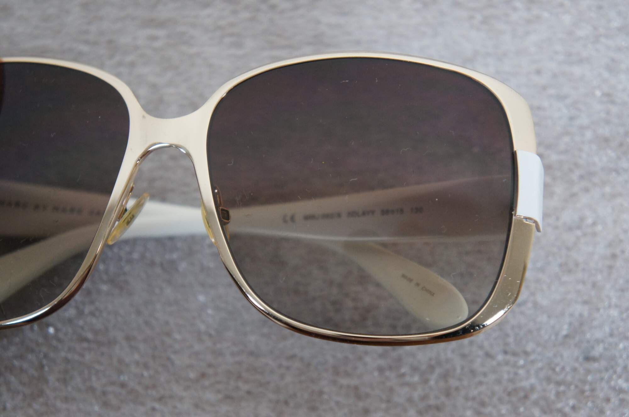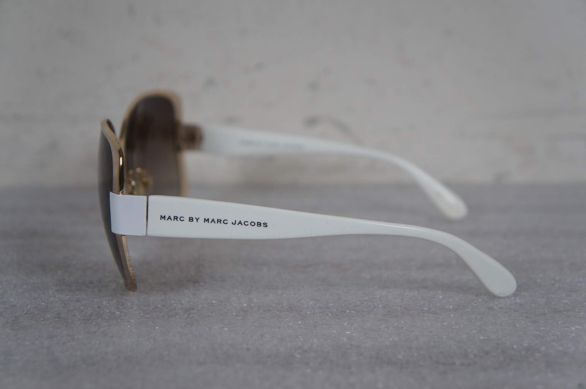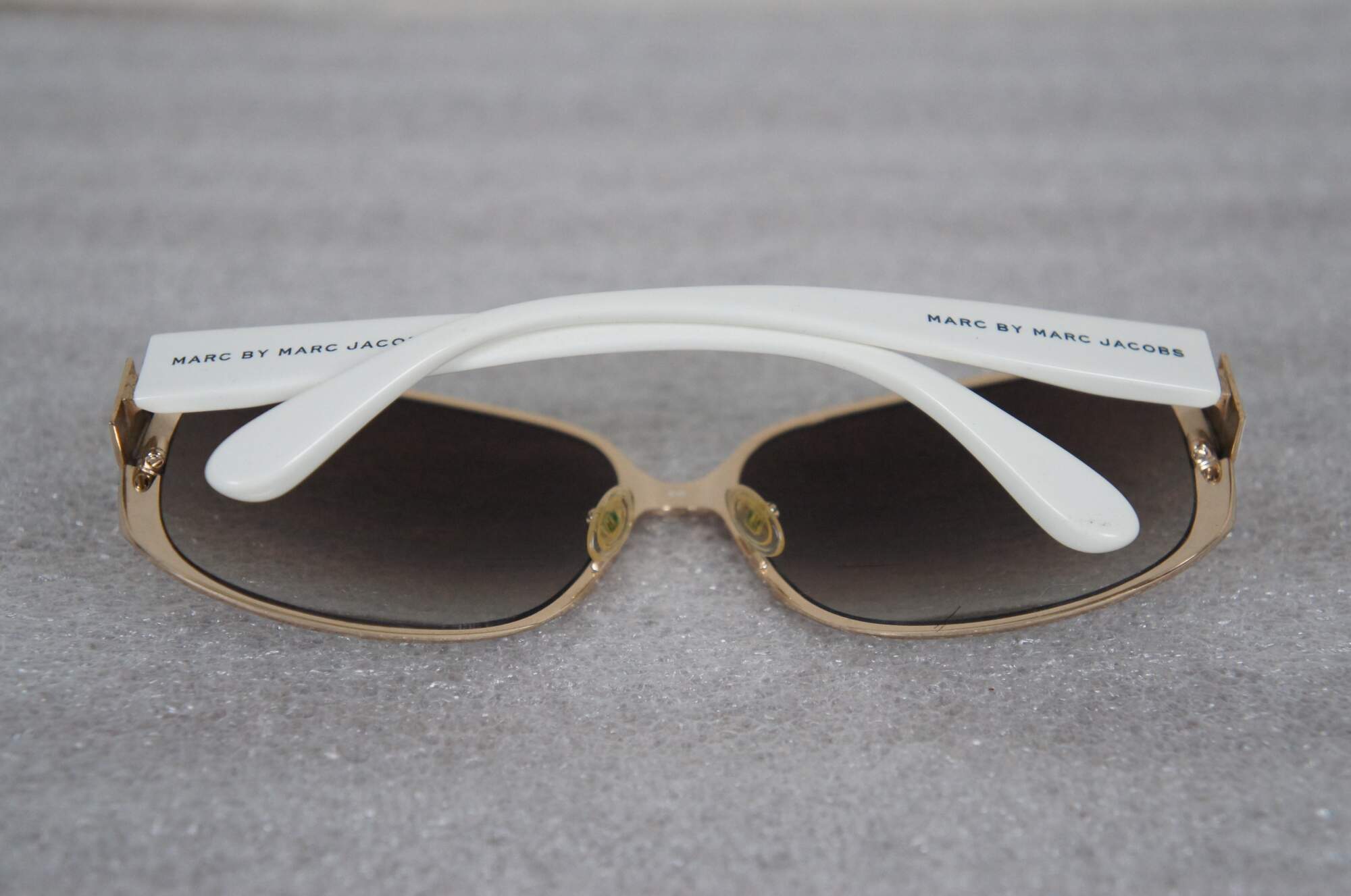 Marc by Marc Jacobs MMJ082/S ladies oversized sunglasses in white and gold. 0DLAYY - 59 15 - 130 - 8-10. Made in China. Includes black pleather demi-lune hard case.