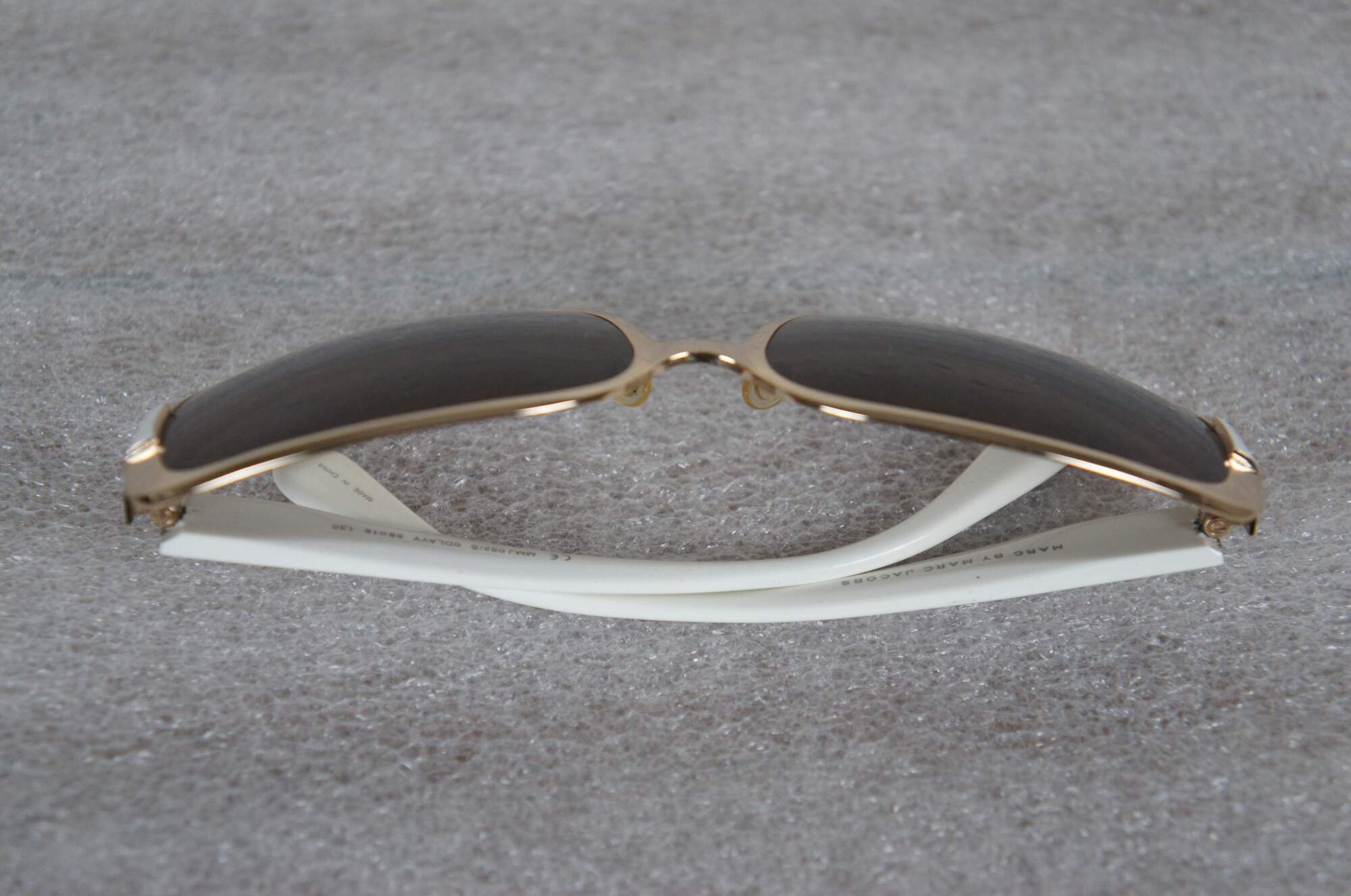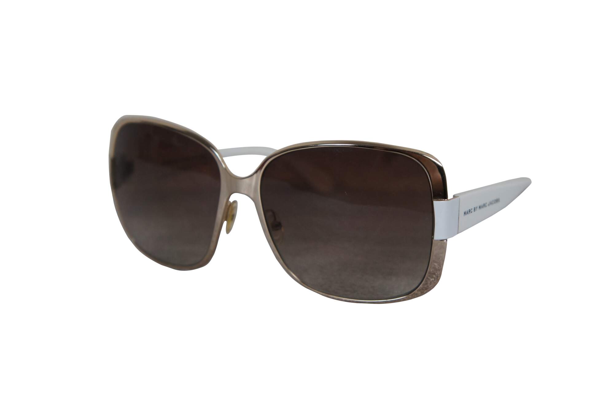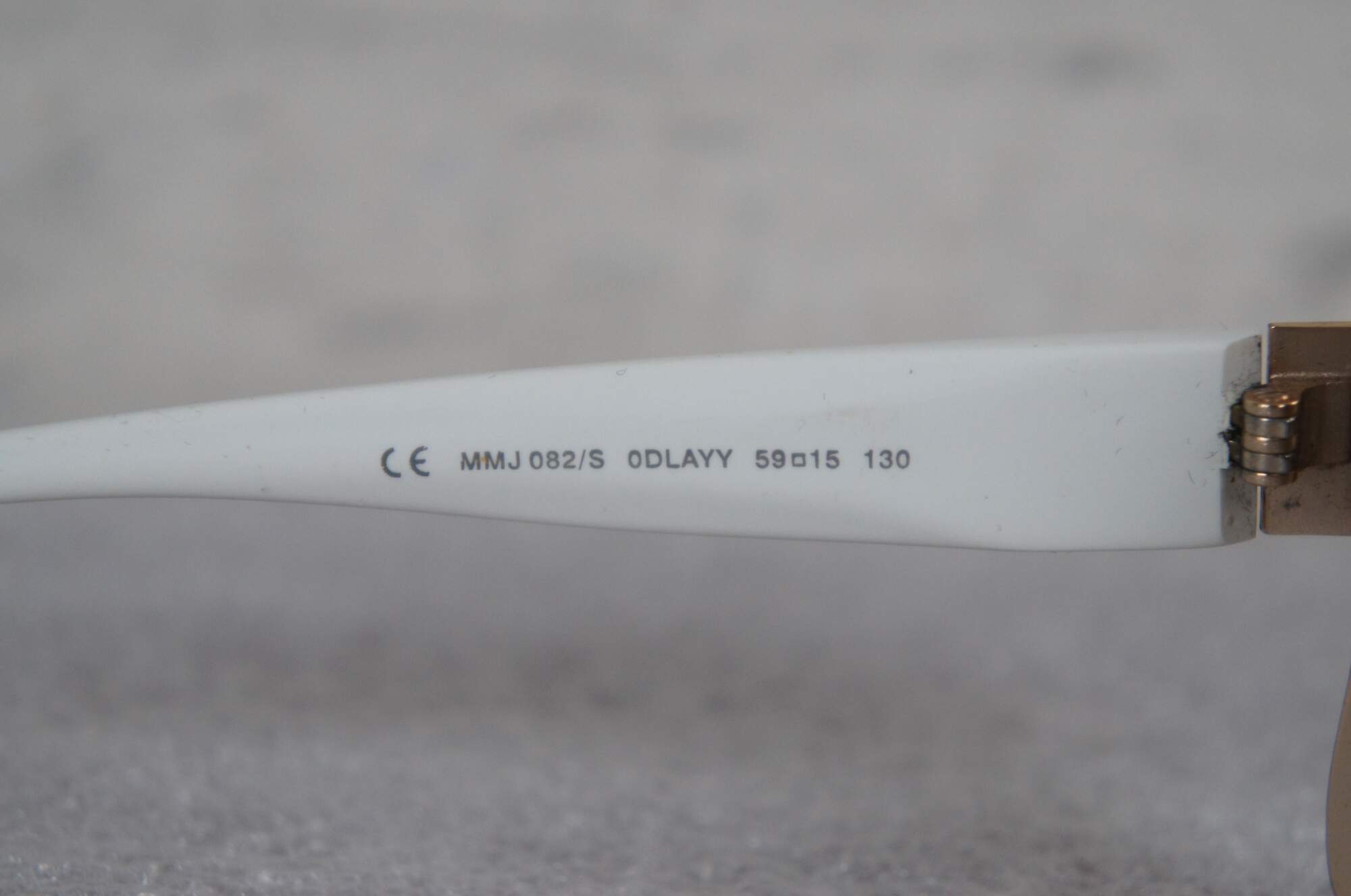 Marc by Marc Jacobs MMJ082/S ladies oversized sunglasses in white and gold. 0DLAYY - 59 15 - 130 - 8-10. Made in China. Includes black pleather demi-lune hard case.