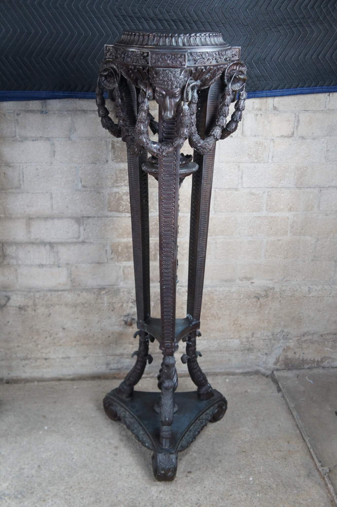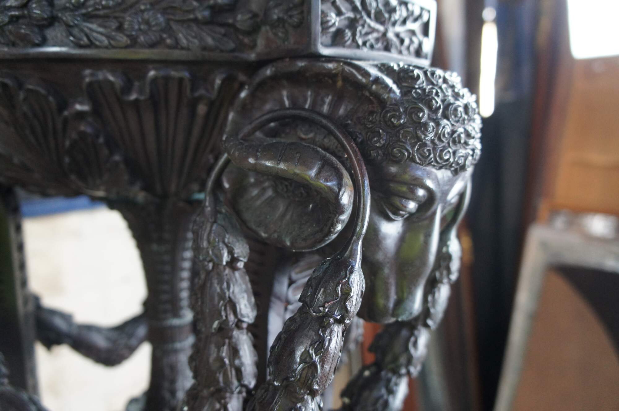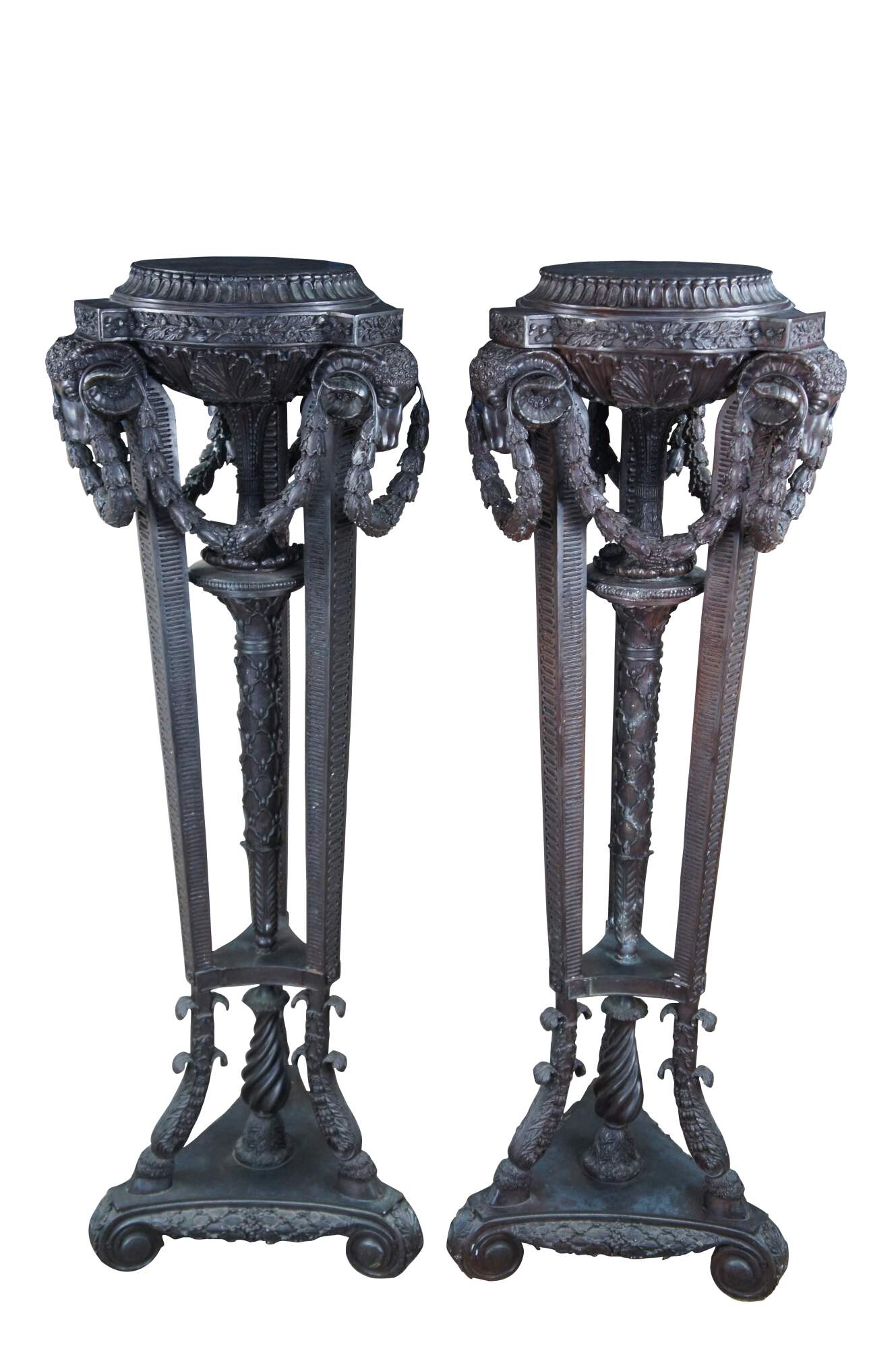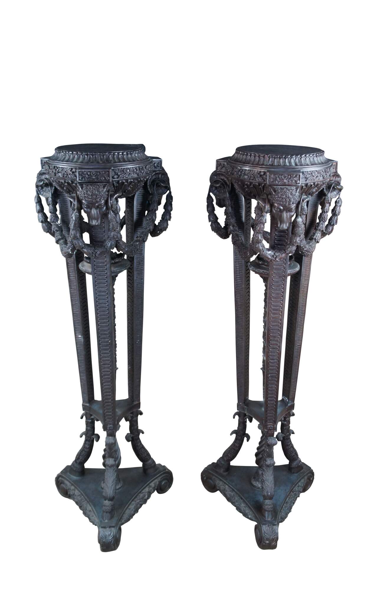 Monumental Pair of French Neoclassical Style Bronze Rams Head Sculpture Pedestals or Plant Stands by Metropolitan Galleries. Cast by the traditional, Lost Wax Bronze Casting method. This labor intensive and time consuming method of casting bronze statues, ensure pristine quality and vivid detail. Features intricate, hand forged details with a beautiful fire-applied patina. Each stand has a torchiere form with rounded top showcasing meticulous foliate and acanthus detail. Features three sculptural rams heads in a tripod stance over long tapered and ribbed supports leading to hoof feet over a scrolled platform base. Timeless craftmanship and design.