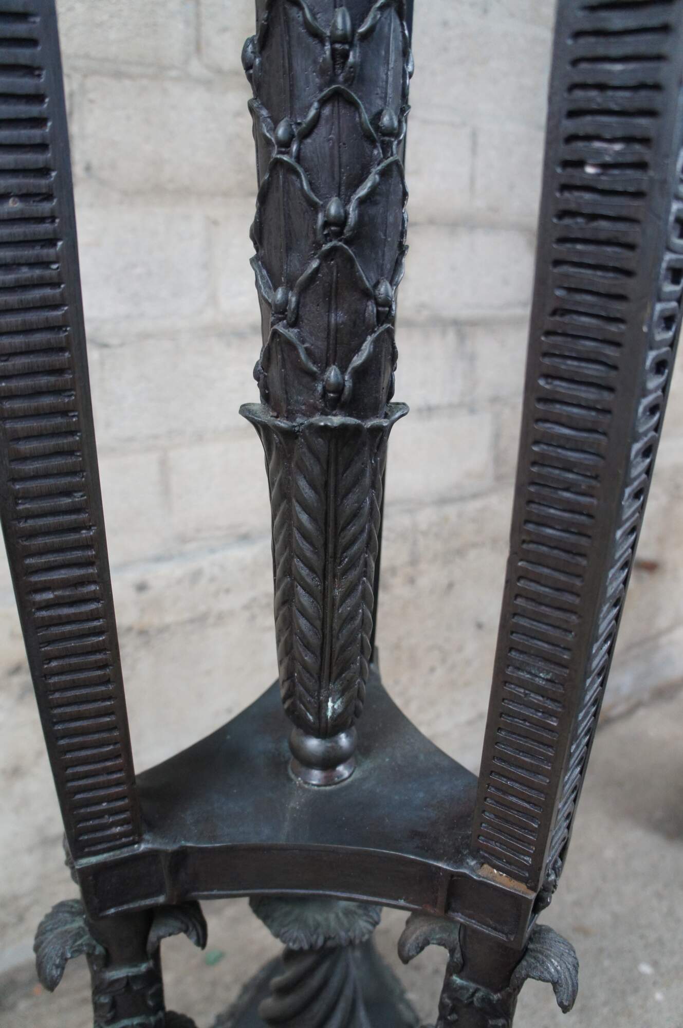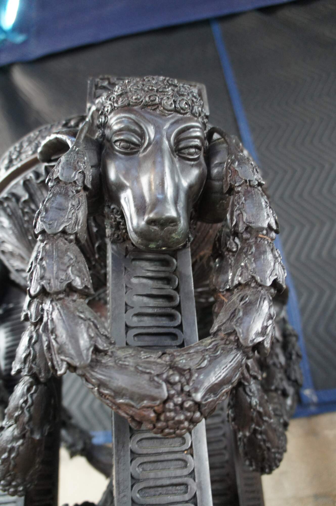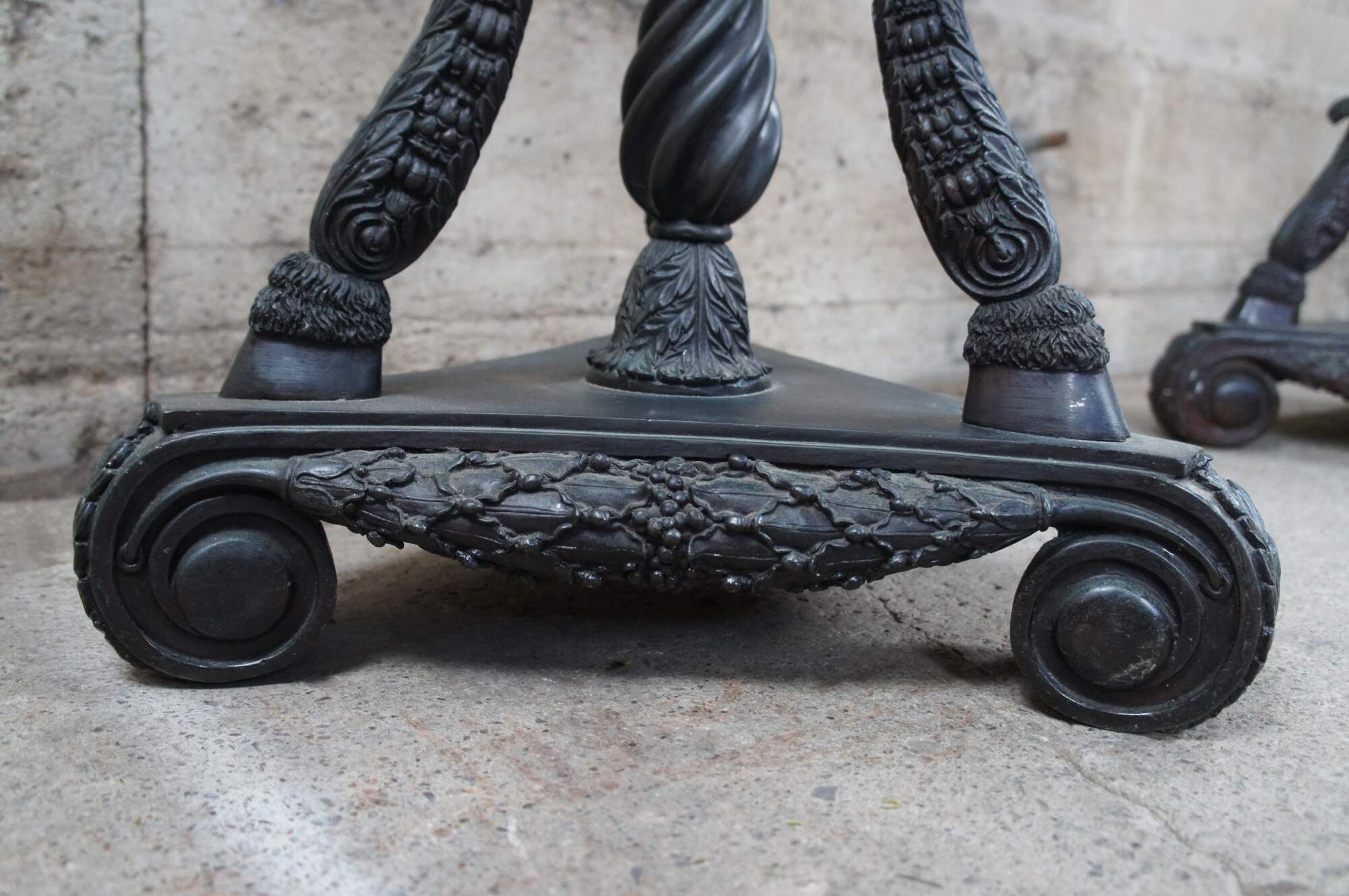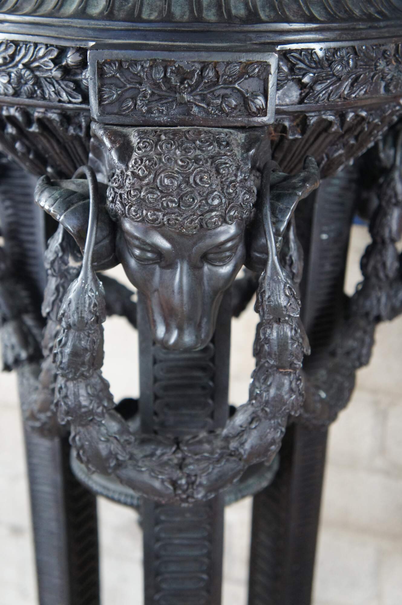 Monumental Pair of French Neoclassical Style Bronze Rams Head Sculpture Pedestals or Plant Stands by Metropolitan Galleries. Cast by the traditional, Lost Wax Bronze Casting method. This labor intensive and time consuming method of casting bronze statues, ensure pristine quality and vivid detail. Features intricate, hand forged details with a beautiful fire-applied patina. Each stand has a torchiere form with rounded top showcasing meticulous foliate and acanthus detail. Features three sculptural rams heads in a tripod stance over long tapered and ribbed supports leading to hoof feet over a scrolled platform base. Timeless craftmanship and design.