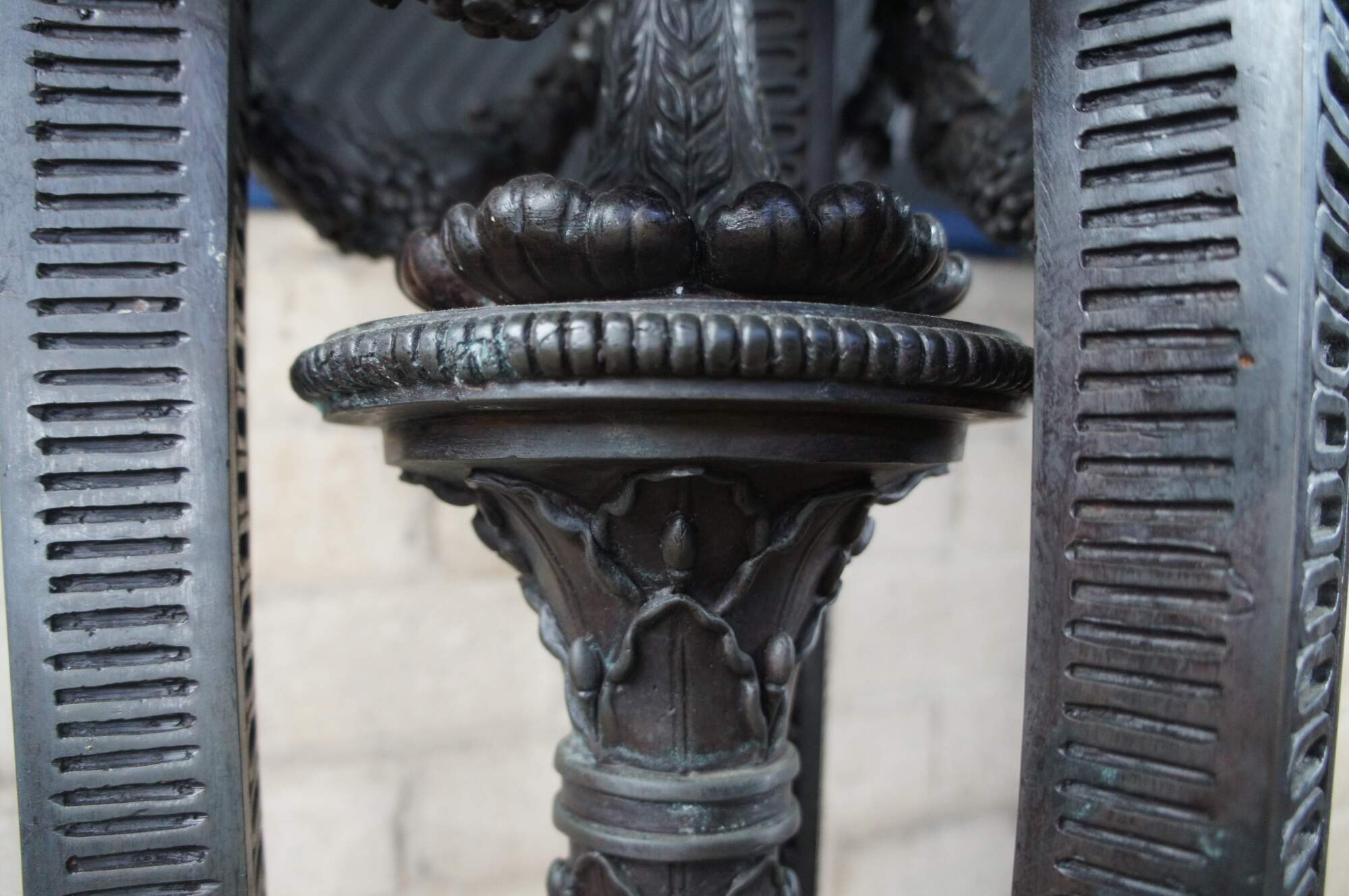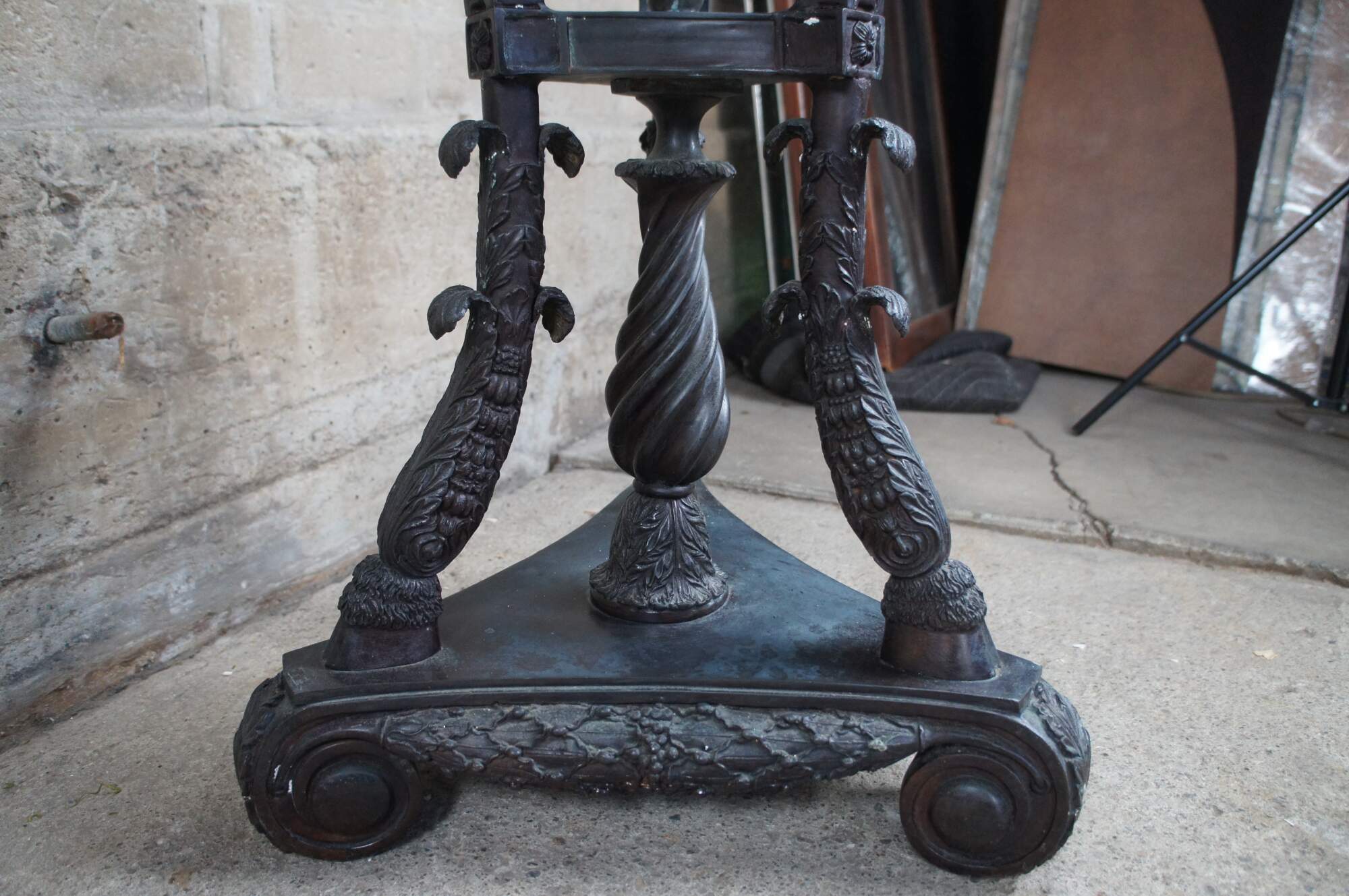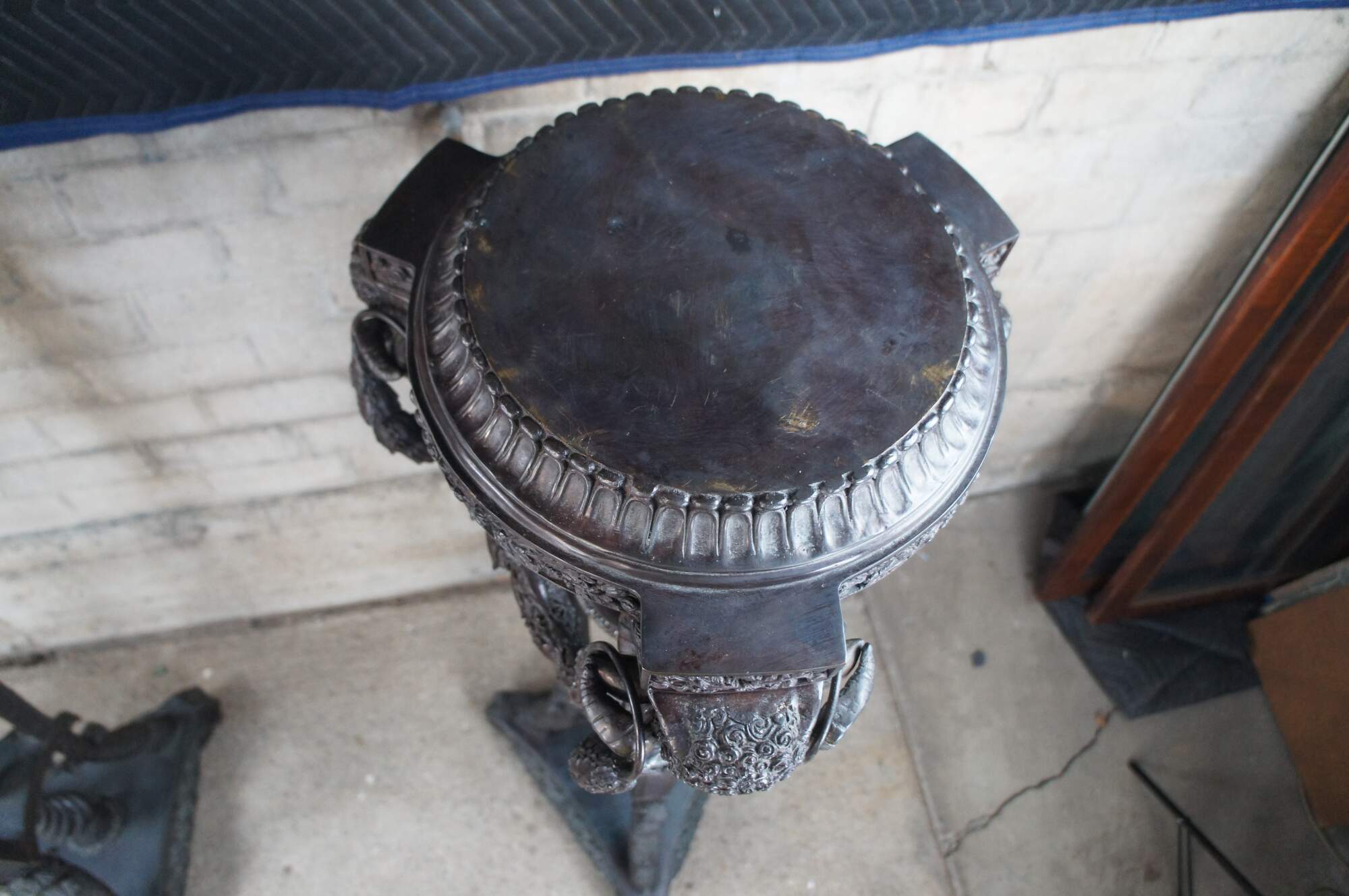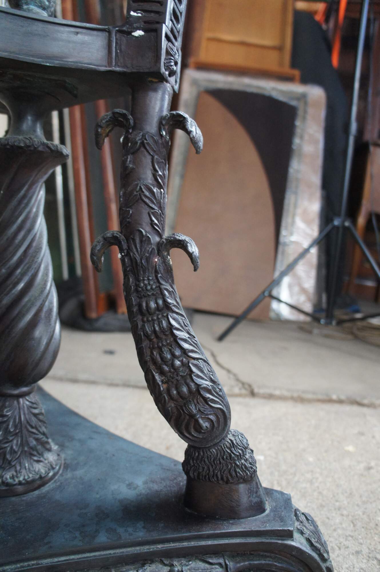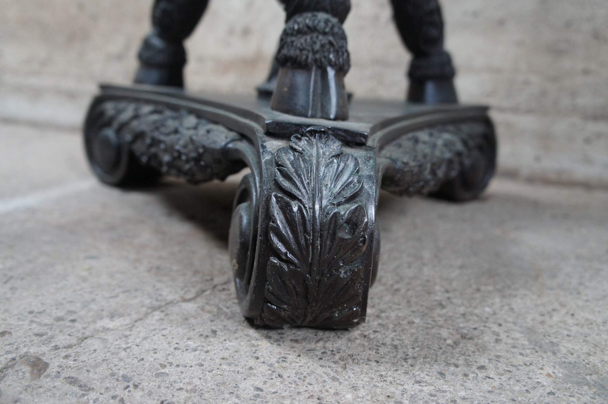 Monumental Pair of French Neoclassical Style Bronze Rams Head Sculpture Pedestals or Plant Stands by Metropolitan Galleries. Cast by the traditional, Lost Wax Bronze Casting method. This labor intensive and time consuming method of casting bronze statues, ensure pristine quality and vivid detail. Features intricate, hand forged details with a beautiful fire-applied patina. Each stand has a torchiere form with rounded top showcasing meticulous foliate and acanthus detail. Features three sculptural rams heads in a tripod stance over long tapered and ribbed supports leading to hoof feet over a scrolled platform base. Timeless craftmanship and design.