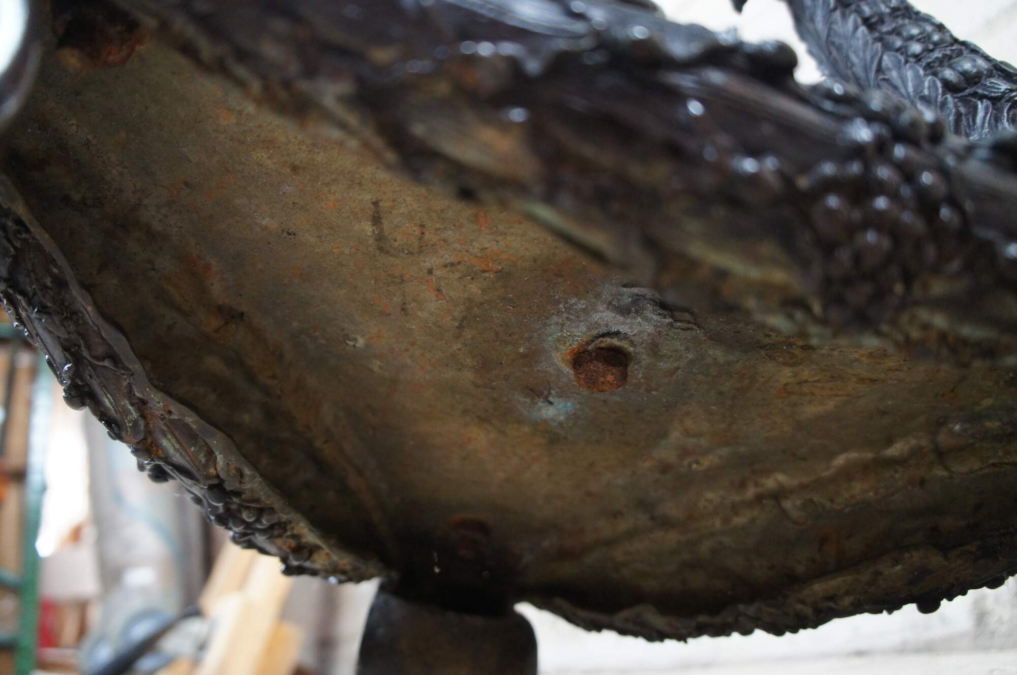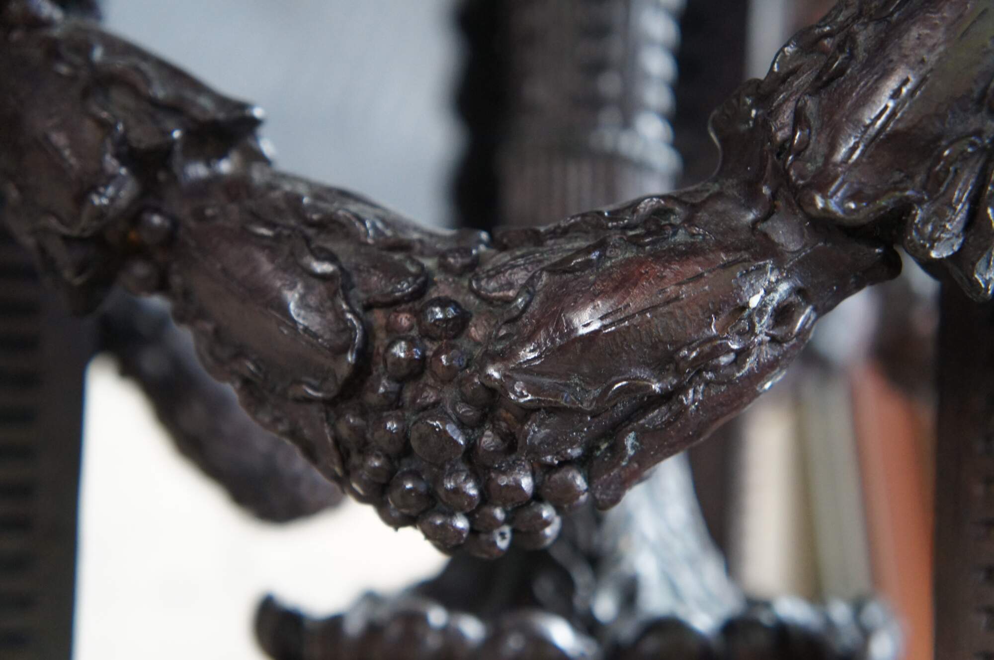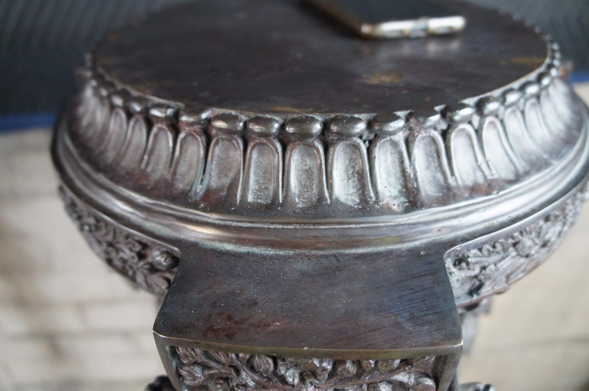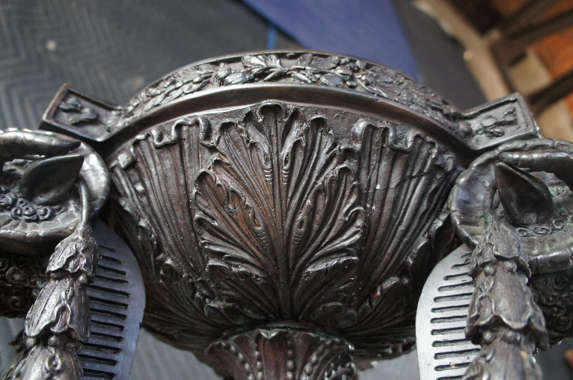 Monumental Pair of French Neoclassical Style Bronze Rams Head Sculpture Pedestals or Plant Stands by Metropolitan Galleries. Cast by the traditional, Lost Wax Bronze Casting method. This labor intensive and time consuming method of casting bronze statues, ensure pristine quality and vivid detail. Features intricate, hand forged details with a beautiful fire-applied patina. Each stand has a torchiere form with rounded top showcasing meticulous foliate and acanthus detail. Features three sculptural rams heads in a tripod stance over long tapered and ribbed supports leading to hoof feet over a scrolled platform base. Timeless craftmanship and design.