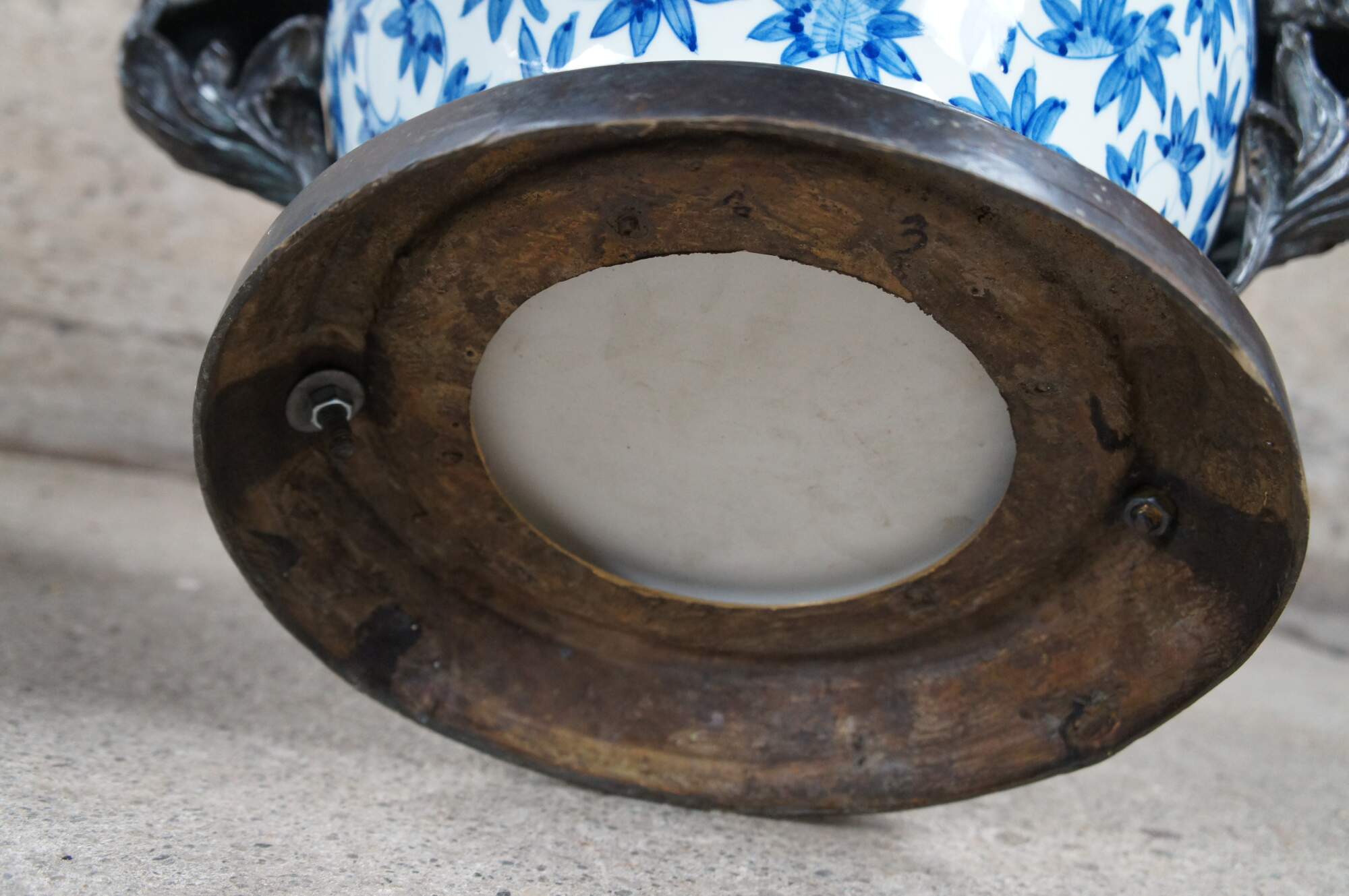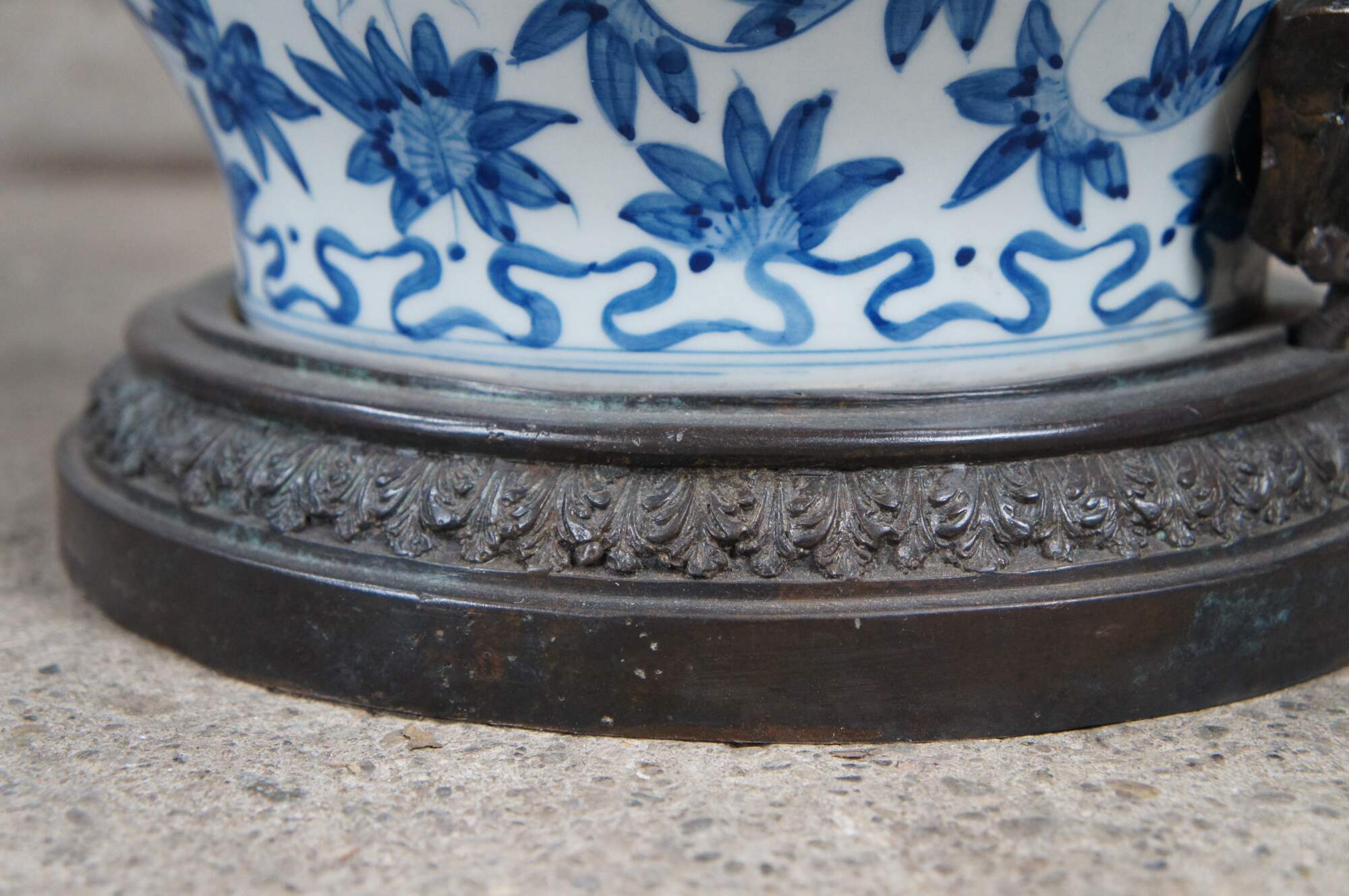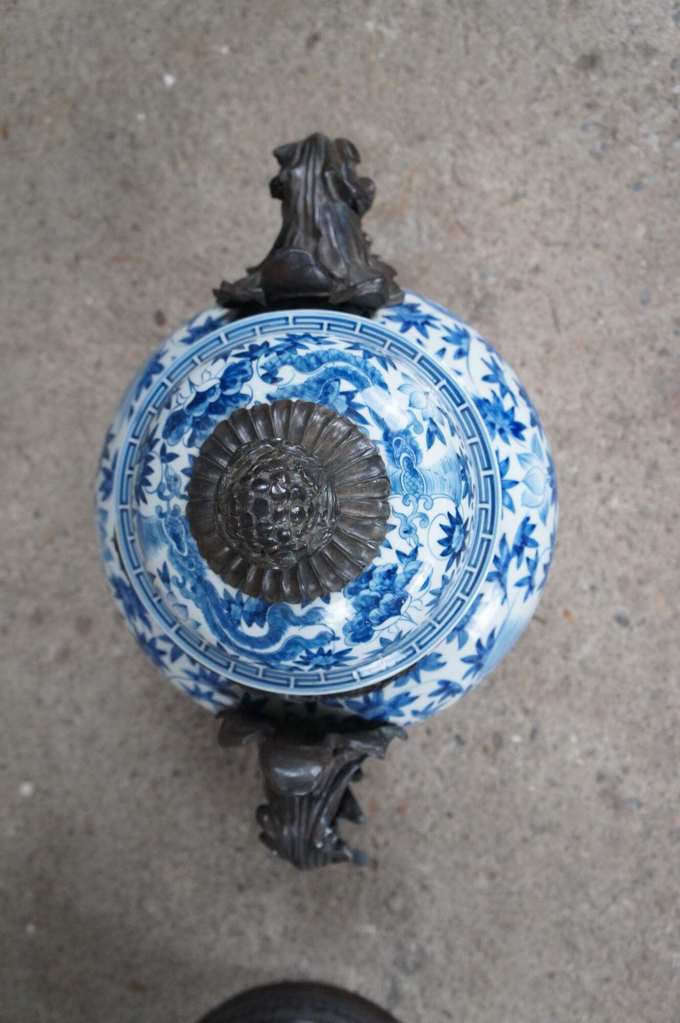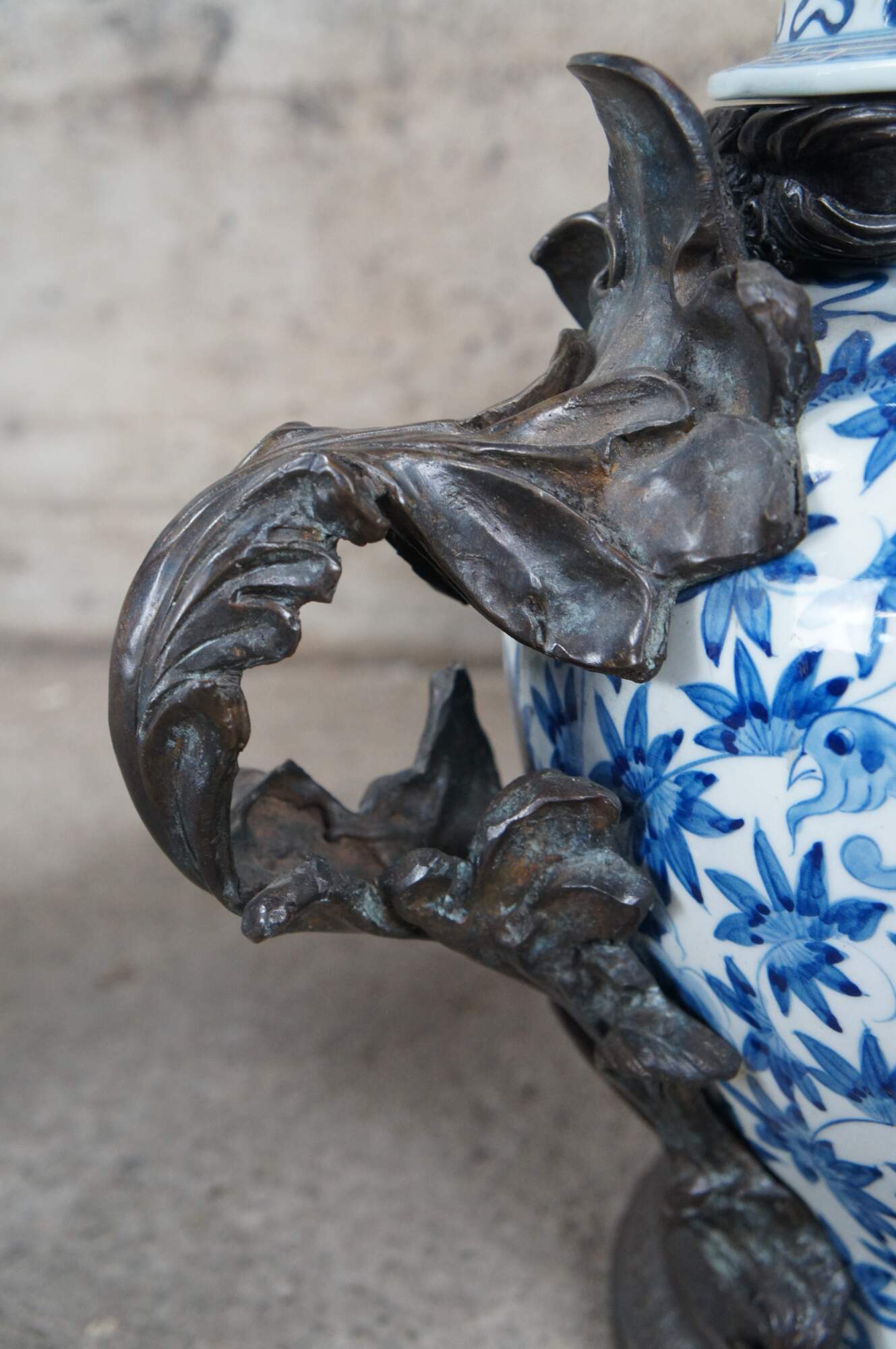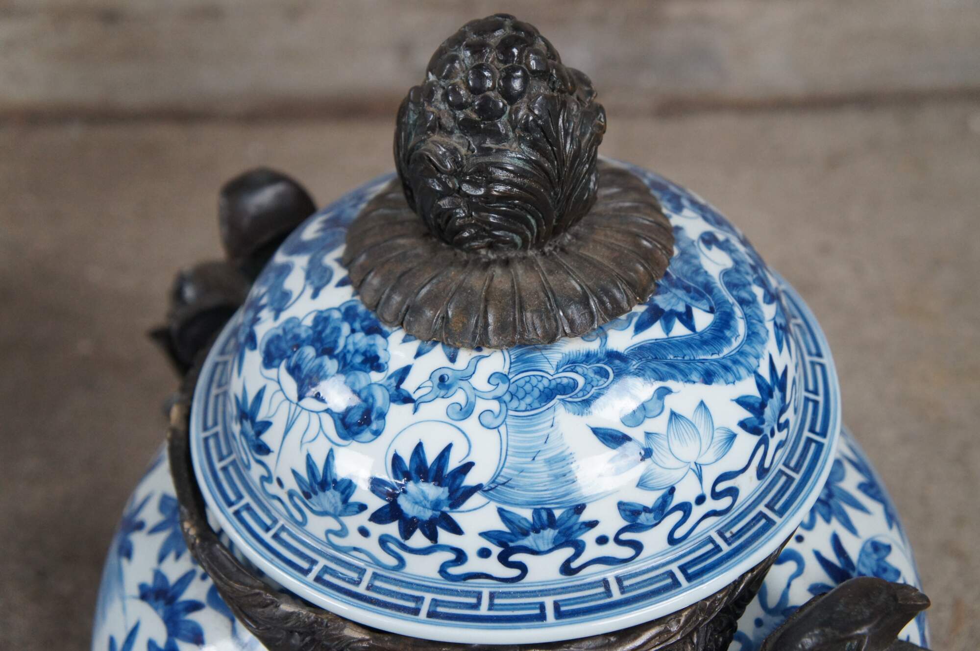 Pair of late 20th century Maitland Smith handled Ginger Jars or Urns. Made from porcelain with hand painted blue over white chinoiserie design featuring a phoenix amongst flowers with ribboned and Greek Key designs. Each jar is lidded with a pineapple finial and bronze mounted flowing foliate details. An exceptional pair that will display well in any space.