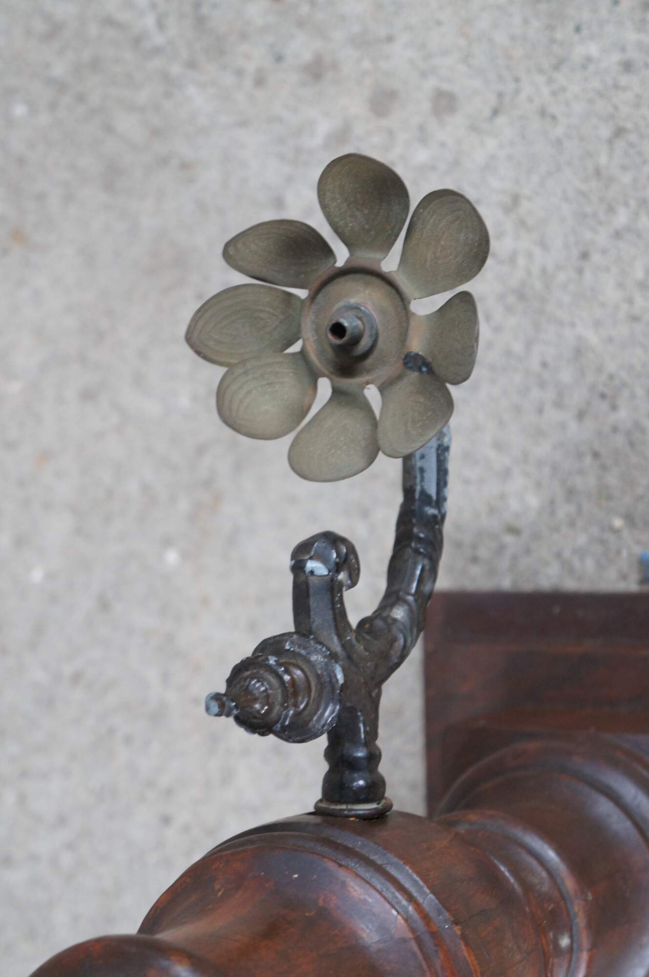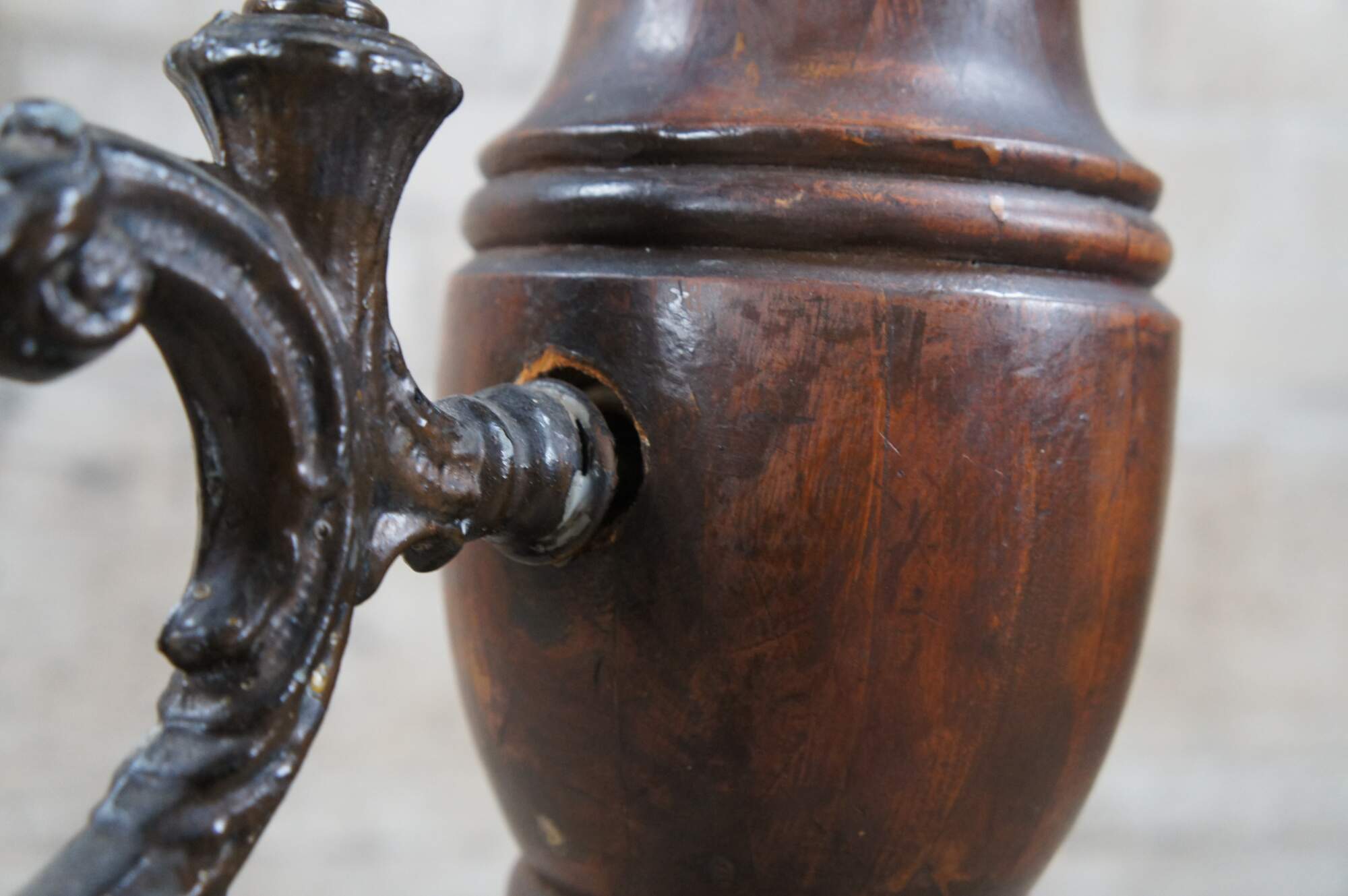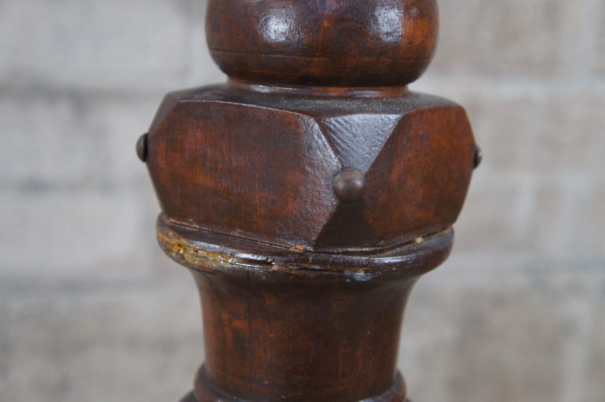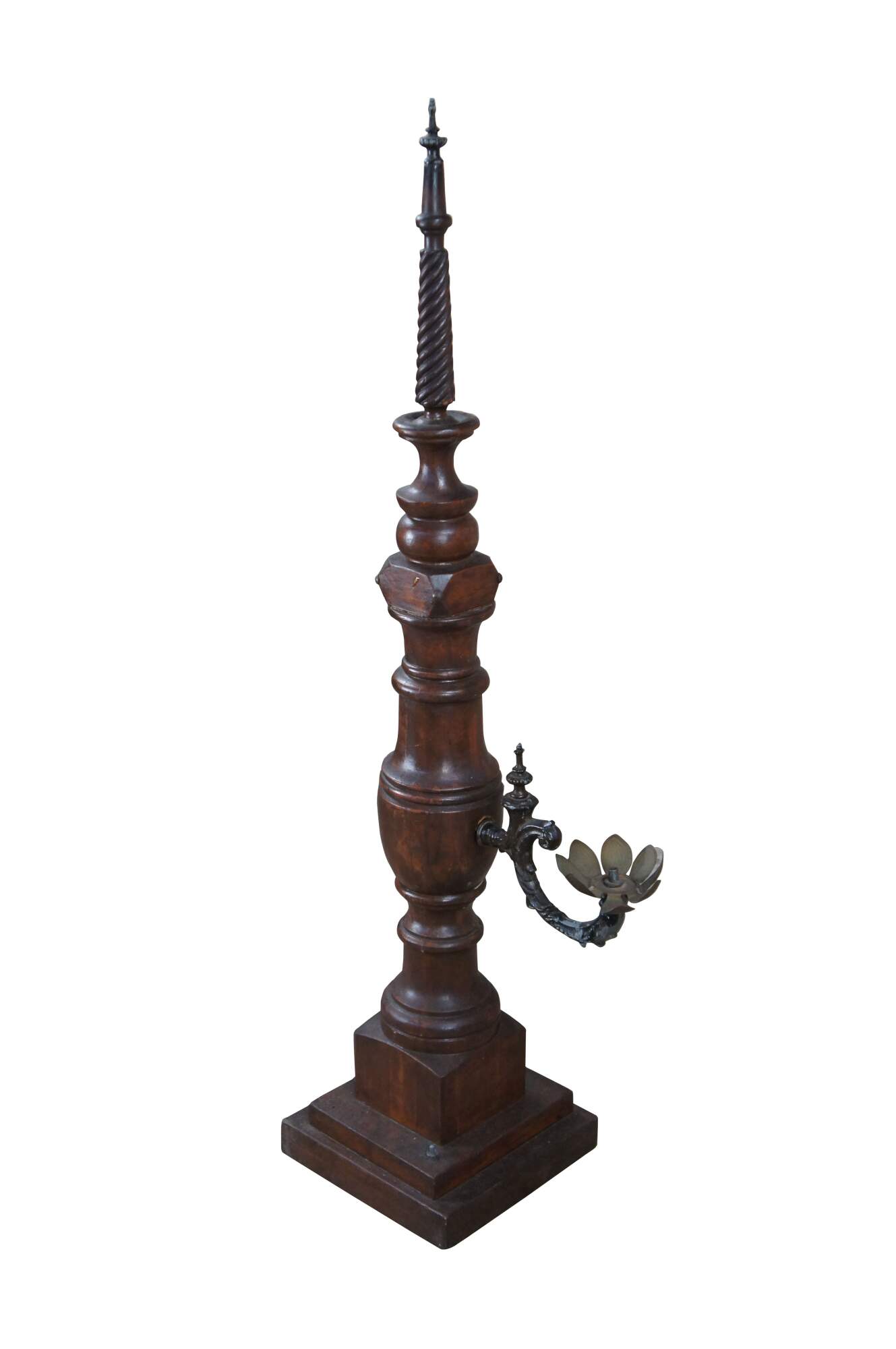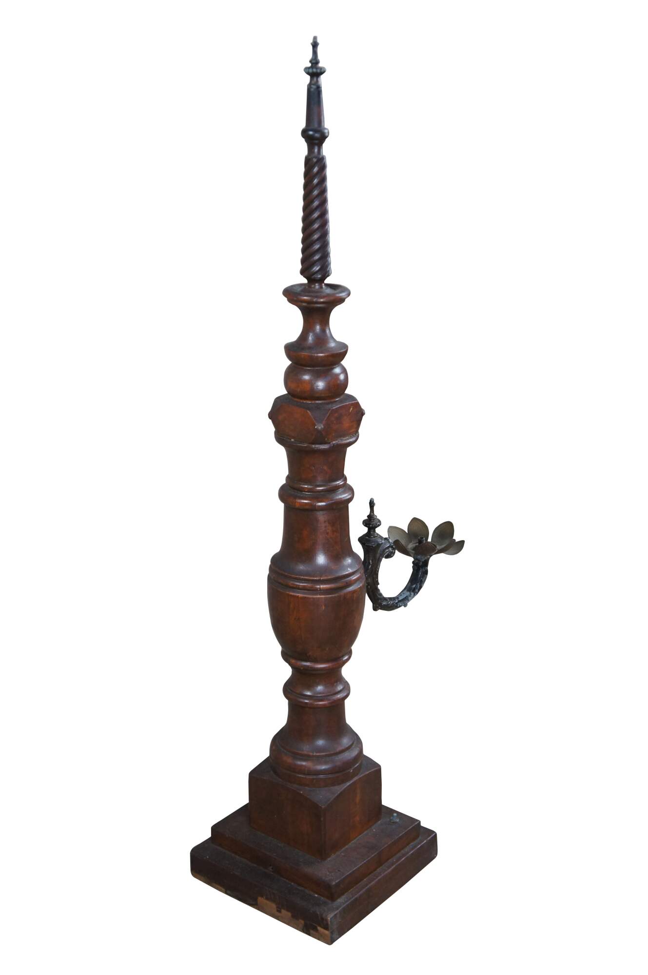 An old world turned wooden floor lamp. Features an iron candleholder that could be wired that was made to be wired for use as a lamp. A switch is mounted to the base. The columnar design has a barley twist support along the top.
