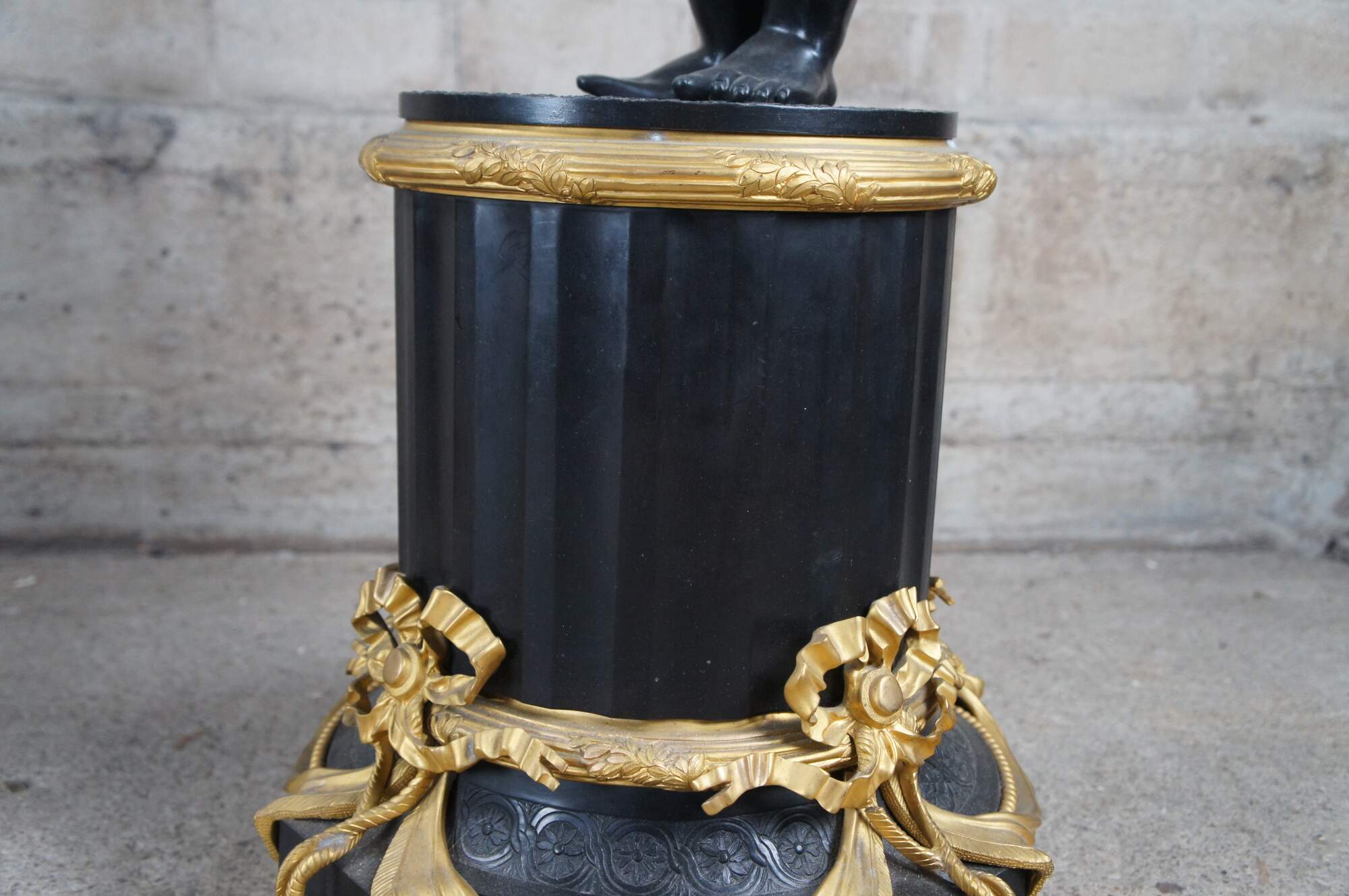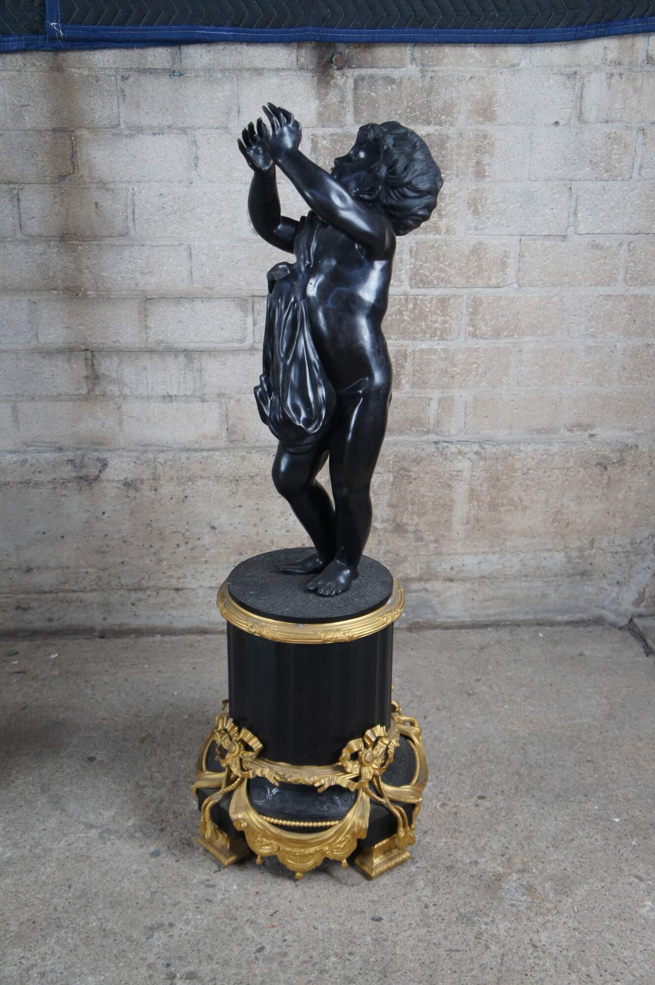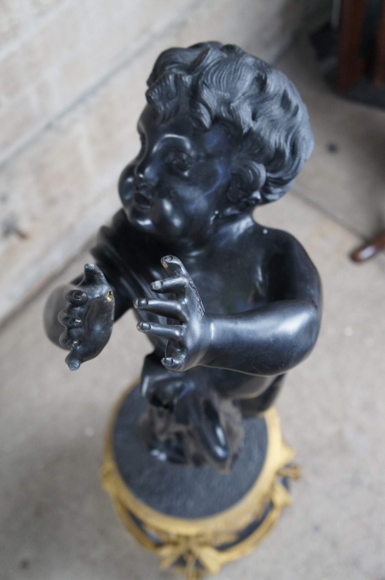 Pair of Monumental Italian Neoclassical Cherub Putti Sculptures, circa first half 20th century. Made from bronze with ebonized and gilt detail. Each raised over a classical fluted and footed column plinth with ornate ribboned swags. The cherubs are standing with their hands outstretched. They were originally holding golden torchieres which are no longer with them.