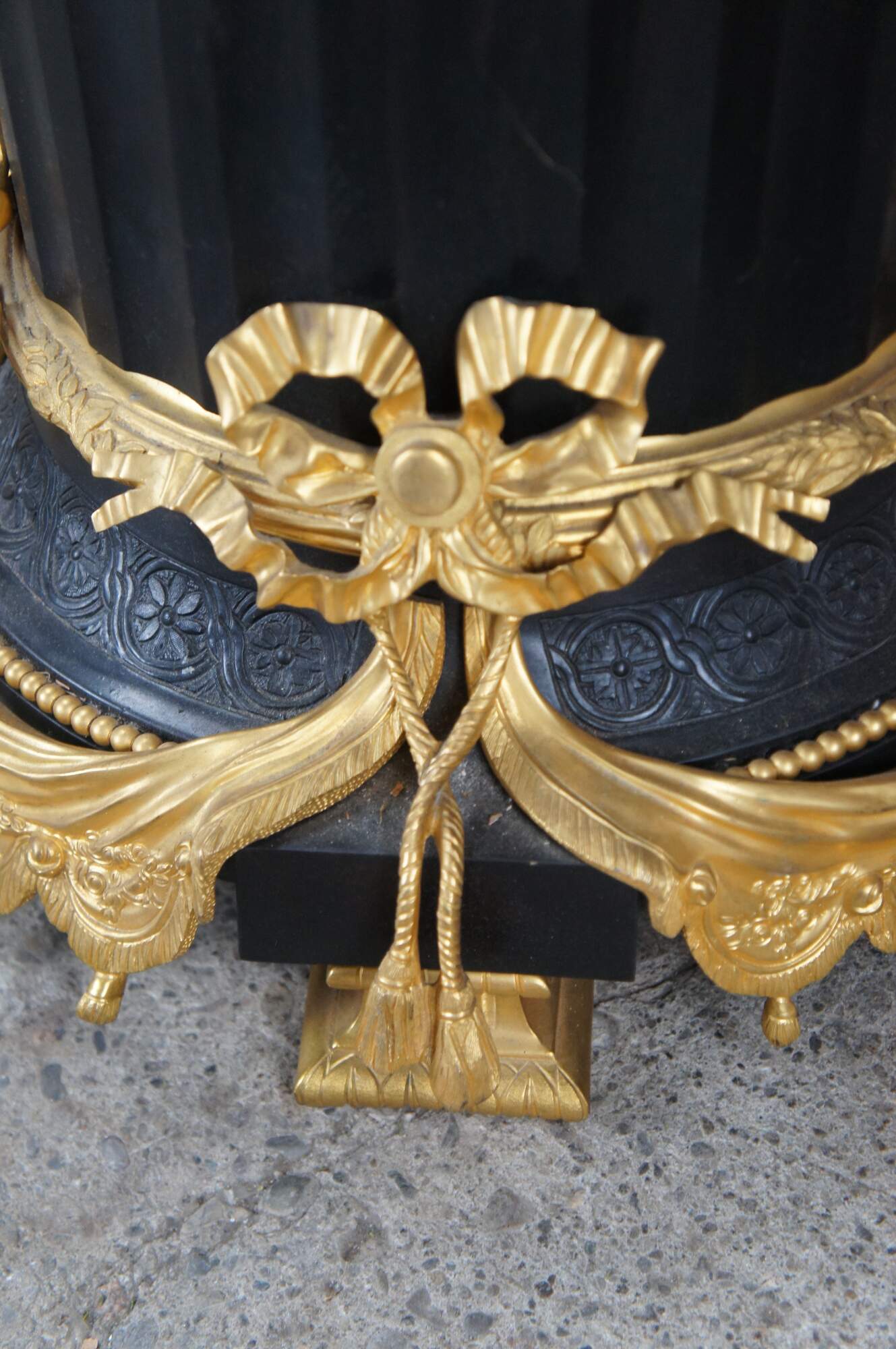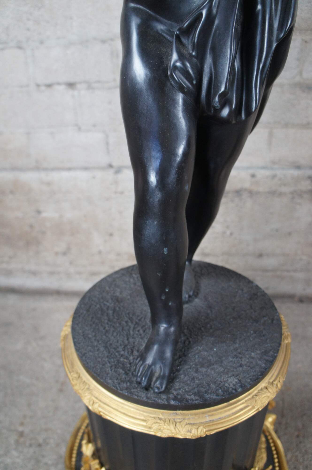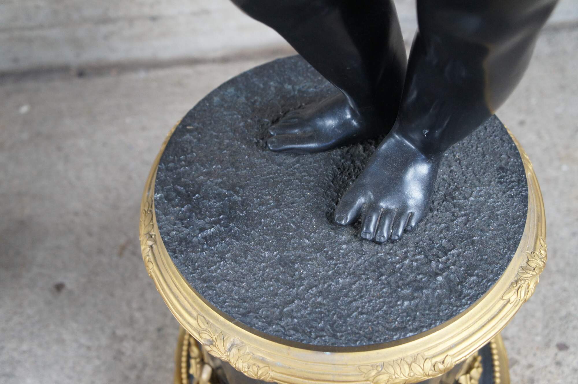 Pair of Monumental Italian Neoclassical Cherub Putti Sculptures, circa first half 20th century. Made from bronze with ebonized and gilt detail. Each raised over a classical fluted and footed column plinth with ornate ribboned swags. The cherubs are standing with their hands outstretched. They were originally holding golden torchieres which are no longer with them.