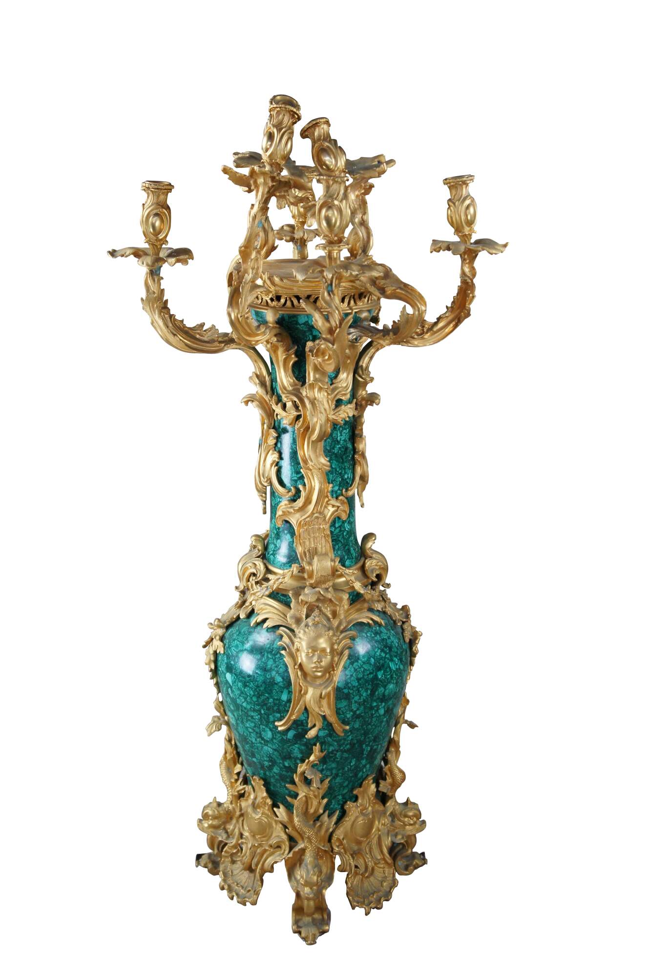 An elaborate monumental Baroque Rococo style vase and candelabra by Eric Stepniewski. Features a malachite stone vase wrapped in low relief chiseled 24k gold brass foliate with figural maidens mounted at the center and dolphin (Delphinius) feet centered around scalloped cartouches. The top of the vase showcases 7 outstretched candelabra.
