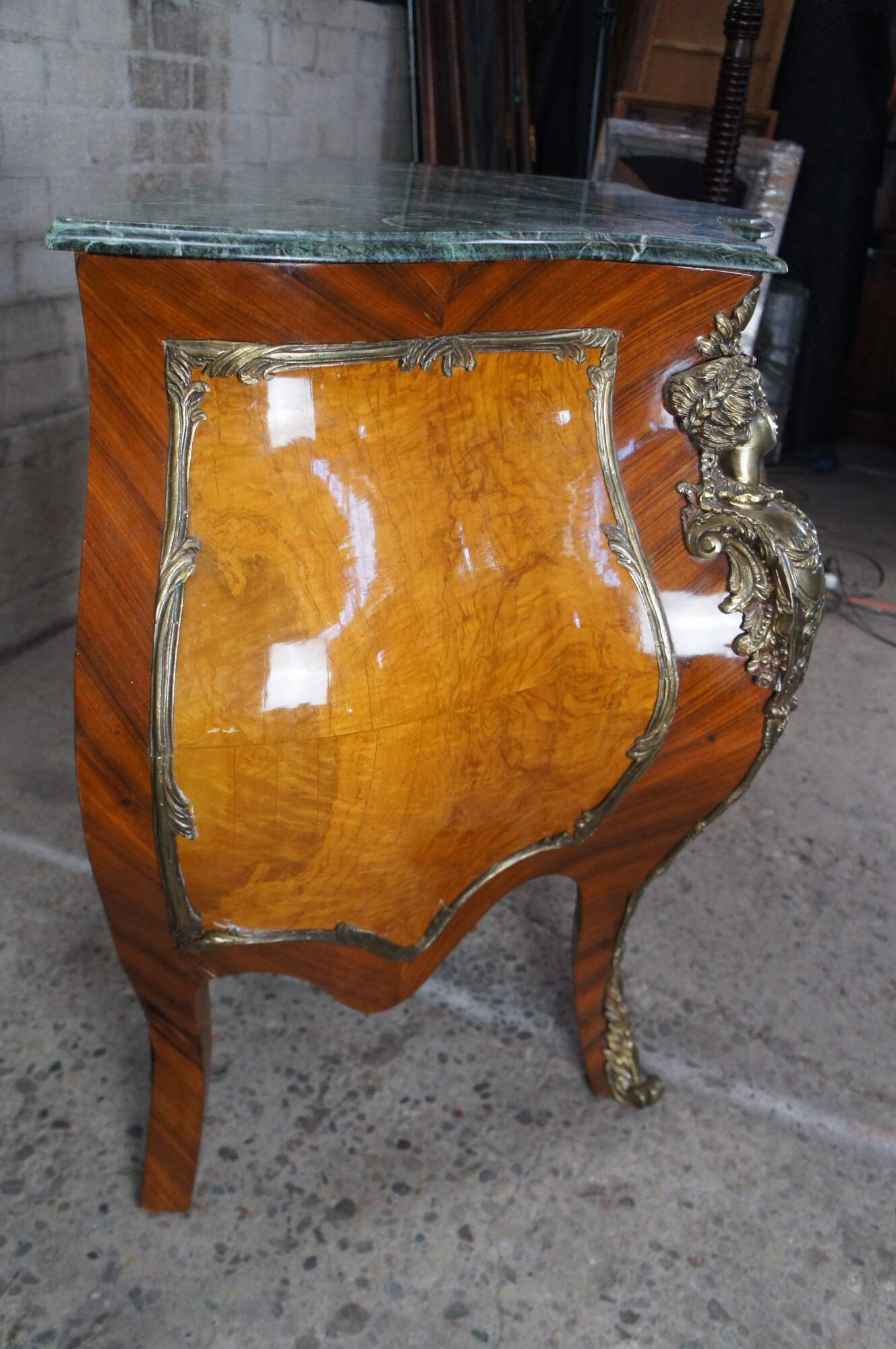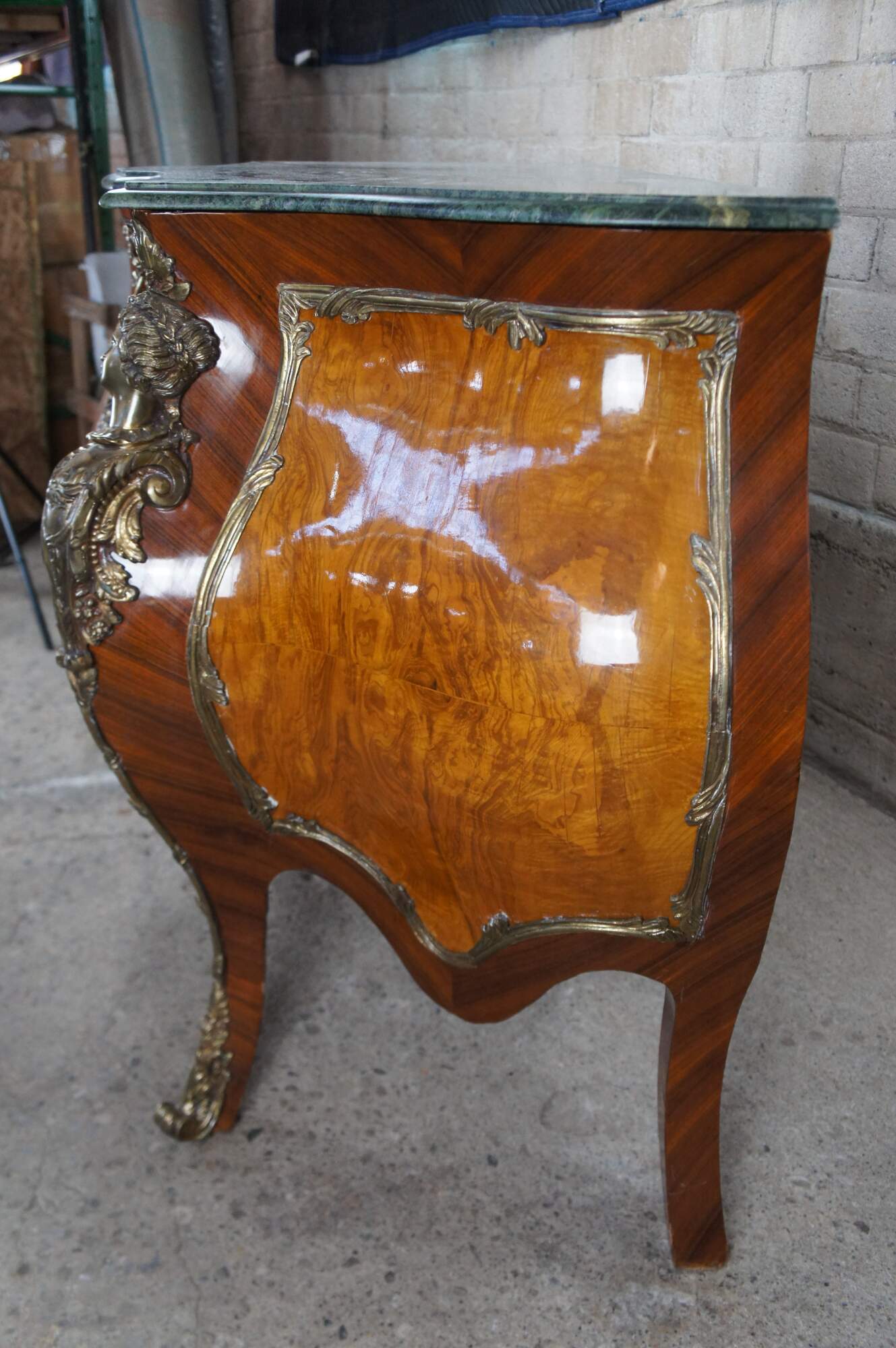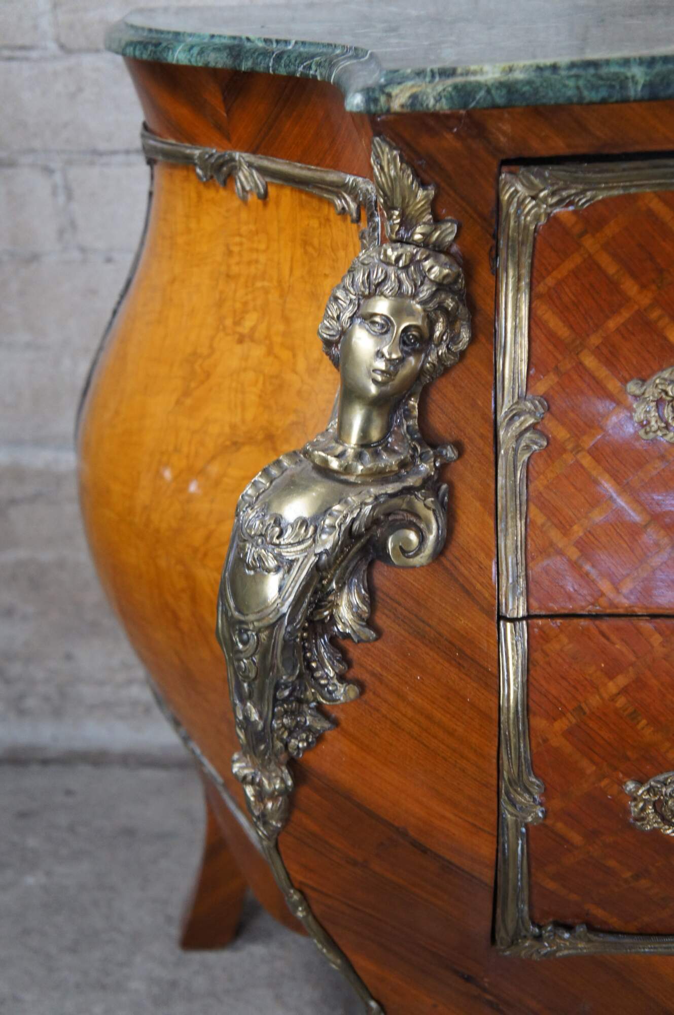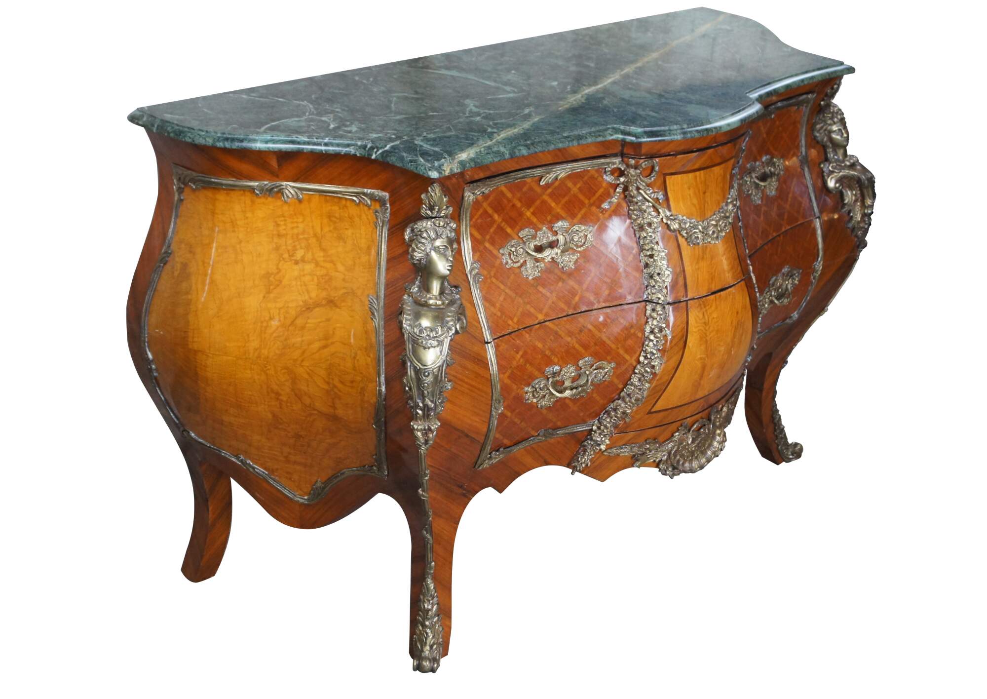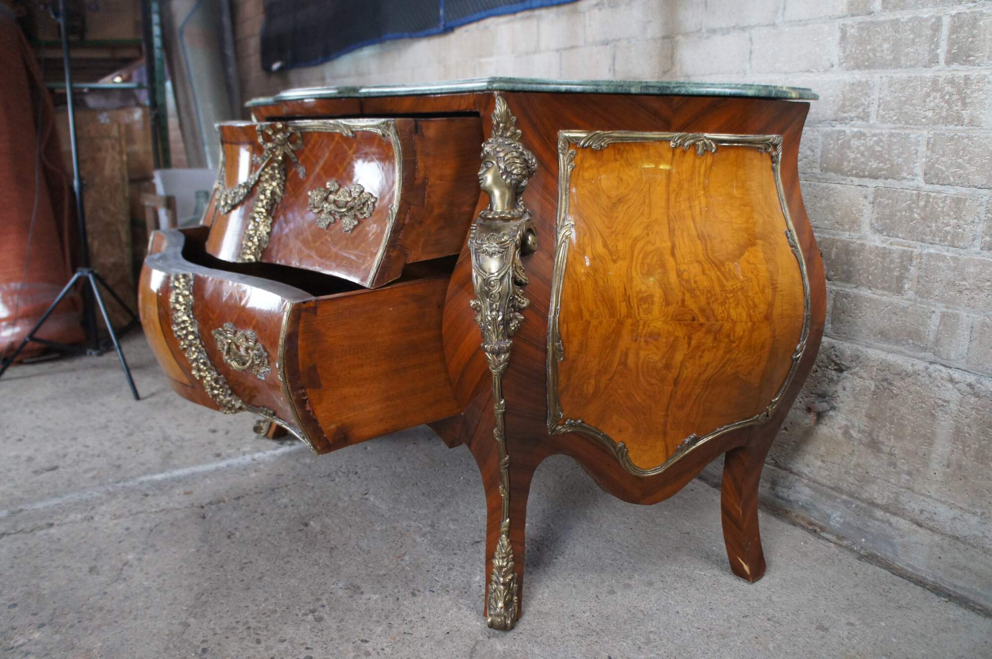 A beautiful 20th century French Louis XV style Bombe Commode. Made from walnut with a shapely form featuring lattice parquetry inlay, figural caryatid mounts, bronze foliate, swags and a green marble top. The sides and central panel of the cabinet showcase matchbook burl accented by inlay and ormolu. The chest has two large dovetailed drawers and is supported by long tapered legs.