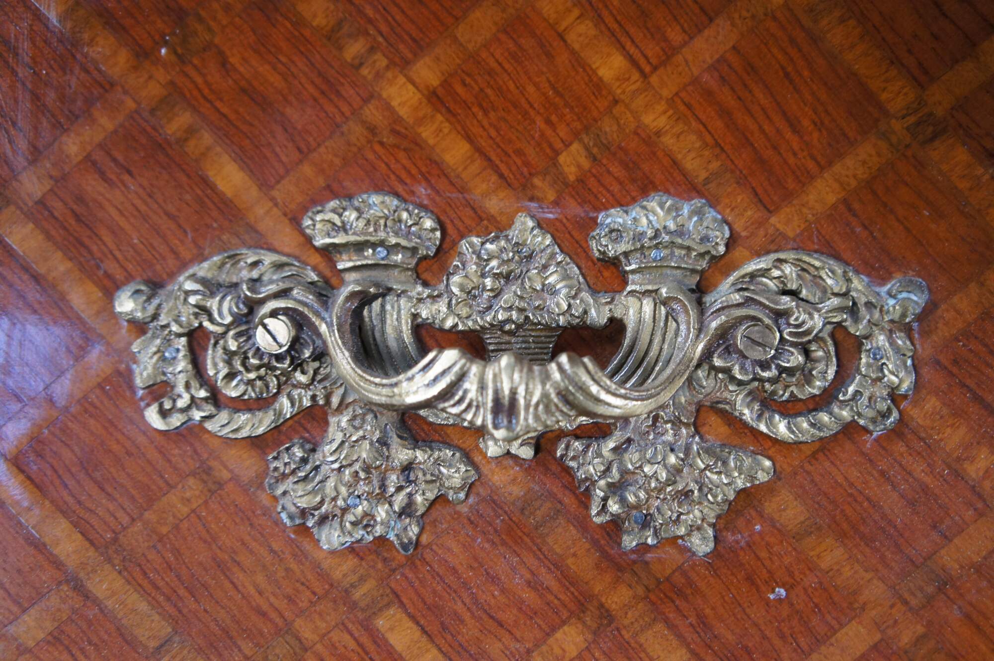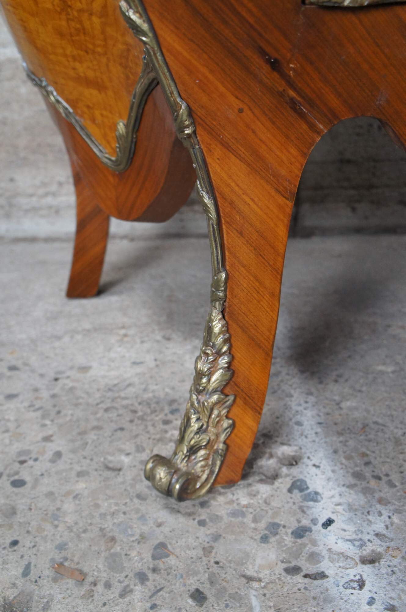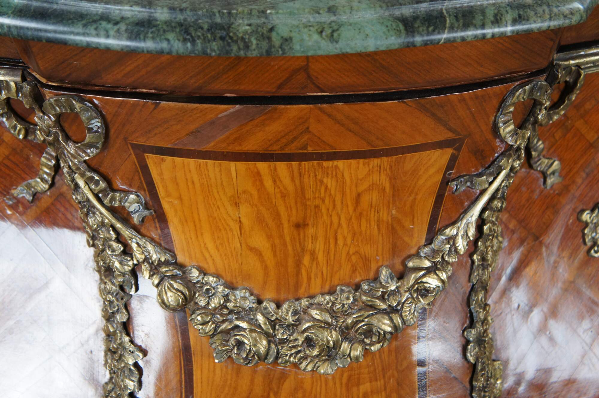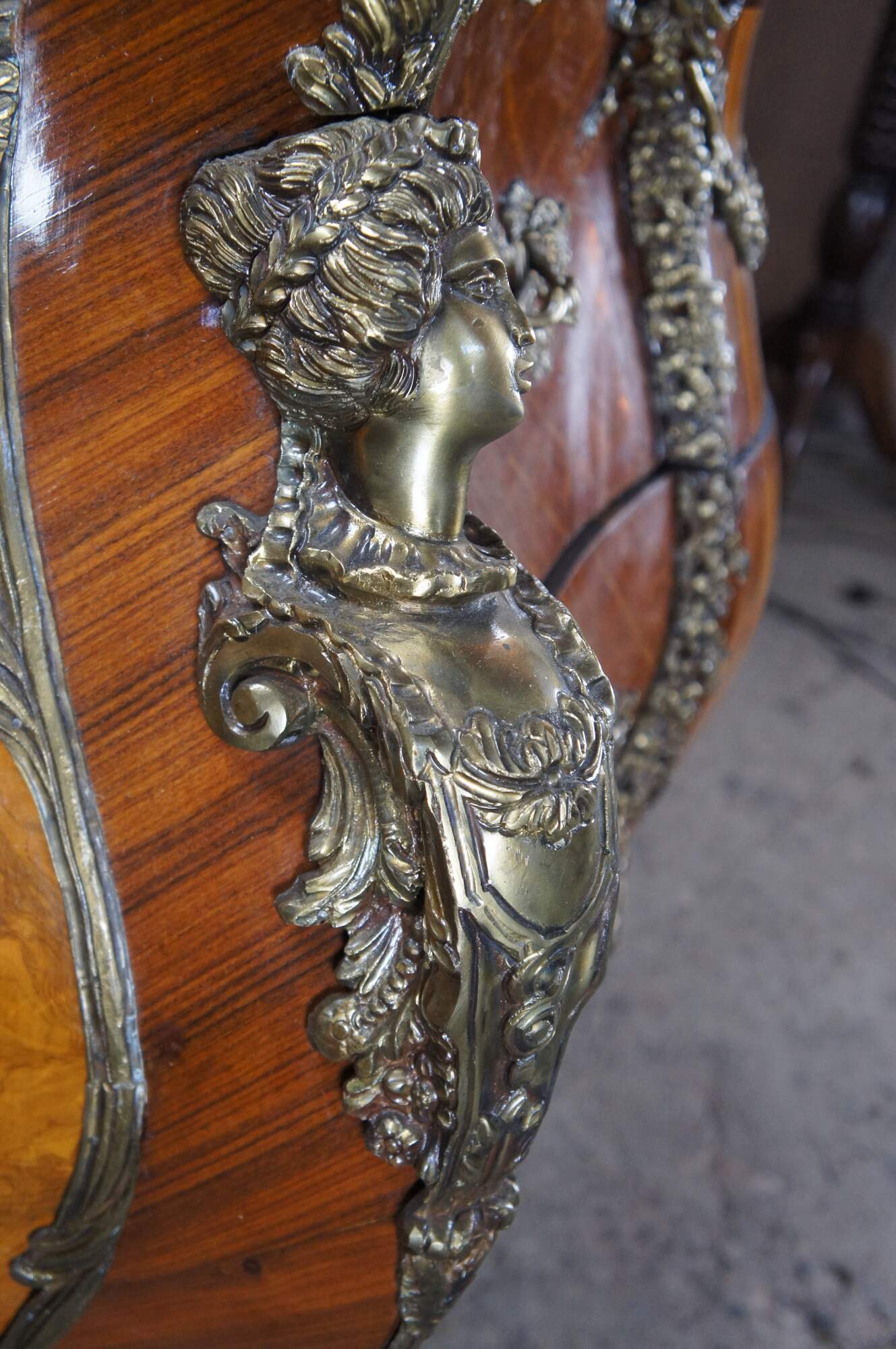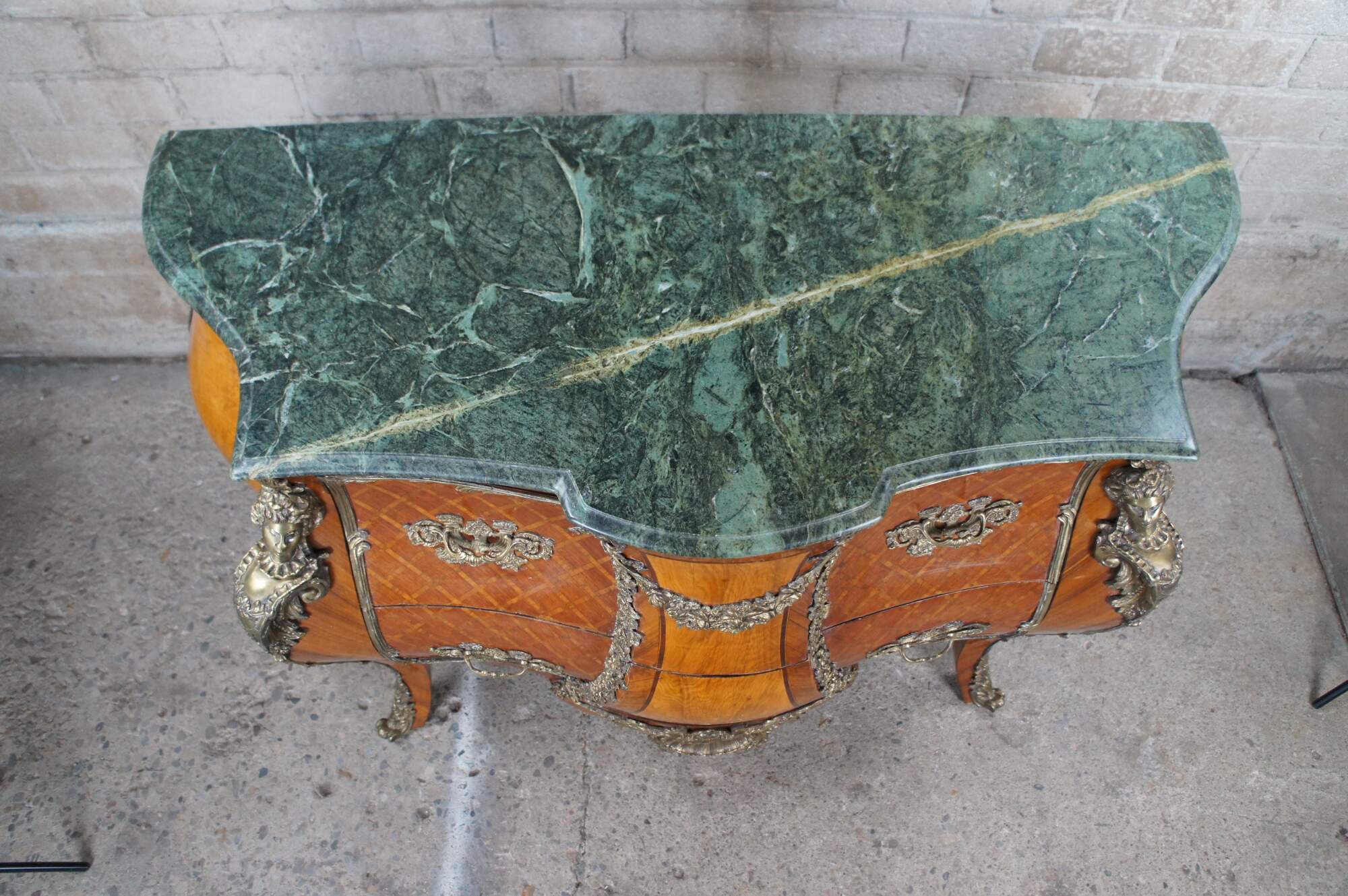 A beautiful 20th century French Louis XV style Bombe Commode. Made from walnut with a shapely form featuring lattice parquetry inlay, figural caryatid mounts, bronze foliate, swags and a green marble top. The sides and central panel of the cabinet showcase matchbook burl accented by inlay and ormolu. The chest has two large dovetailed drawers and is supported by long tapered legs.