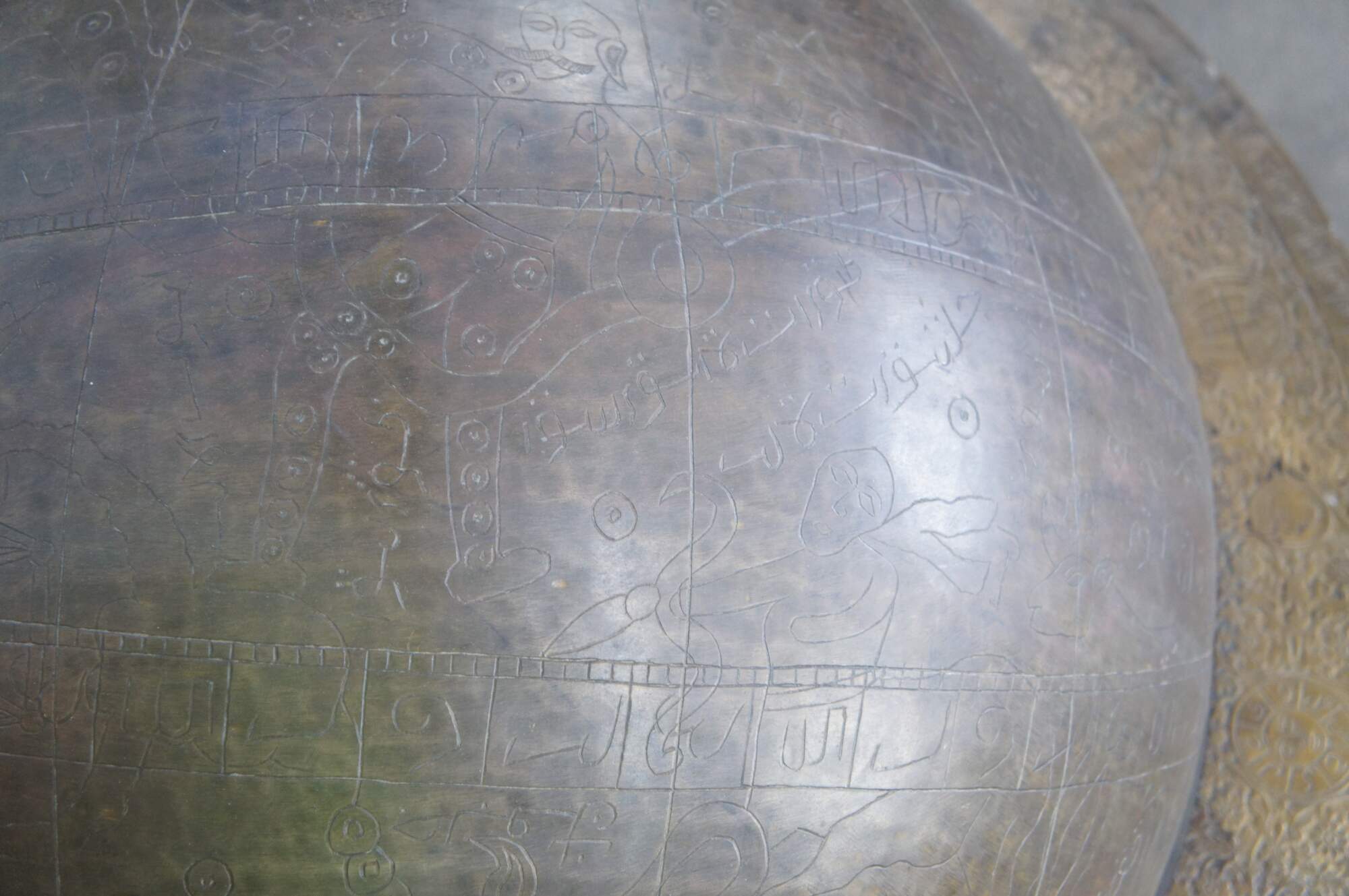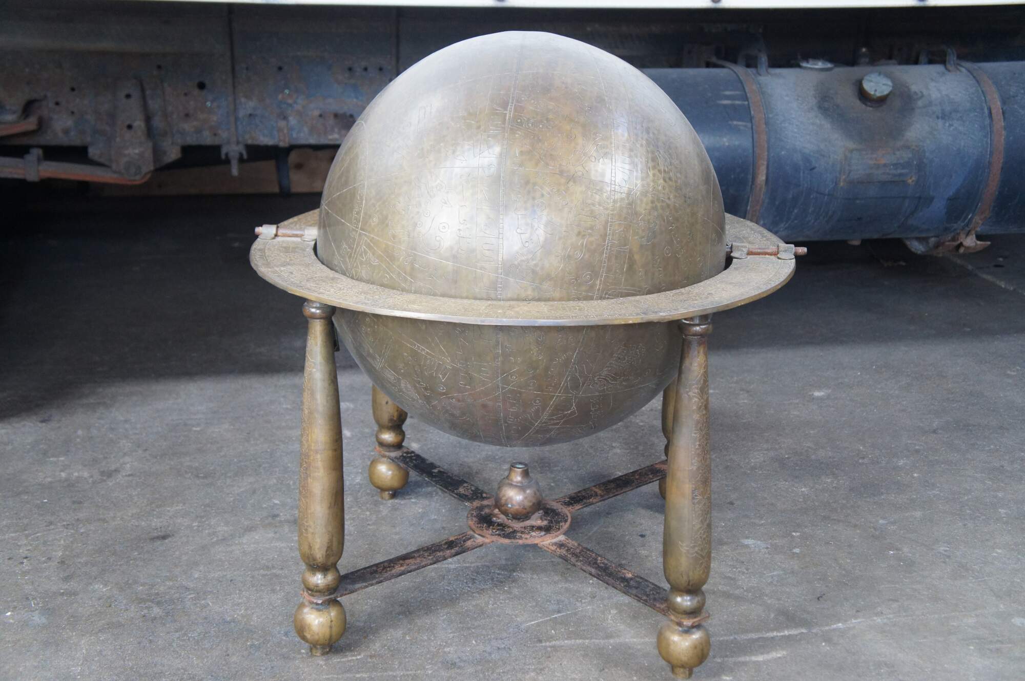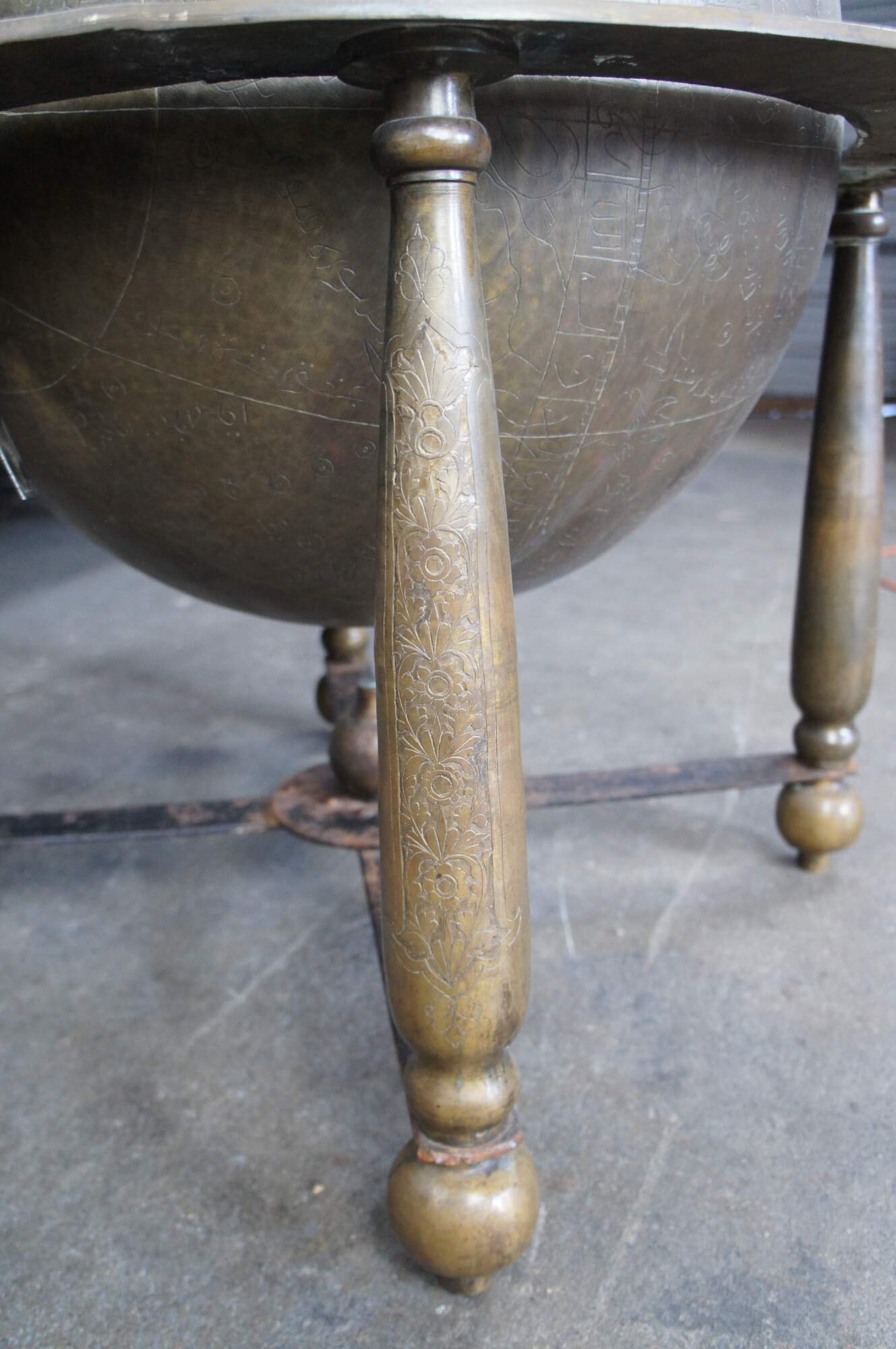 An exceptional large brass Islamic Celestial Globe. The hammered brass sphere constructed from two hemispheres with engraved scales and constellations, pivoted within horizontal ring engraved with the twelve signs of the zodiac, raised on four turned brass legs and stretcher with central finial,