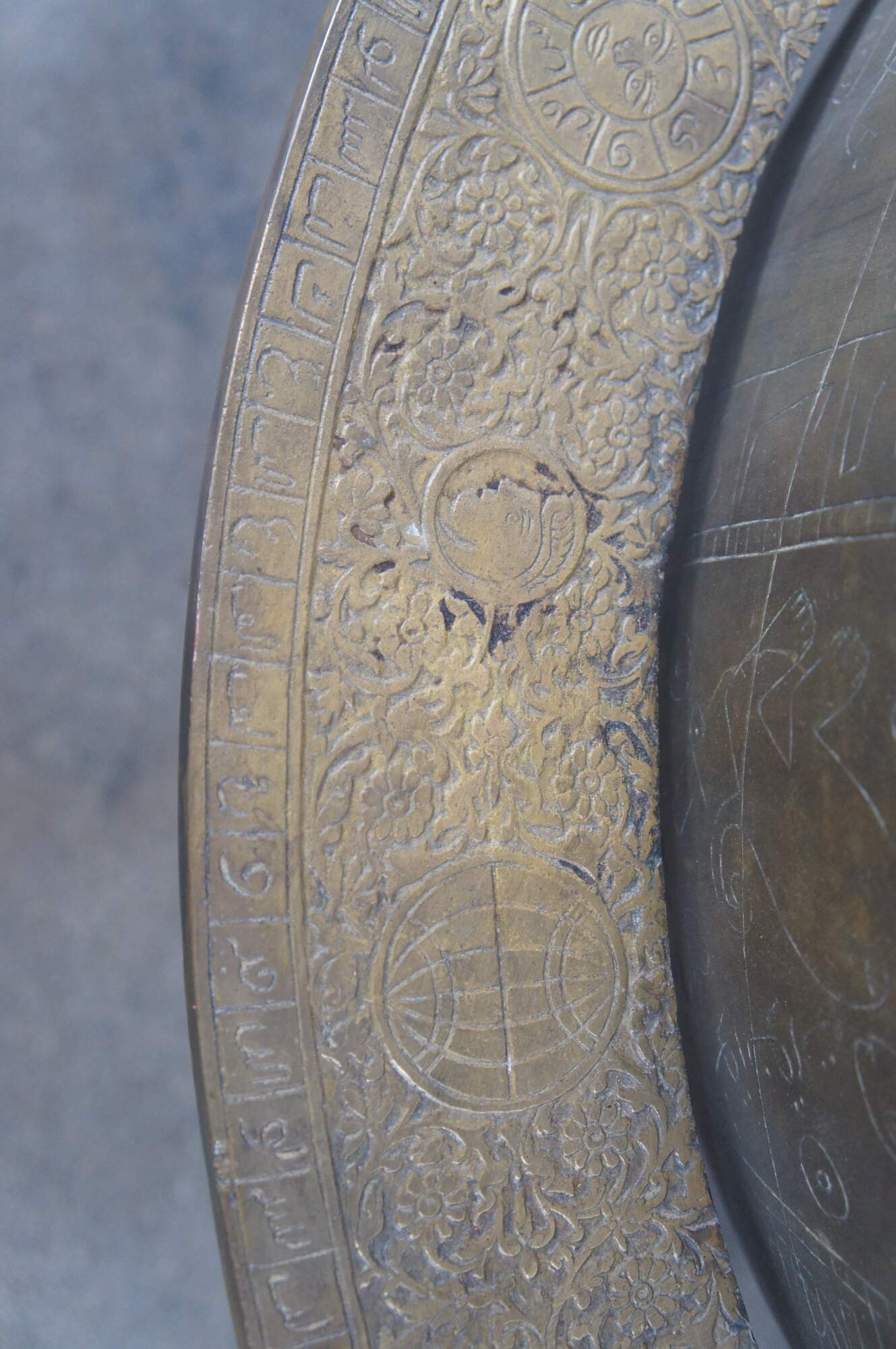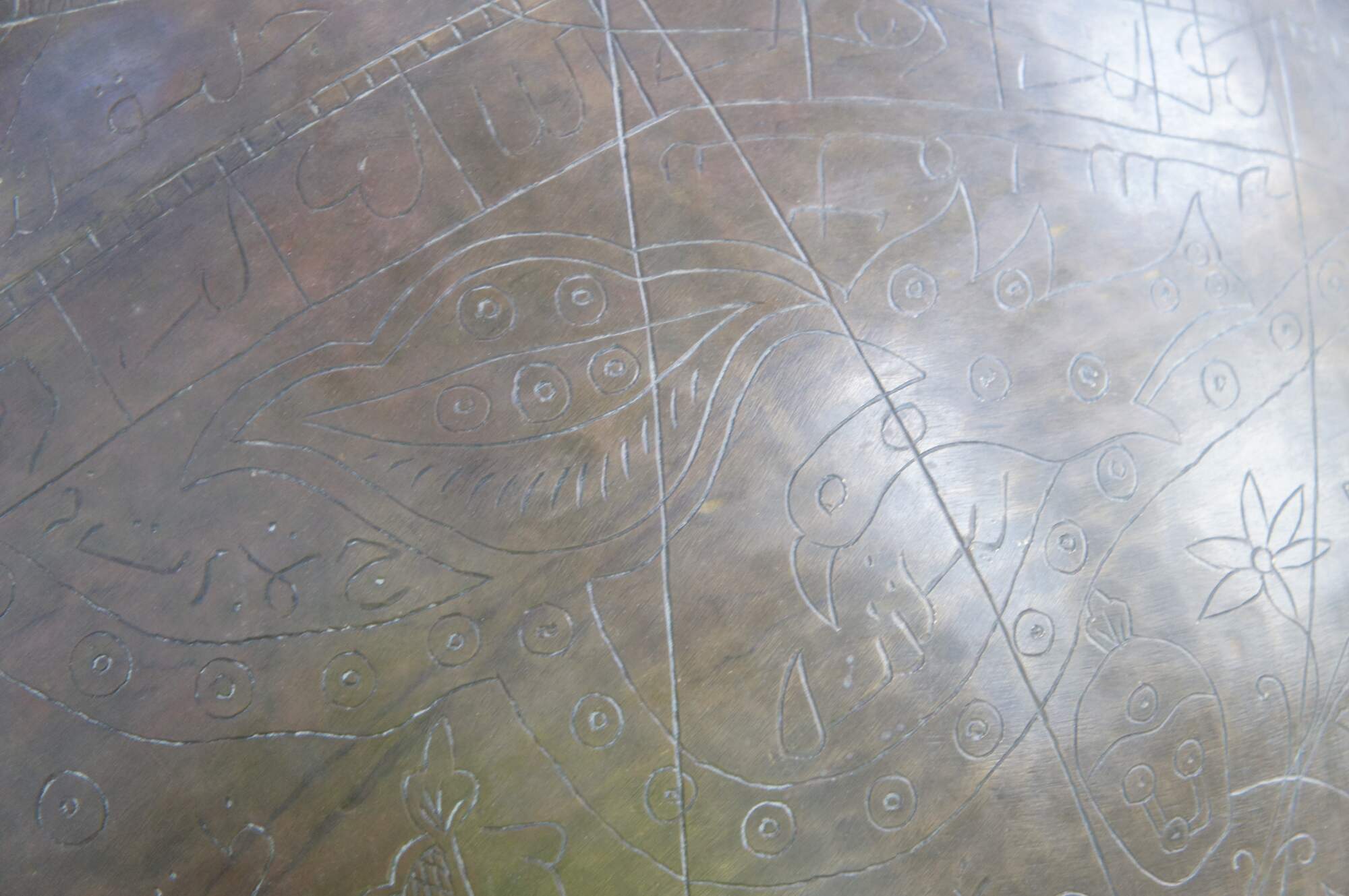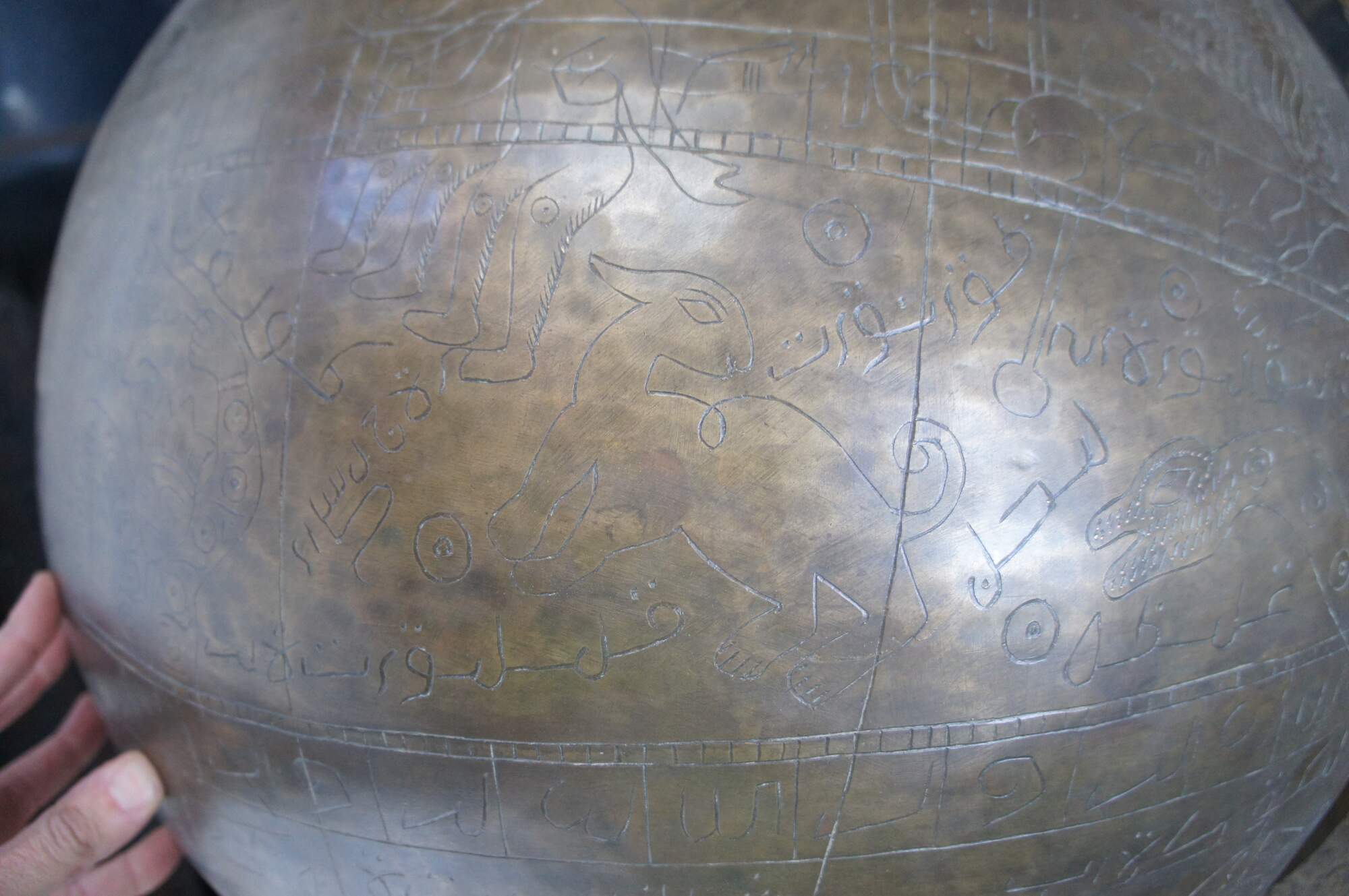 An exceptional large brass Islamic Celestial Globe. The hammered brass sphere constructed from two hemispheres with engraved scales and constellations, pivoted within horizontal ring engraved with the twelve signs of the zodiac, raised on four turned brass legs and stretcher with central finial,