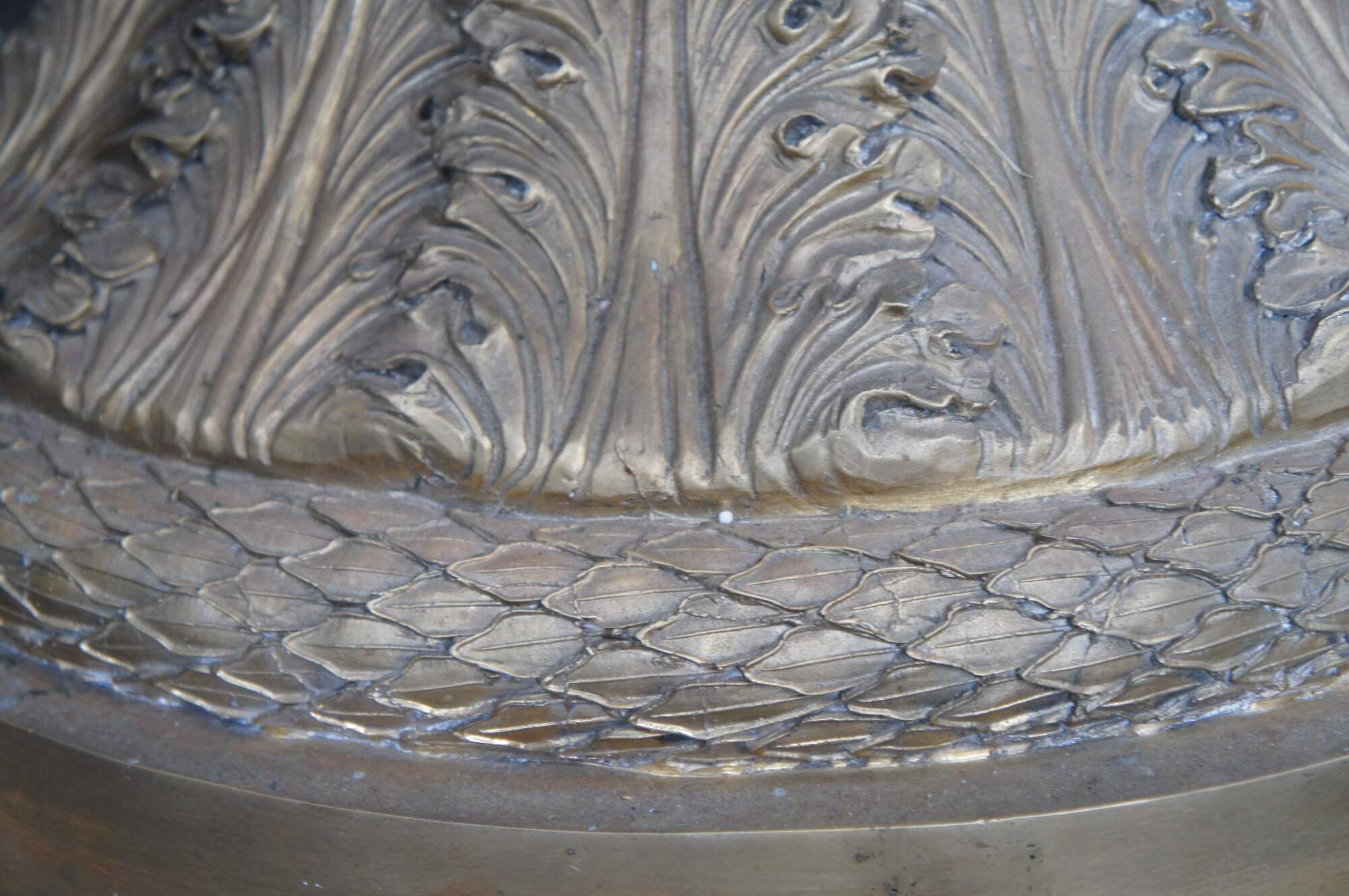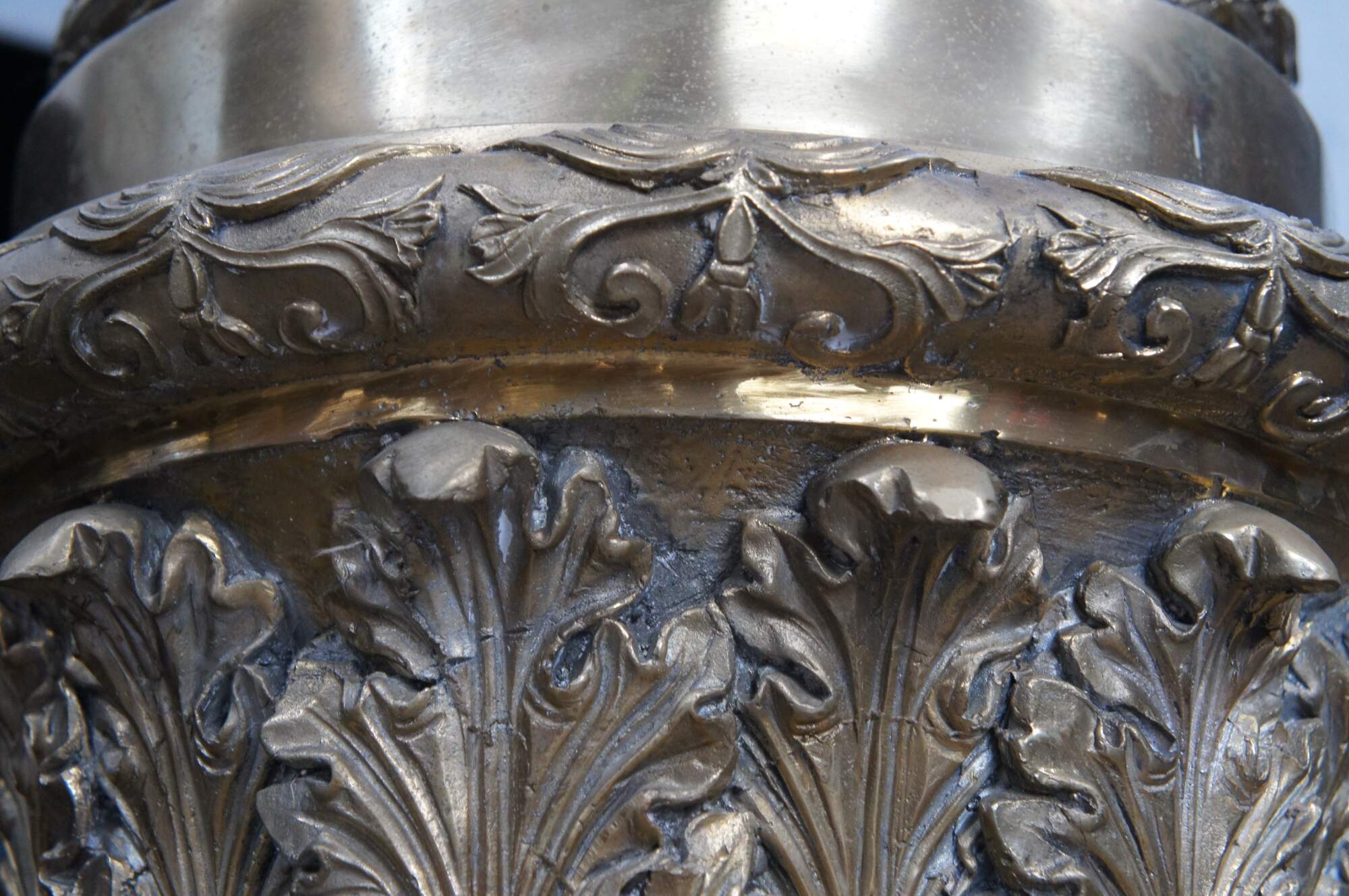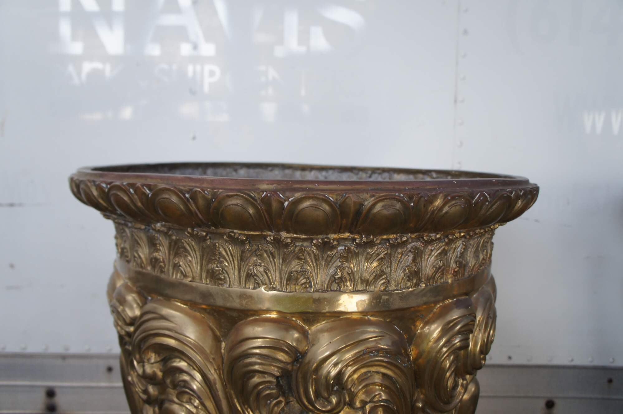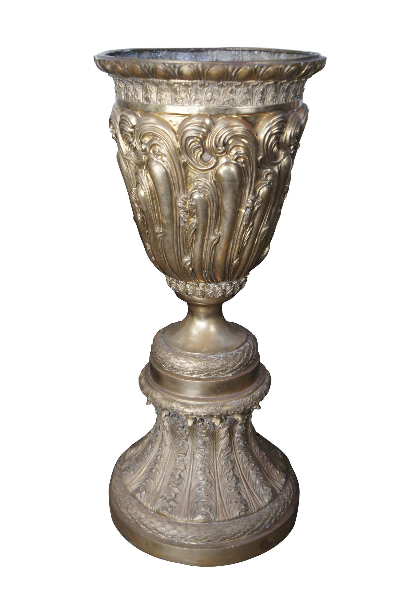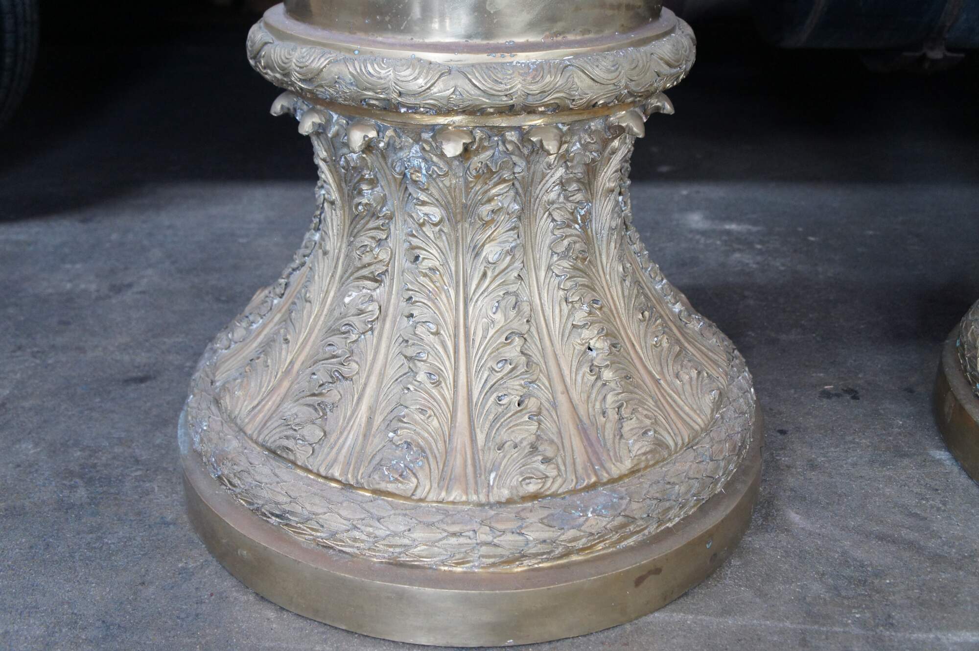 Monumental oversized pair of French Neoclassical style bronze urns / planters over stands, circa last quarter 20th century. These oversized planters are perfect for display indoor or outdoor. Features a beautiful egg and dart molded rim over acanthus motifs and a gadrooned body. Each vase is footed and mounted to an ornate acanthus relief stand.
