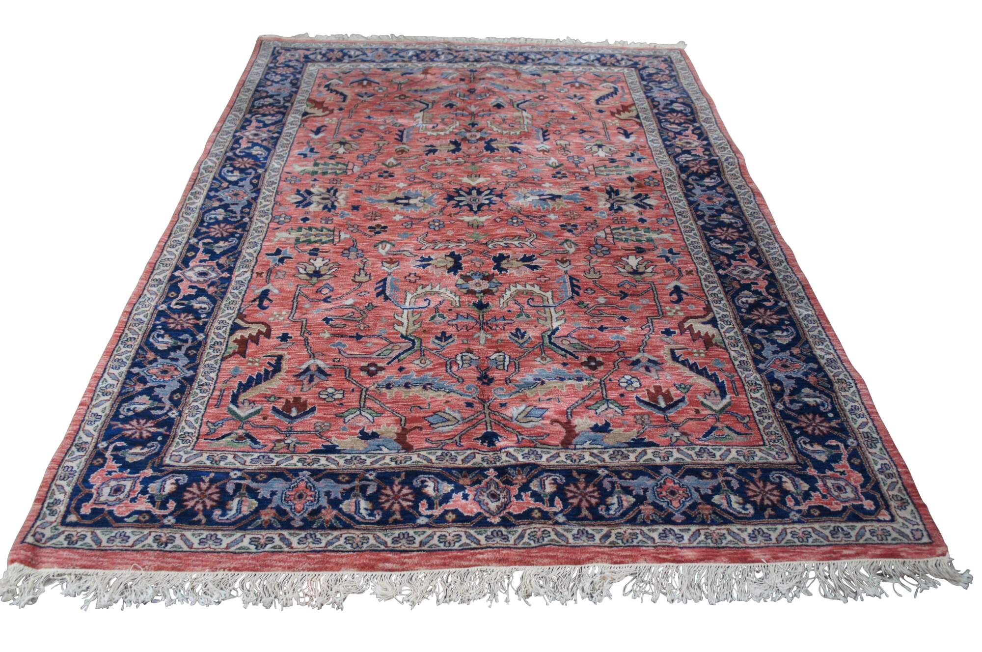 Vintage Pande Cameron of New York Oriental area rug or carpet. Made of wool featuring a Royal Jahan design with star medallion with florals, vines and leaves. Reds, blues, pinks, greens, brown. Royal Jahan is a style of handwoven Indian rug that features a star medallion on a red background. The medallion can include ivory, black, shades of green, ruby, and pale blue. Made in India.