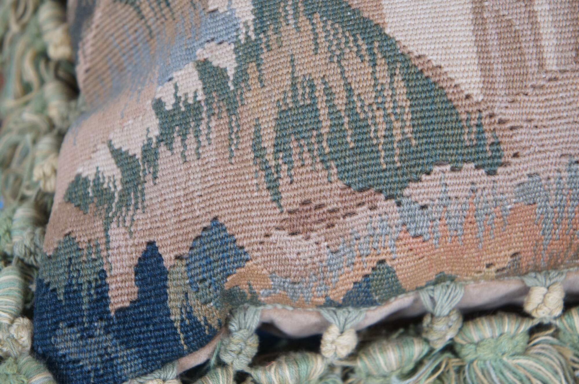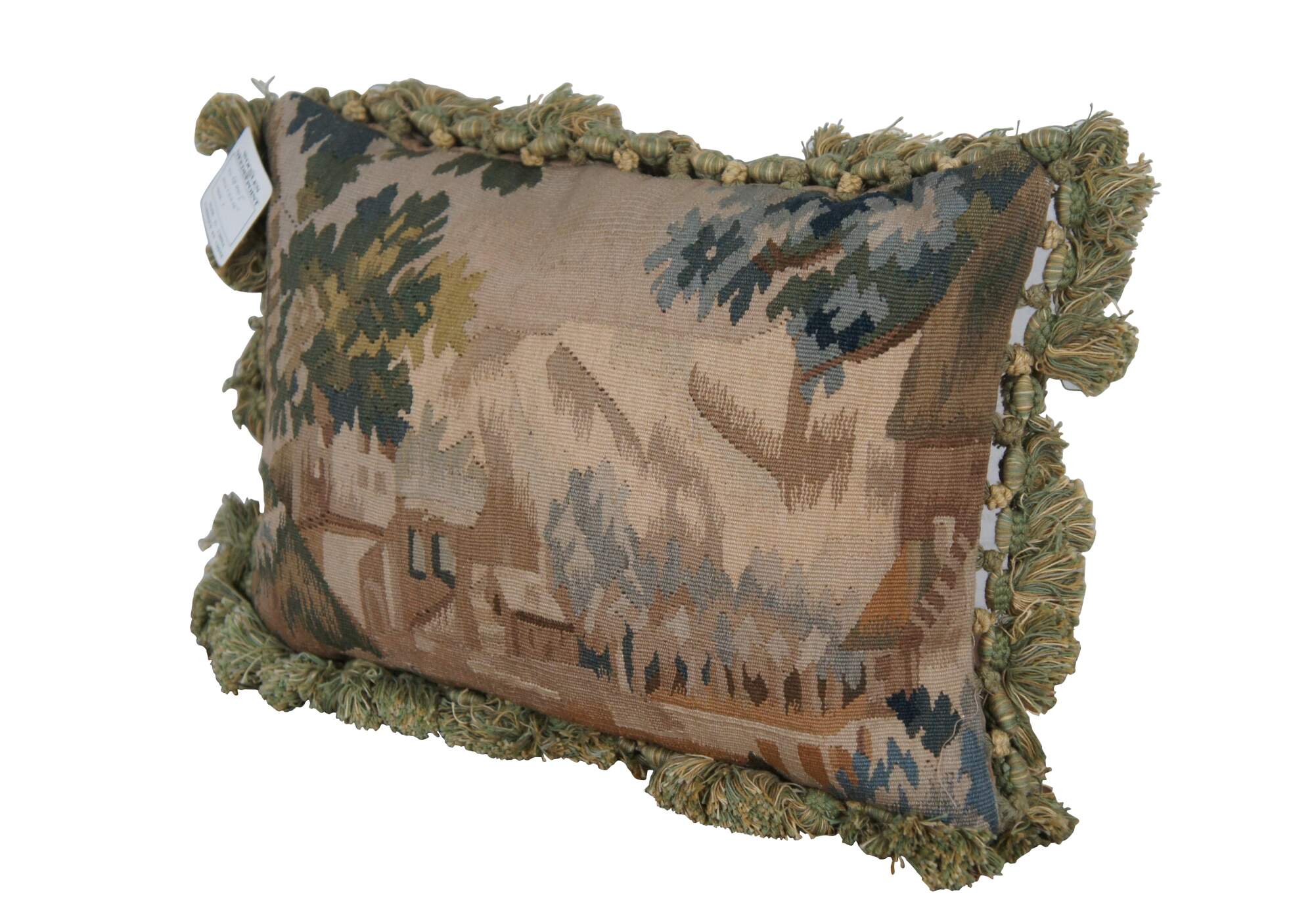 3 Available - 20th century French Aubusson style rectangular throw / lumbar pillow, machine embroidered in wool with a castle peeping through a forested landscape. Down Filled. Green and gold tassel trim. Light brown velour back with zipper closure.