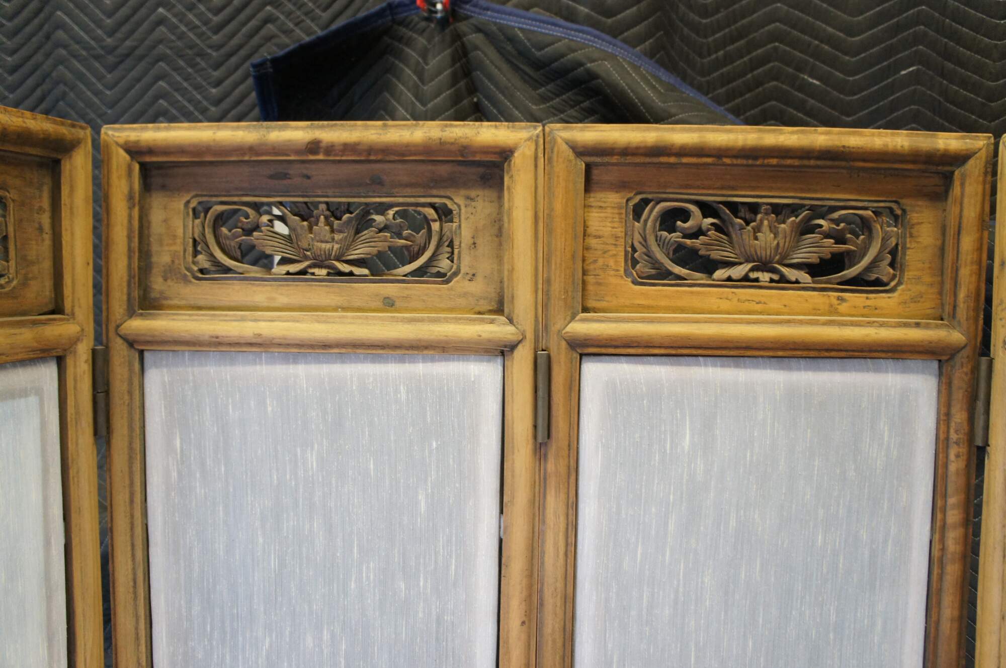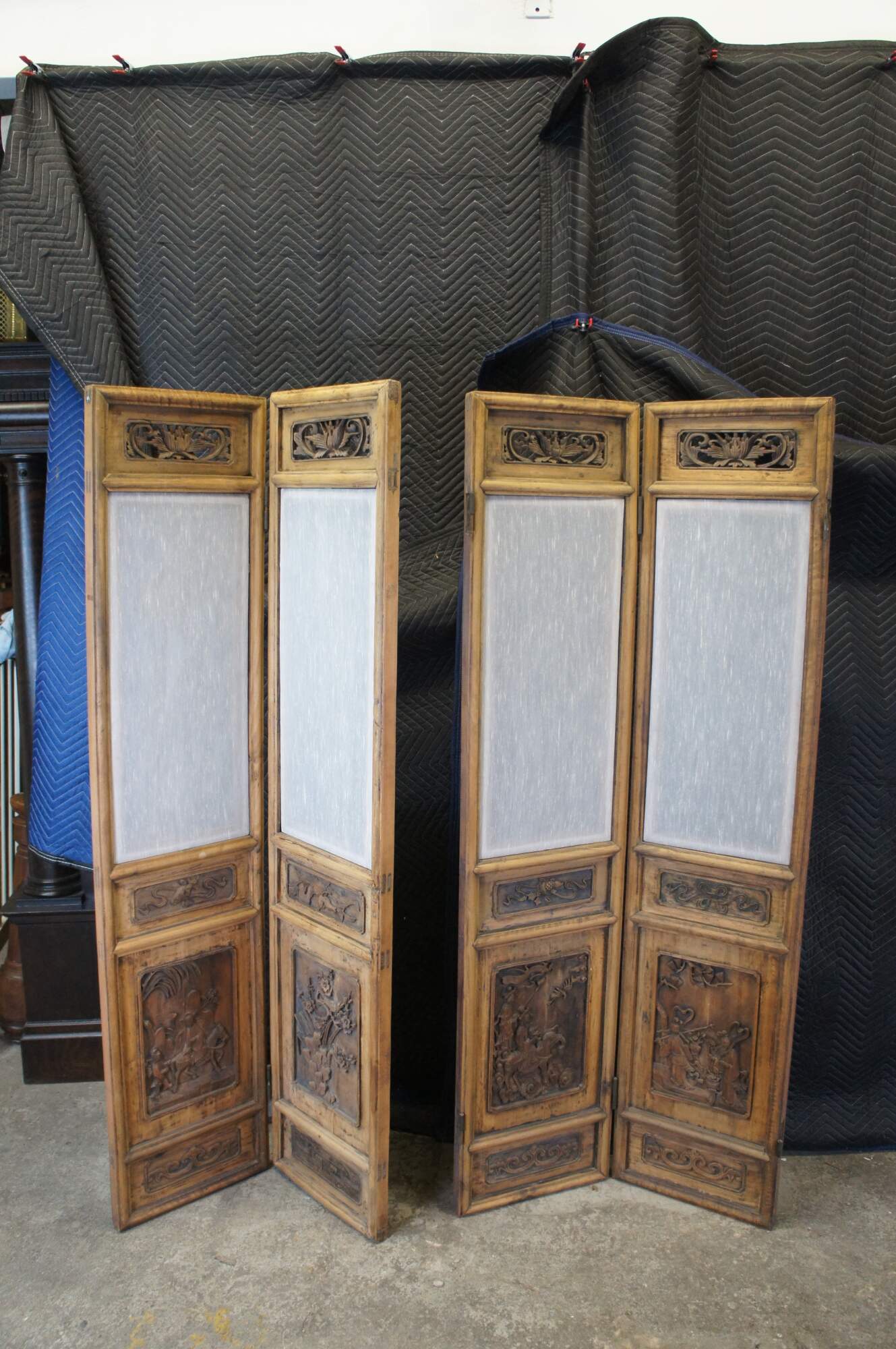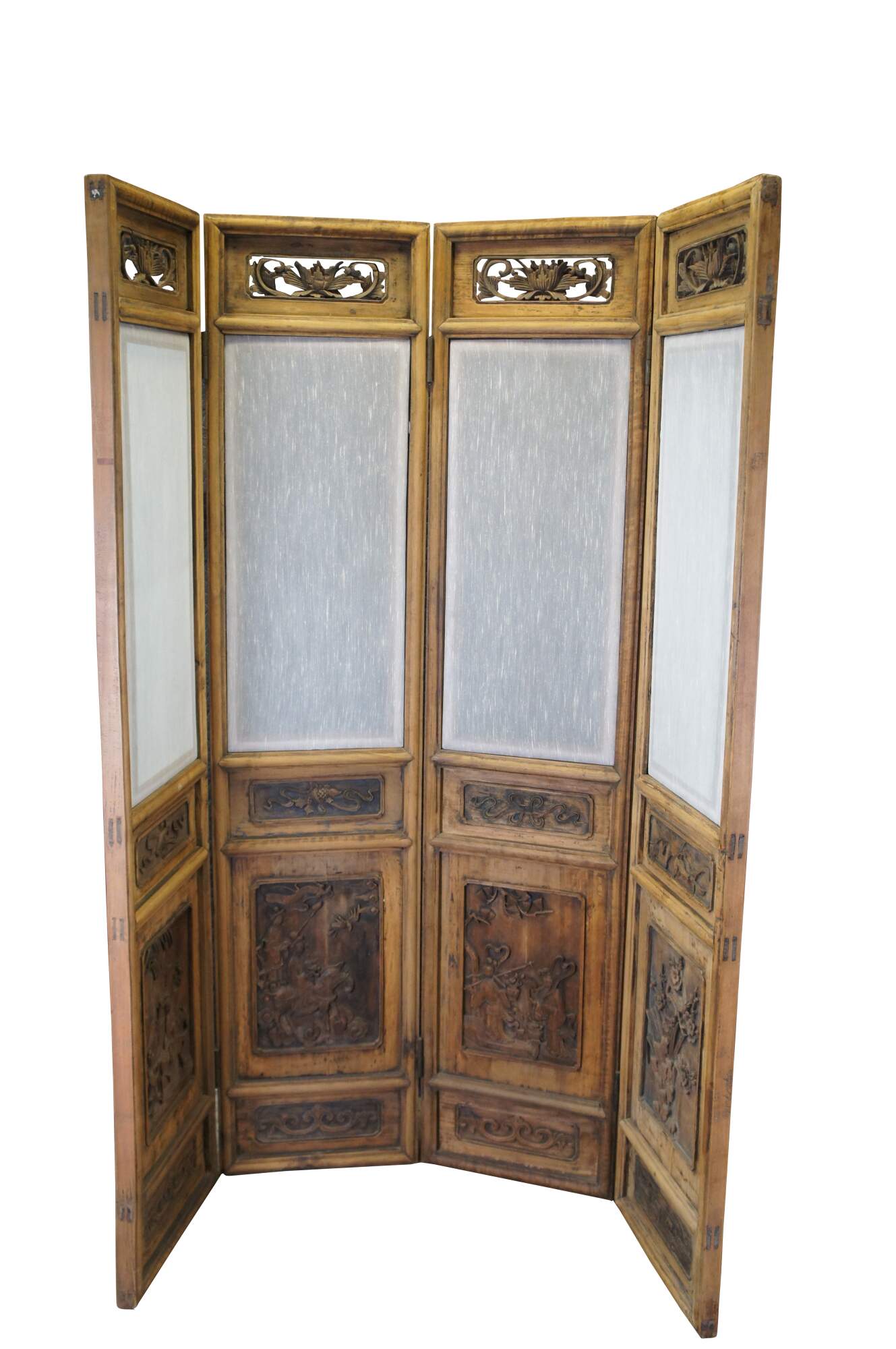 Antique Chinese Chinoiserie four panel room divider or dressing screen. Made of Elm feauring inset silk screen, reticulated floral design, and four carved high relief panels - one scene depicting an equestrian man on horseback; another with man riding elephant with woman, baby and eagle; two Geishas in the garden with flower pots; and a floral bird scene.