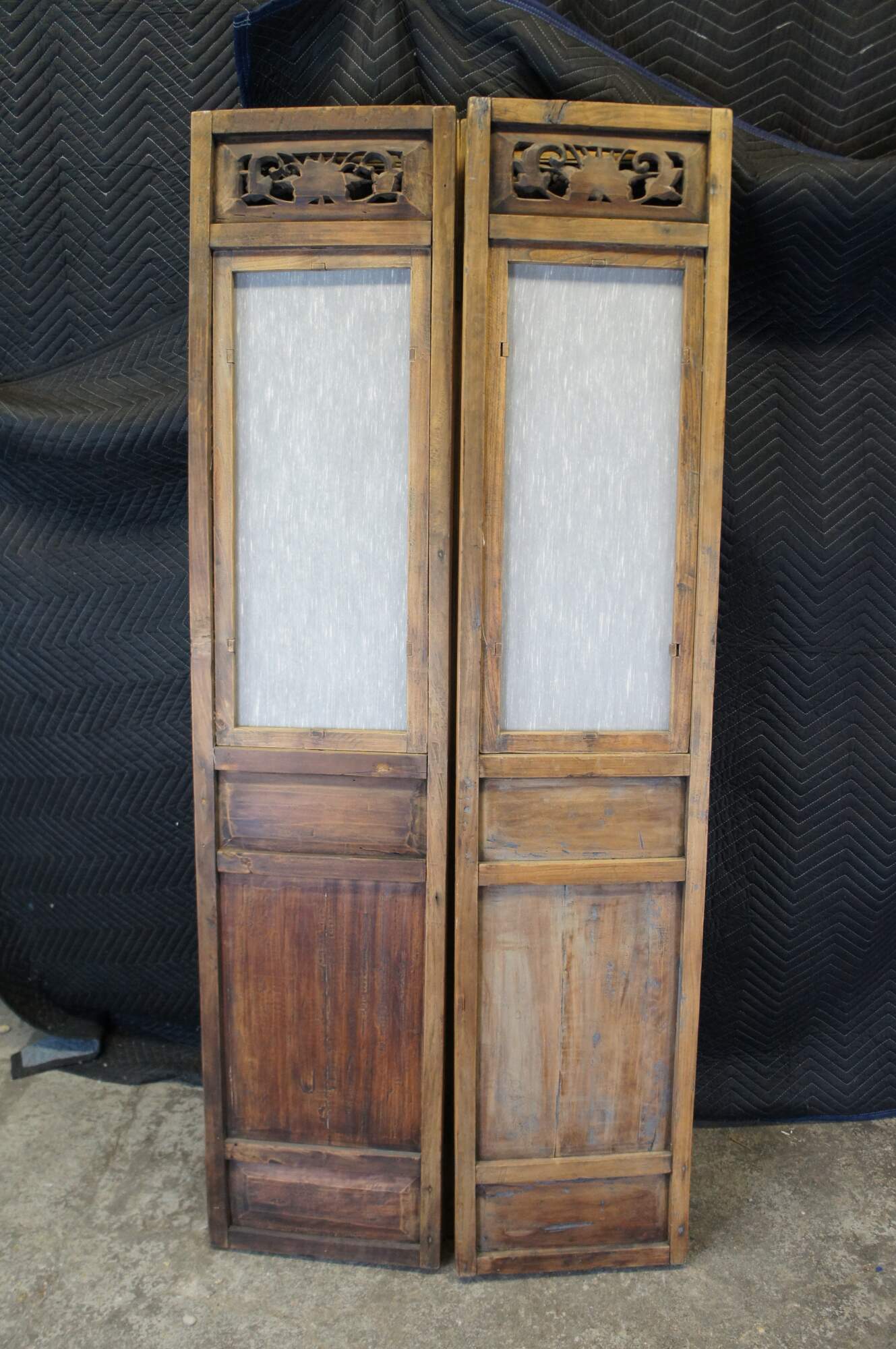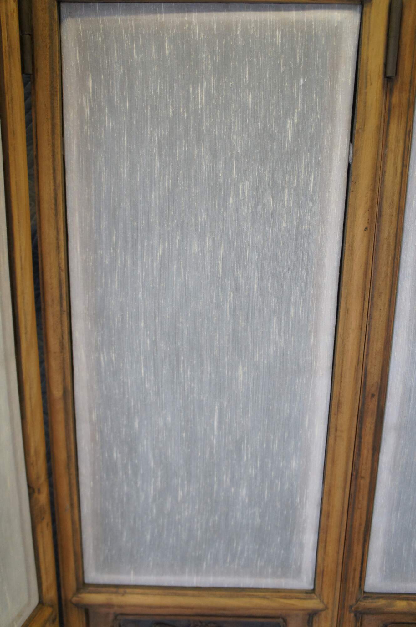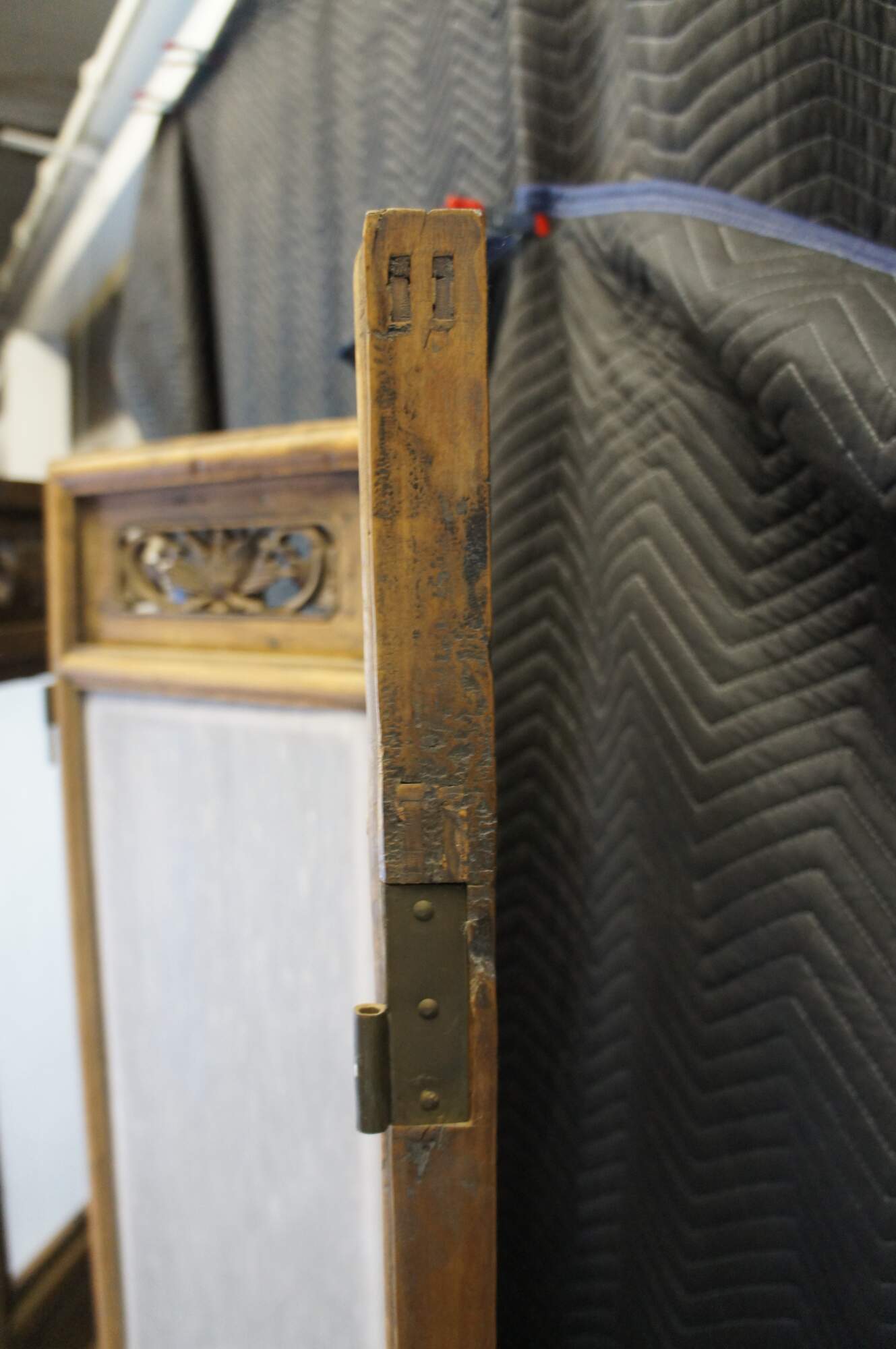 Antique Chinese Chinoiserie four panel room divider or dressing screen. Made of Elm feauring inset silk screen, reticulated floral design, and four carved high relief panels - one scene depicting an equestrian man on horseback; another with man riding elephant with woman, baby and eagle; two Geishas in the garden with flower pots; and a floral bird scene.