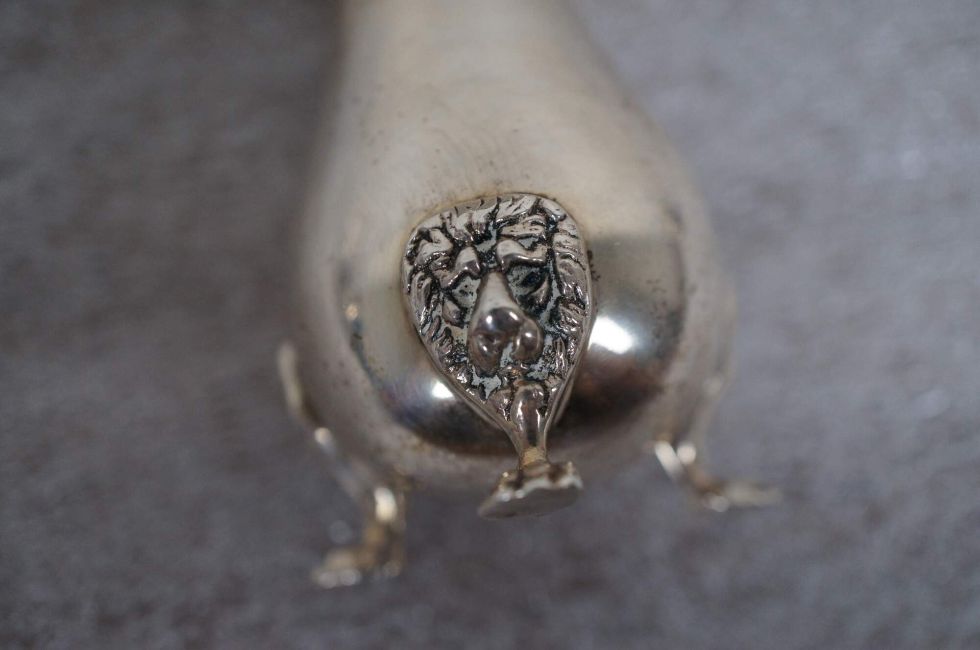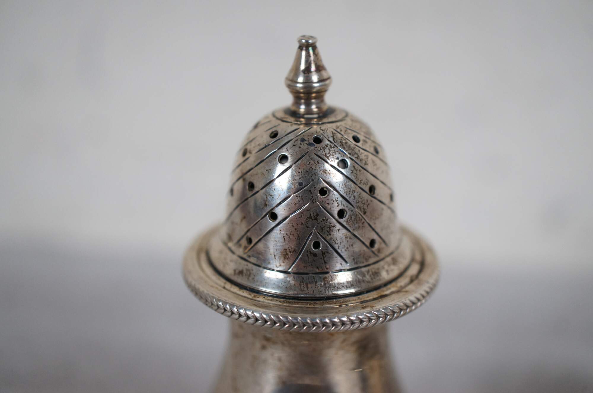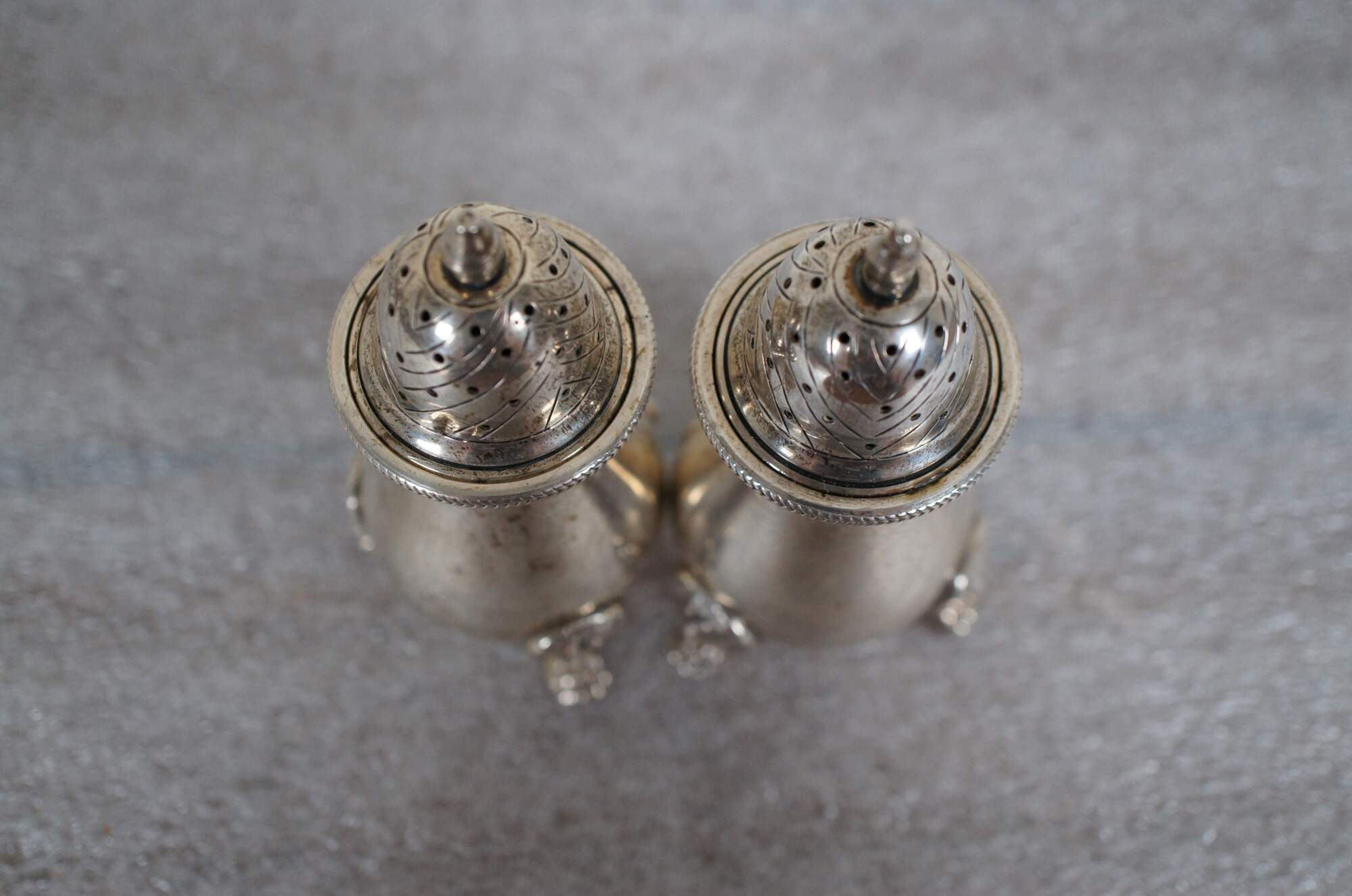 Early to mid 20th century (circa 1935-1950) pair of sterling silver salt shakers / pepper pots by Becht and Hartl. Pattern / item number 33. Vase shaped bosy with three lion's head topped paw feet, etched chevron top with finial, braided edge.