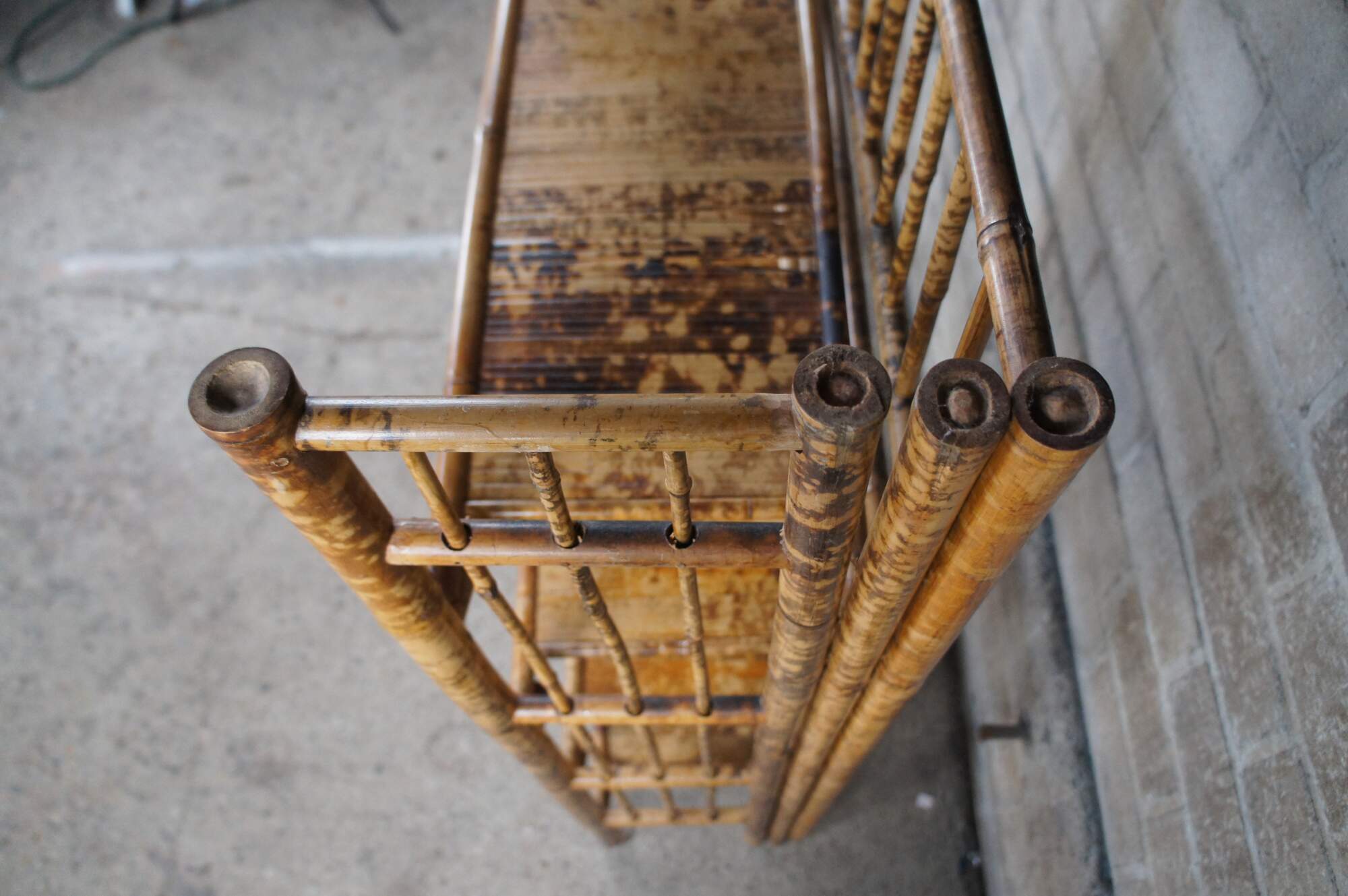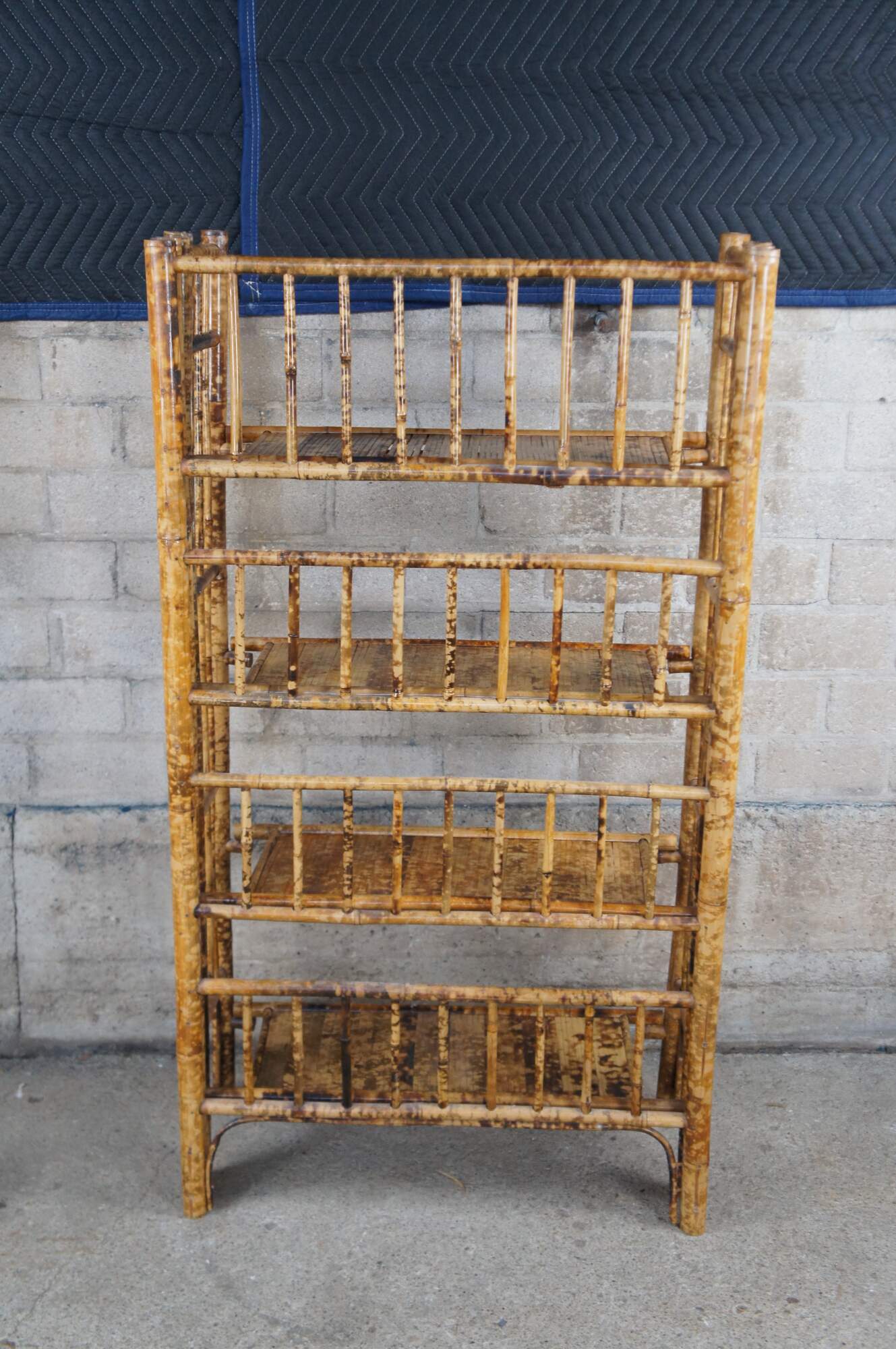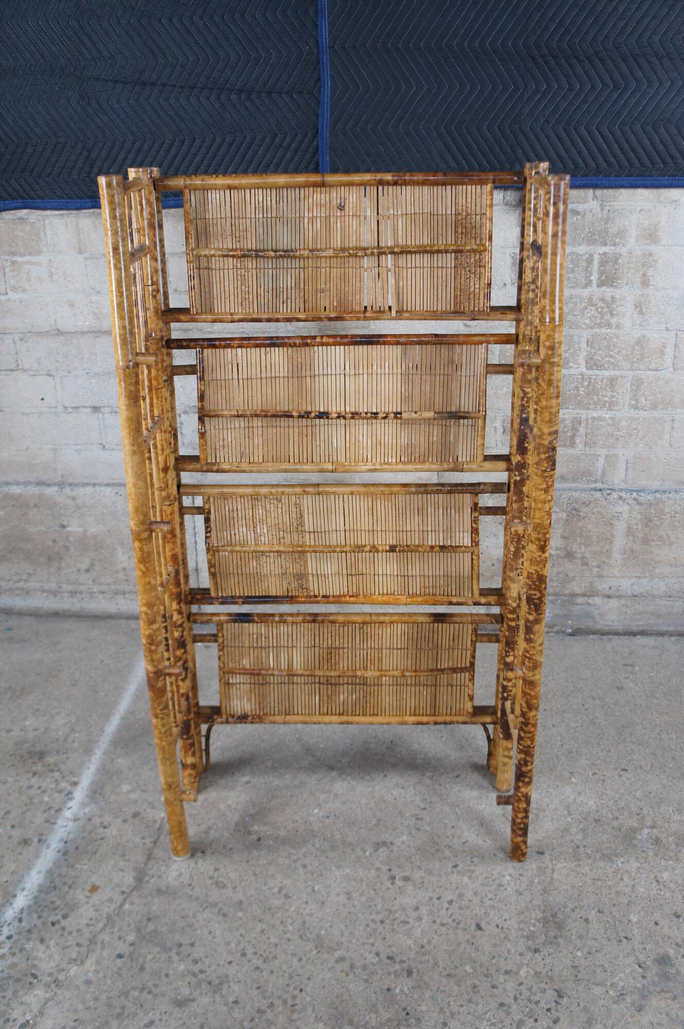 Antique foldable knockdown library bookcase / etagere stand. Made of bamboo featuring a scorched / tortoise shell finish with four shelves, columns, and slatted design