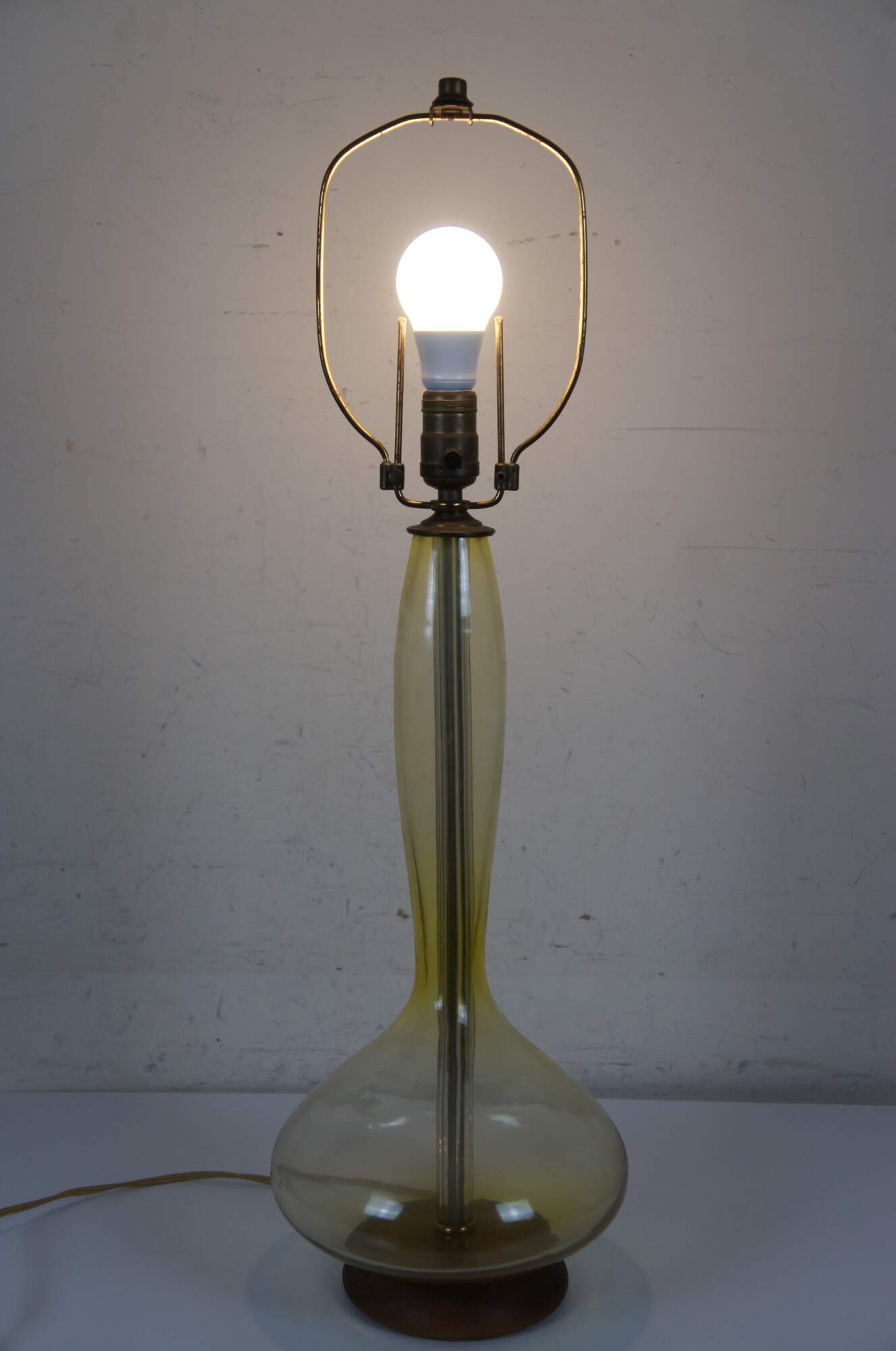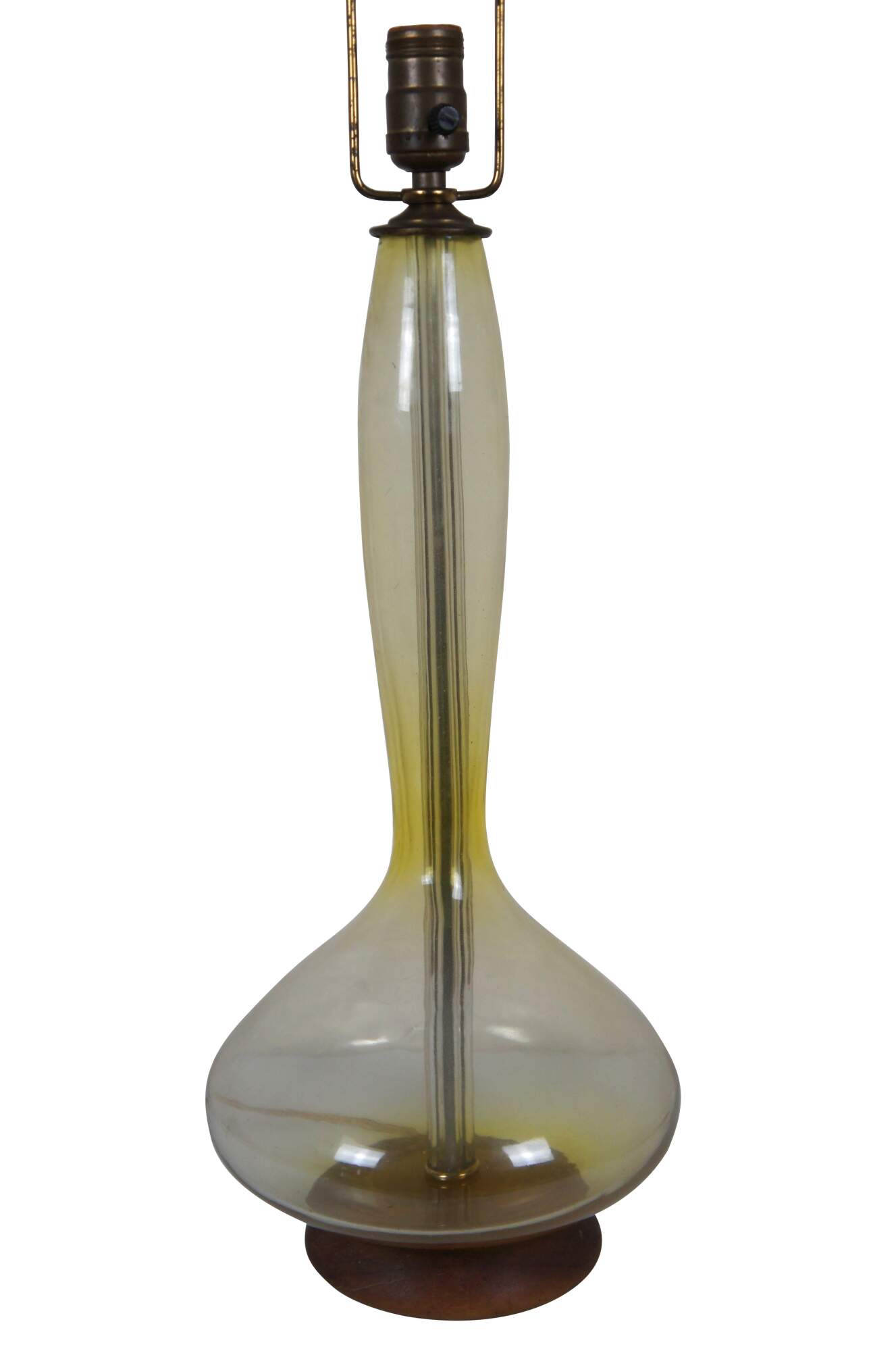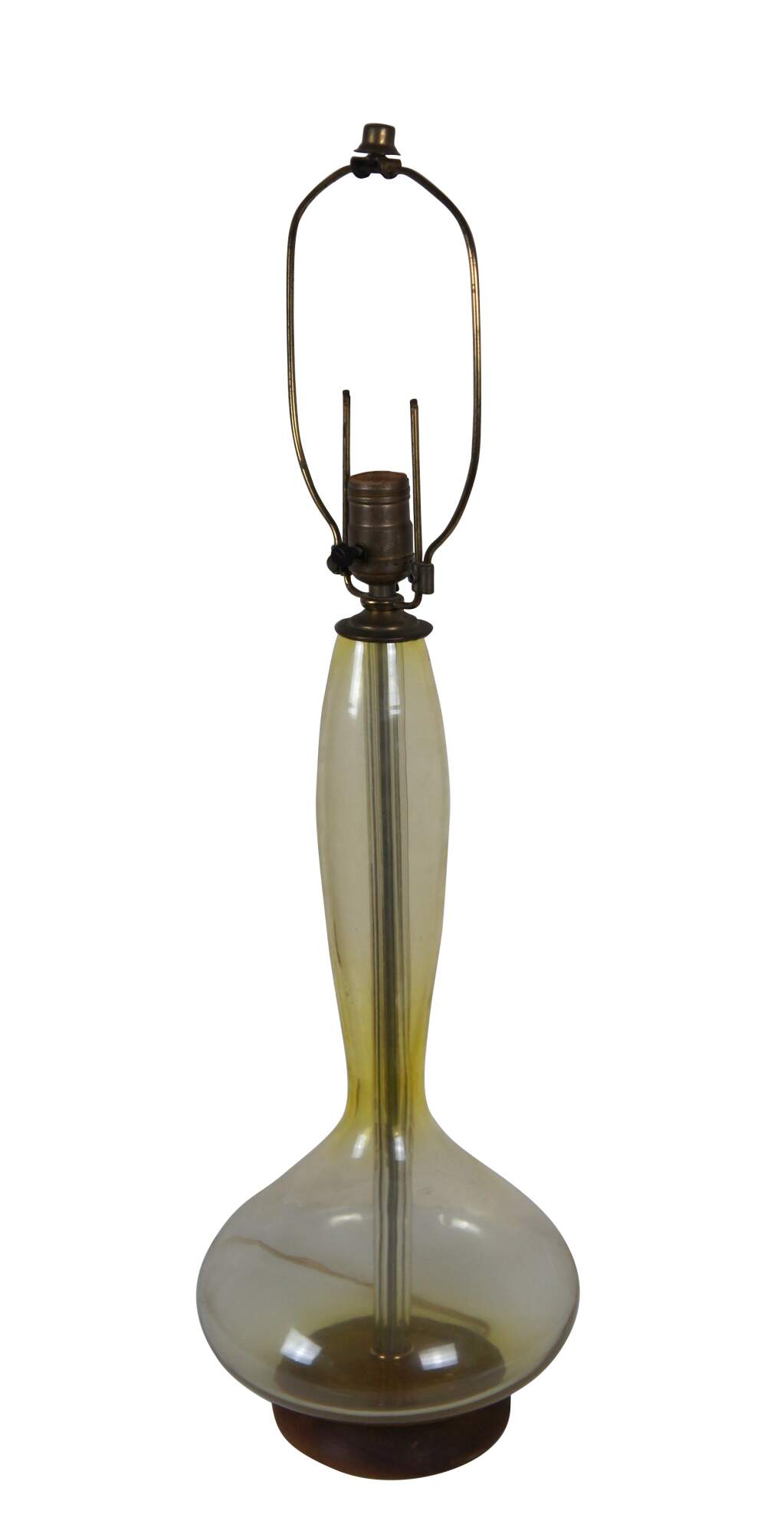 Mid 20th century Blenko glass genie bottle Jonquil table lamp in pale yellow with round walnut base. Style number 5815 (as seen in Blenko's 1958 catalog) designed by Wayne Husted. Attached, adjustable height harp and cap shaped finial - would originally have been paired with a matching glass finial. Stamp on felt base.