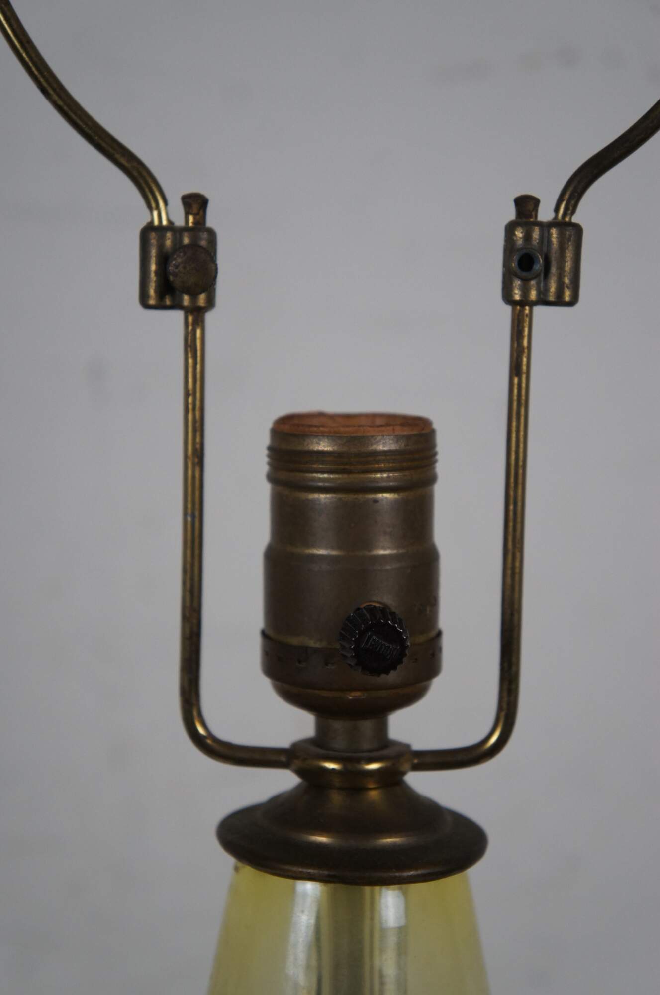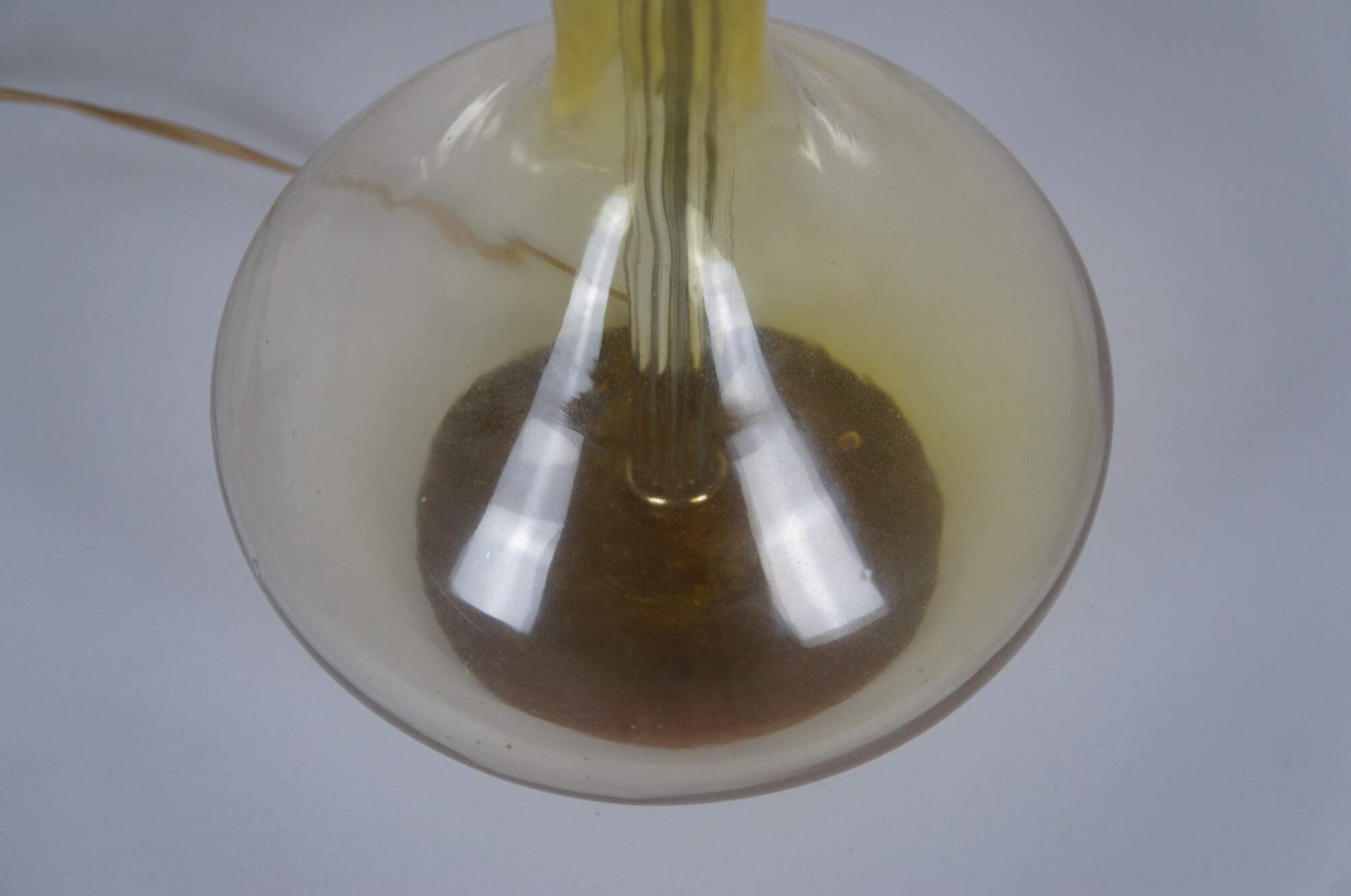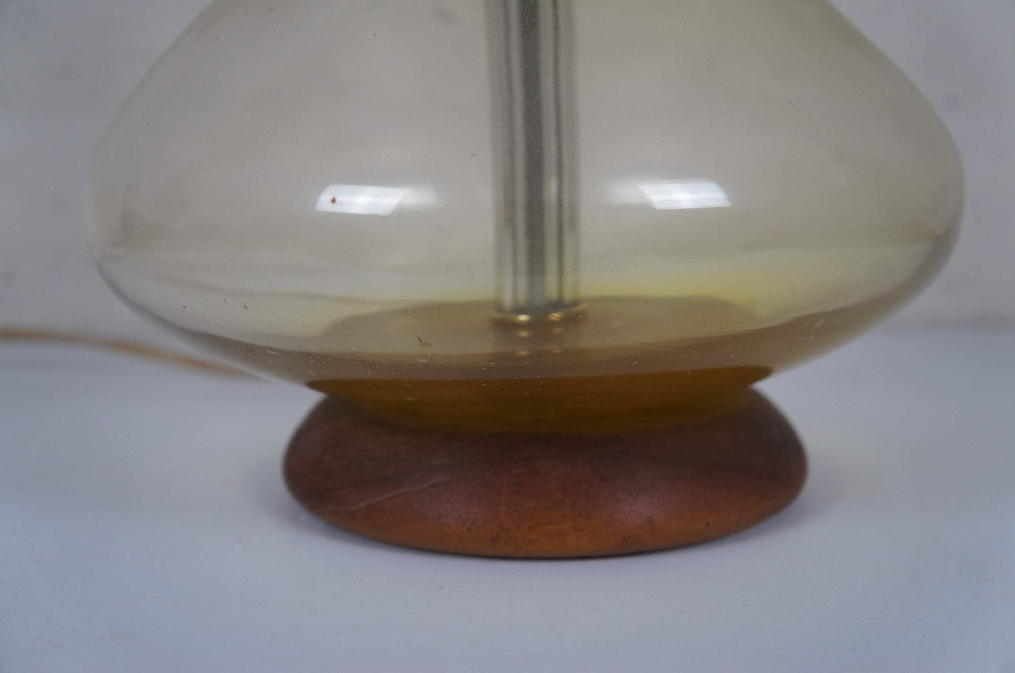 Mid 20th century Blenko glass genie bottle Jonquil table lamp in pale yellow with round walnut base. Style number 5815 (as seen in Blenko's 1958 catalog) designed by Wayne Husted. Attached, adjustable height harp and cap shaped finial - would originally have been paired with a matching glass finial. Stamp on felt base.