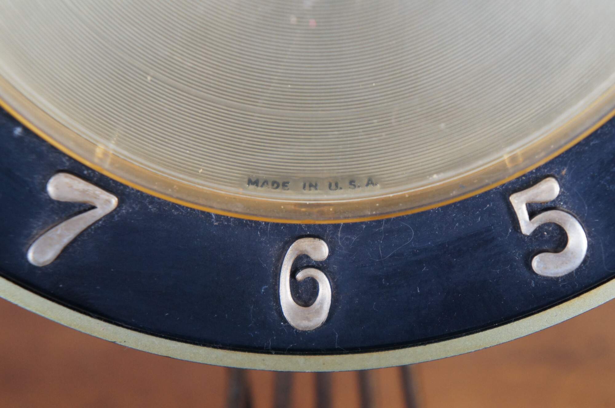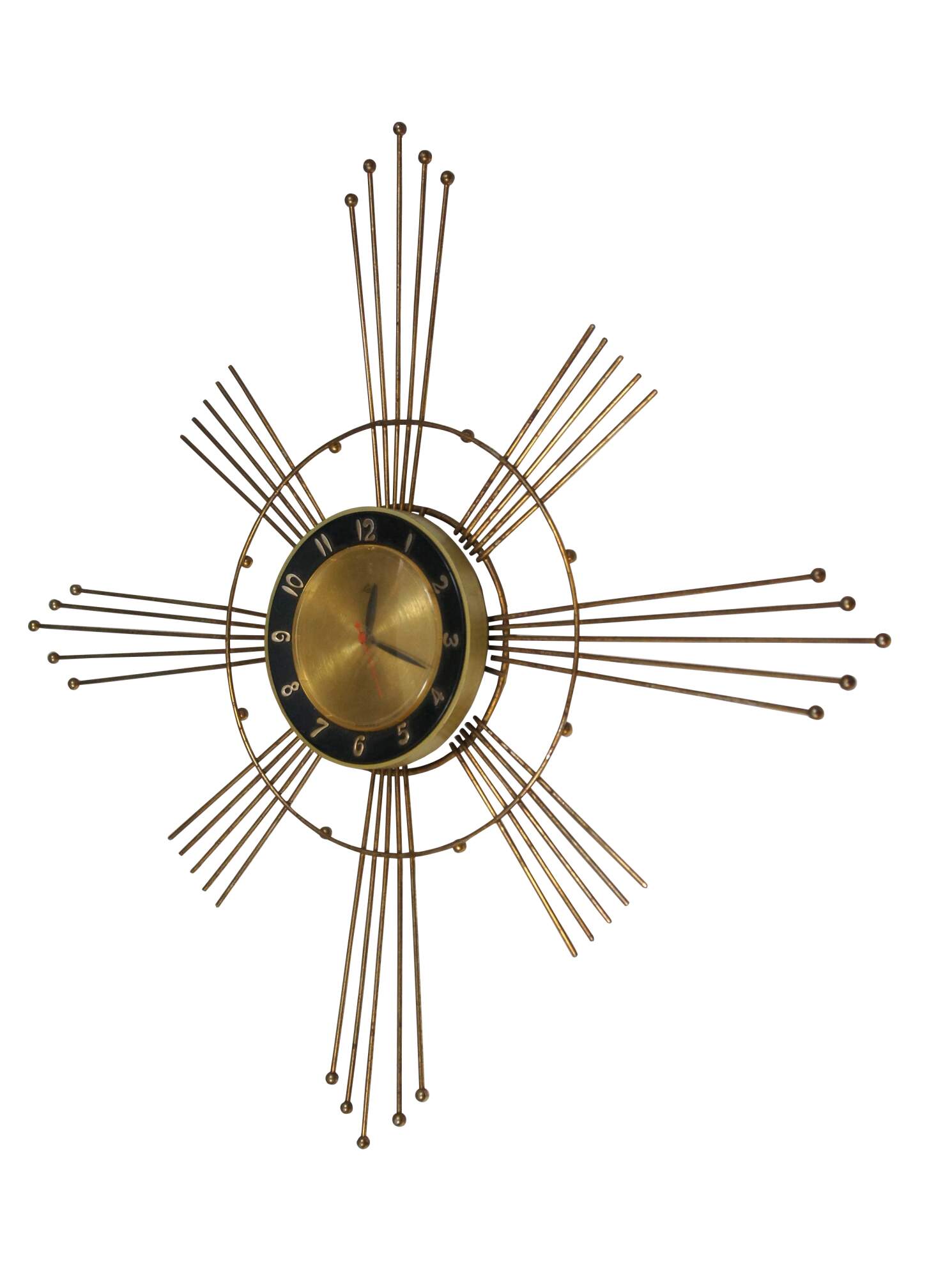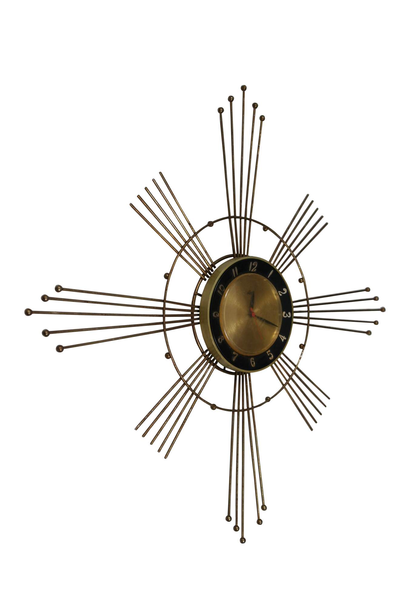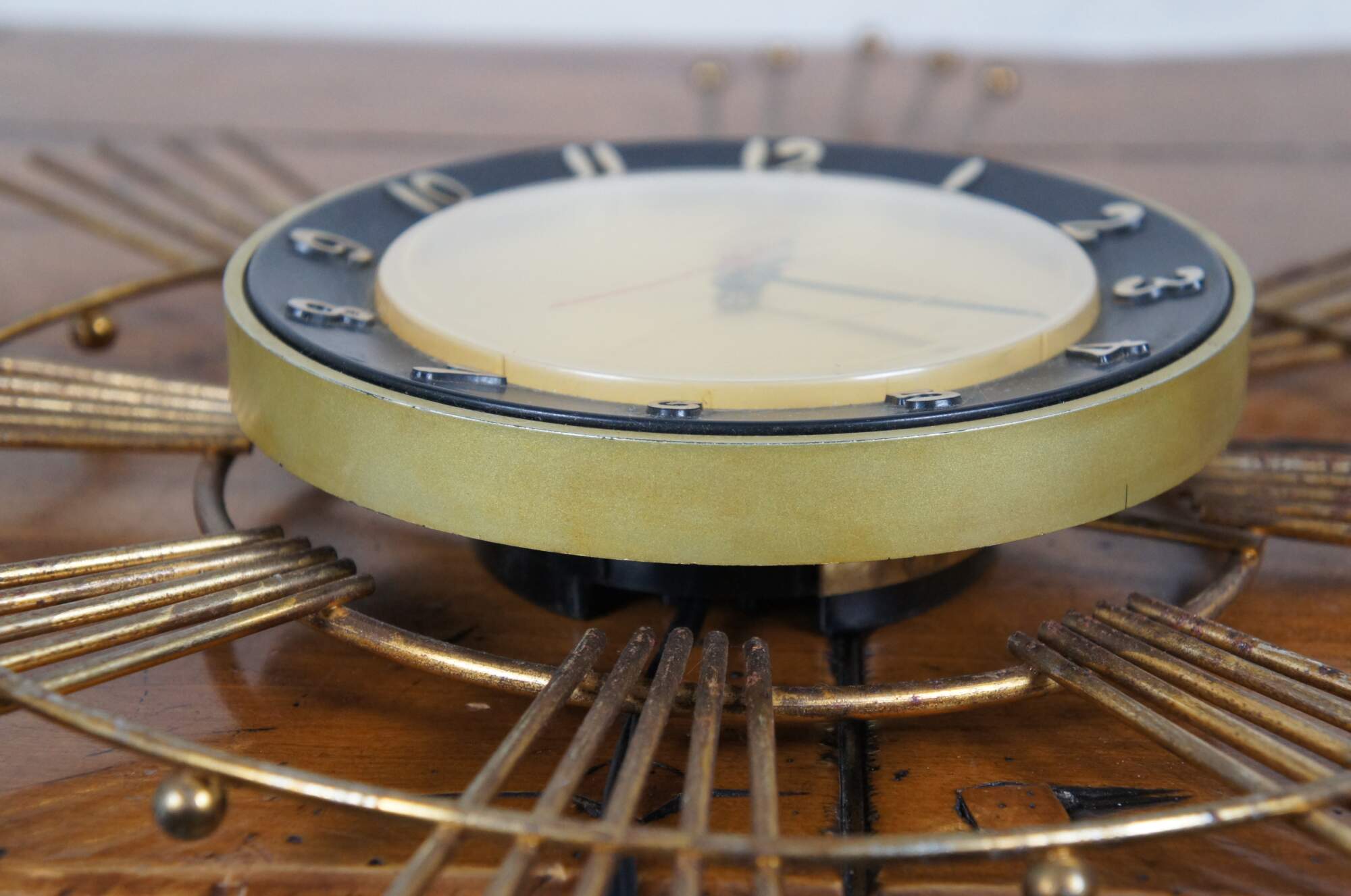 Mid 20th century electric / plug in wall hanging clock. Mid century modern / atomic brass sunburts / starburst with graduated rays and circular frame accented with brass balls. Gold tone plastic face with black frame; gold Roman numerals; black hands. Robertshaw Fulton Controls Company - Lux Time Division - 3 Watts - 60 Cyc - 115 Volts AC Only. Made in USA.