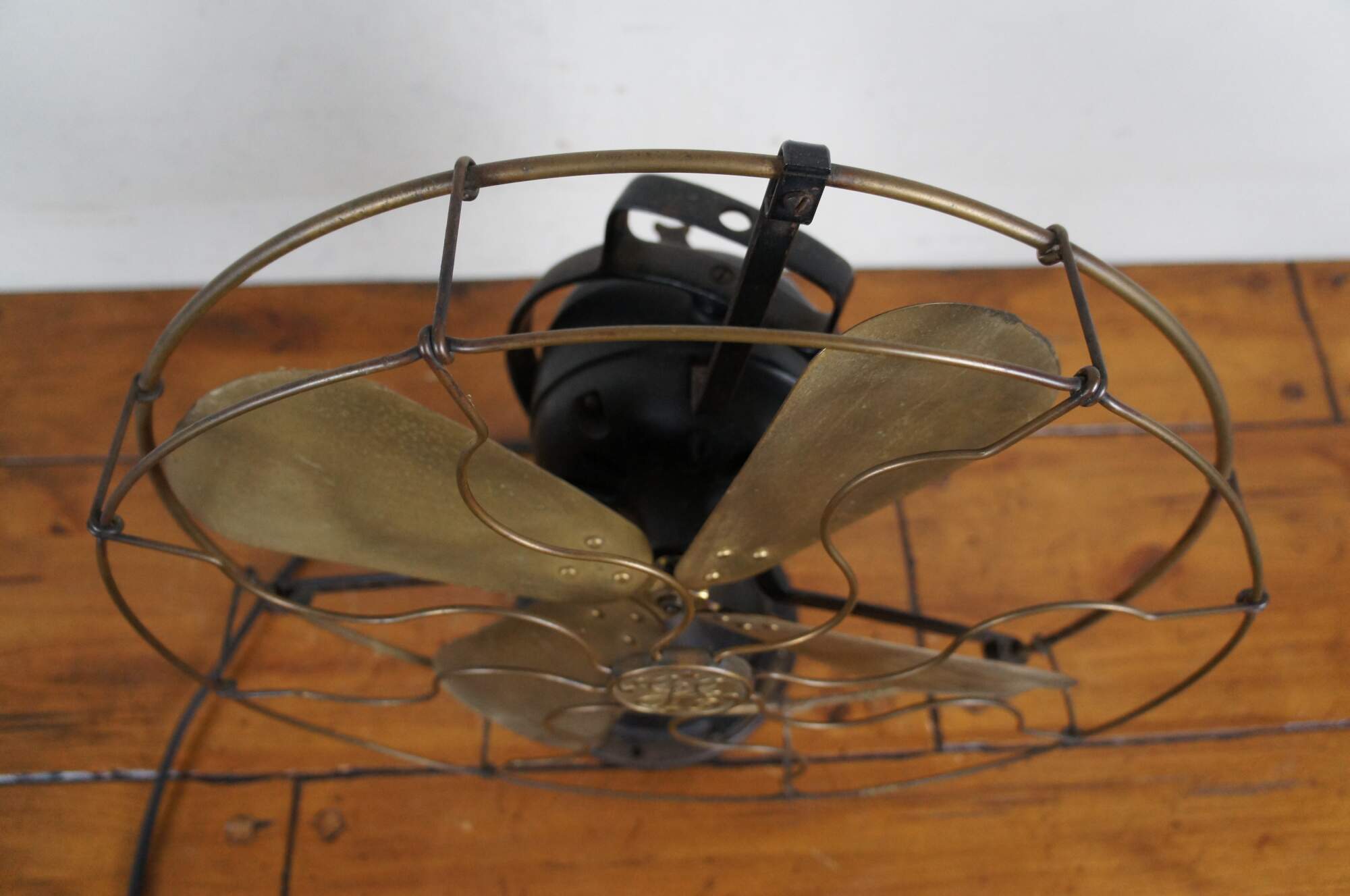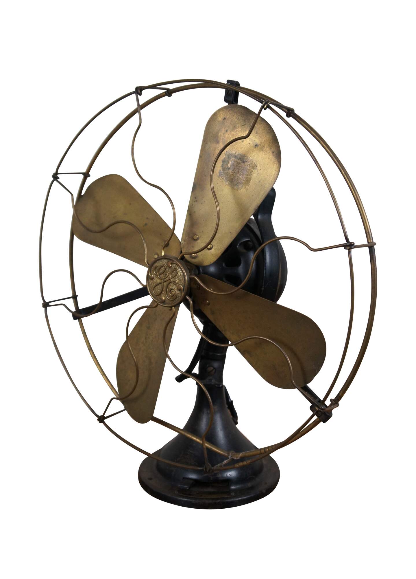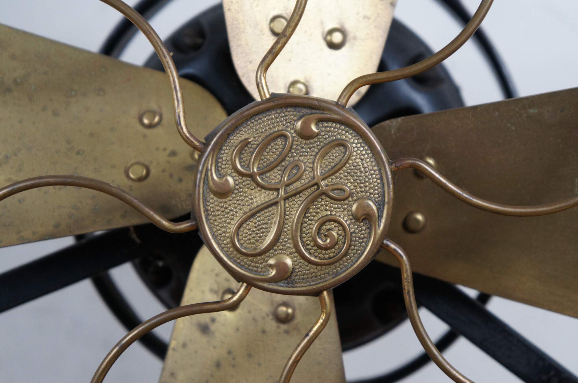 Large antique 1915 2-Star / Loop handle desk fan by General Electric. Black painted steel housing with four brass blades / wings and cage with serpentine bars. Three speed; oscillating; sliding switch. Alternating Current Fan Motor / No. 1092974 / Cat. 75425 / Type A0 / Form R5 / Volts 110 / Cycles 60 / General Electric Co USA. 16"d blades.