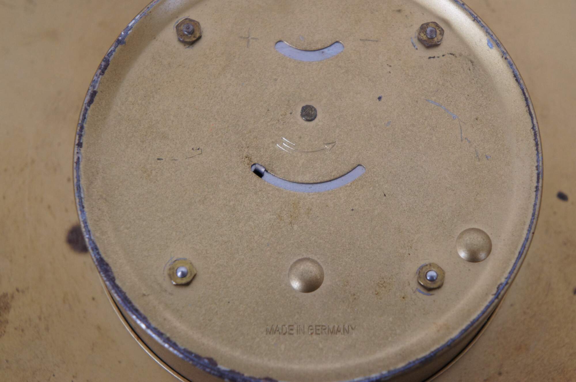 Mid 20th century Junghans key wound, wall hanging brass sunburst clock. Graduated rays accented with three-lobed hammered leaves; white painted face framed with small petals; numbered with raised brass pips; leaf shaped metal hands. Movement marked: Gabruder Junghans / A-6 / Made in Germany / 4 - Four Jewels / Unadjusted / W271 / 50.