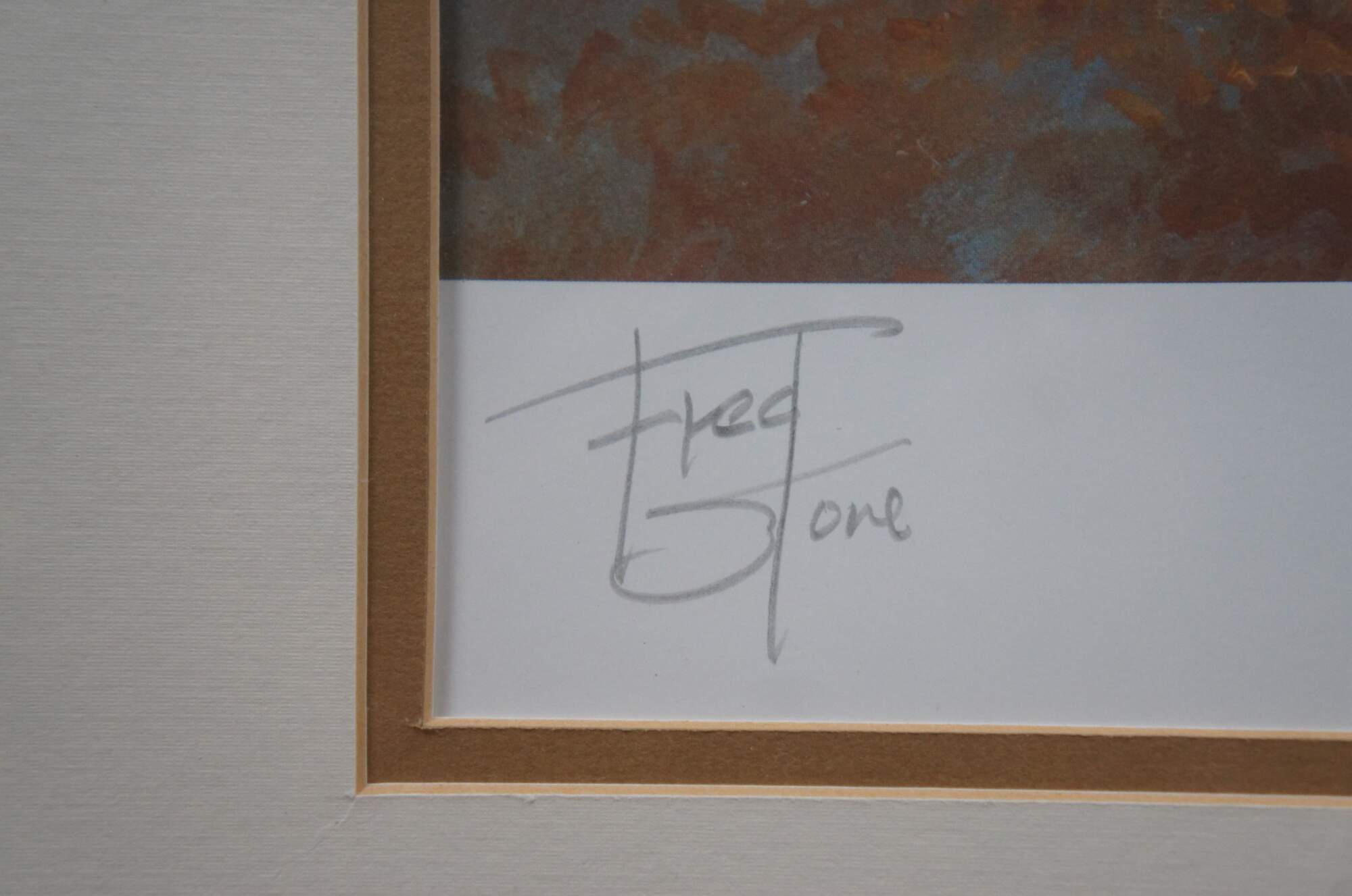 "Fred Stone (1930-2018) was born April 13, 1930 in St. Louis, Missouri, the second son of Sam and Dorothy Stone. When Fred was three years old his family moved to the Fairfax district in Los Angeles, where Fred grew up loving both art and baseball. Attending Art Center College in Los Angeles and doing stints at Choinard and Otis, Fred was well on his way to a career as a commercial artist. Landing a job at the Advertising Agency Stevens-Gross on Michigan Avenue in Chicago, Fred began honing his ability to tell stories through art working on illustrations for various clients. Grueling deadlines and a "Mad Men" lifestyle just didn't fit with Fred's style, so he and his wife, Norma, moved back to California, where he parlayed his artistic skills into Hollywood. Painting background flats for such TV shows as 'Gunsmoke', 'Rawhide', and 'Laugh-In', Fred loved the creativity and large scale that scene painting for the Studios gave him. But by 1956, after the birth of both his daughter Laura and son Russell, finances were tight. An opportunity arose at Monogram Industries - a company his brother was CEO of - and Fred saw the importance of financial stability and accepted a full-time position. Working his way up to National Marketing manager in the Marine division, he helped shape federal laws regarding boat and pleasure craft pollution in America’s waterways. But it was the business skills he honed during his time at Monogram that helped shape his return to the art world, and gave him the confidence to start his own company with his wife Norma – Equinart Inc. in 1975. During this time his daughter, Laura, had become an assistant for famed trainer Charlie Whittingham and it was through her that Fred was introduced to the world of Horse Racing. Working on the backside of the Santa Anita Racetrack, Fred meet many of the greats of horse racing – Shoemaker, McCarron, Delahoussaye, Pincay and Stevens. Soon Fred was painting again and getting commissions. Since that time, Fred has painted the greats of racing history – Barbaro, Secretariat, Zenyatta – and the men and women that helped make that history happen, all with a unique style and passion. With a catalog of over 150 paintings, many have been prized by collectors and horse enthusiasts alike." (Source: Fred Stone / Equinart Inc)