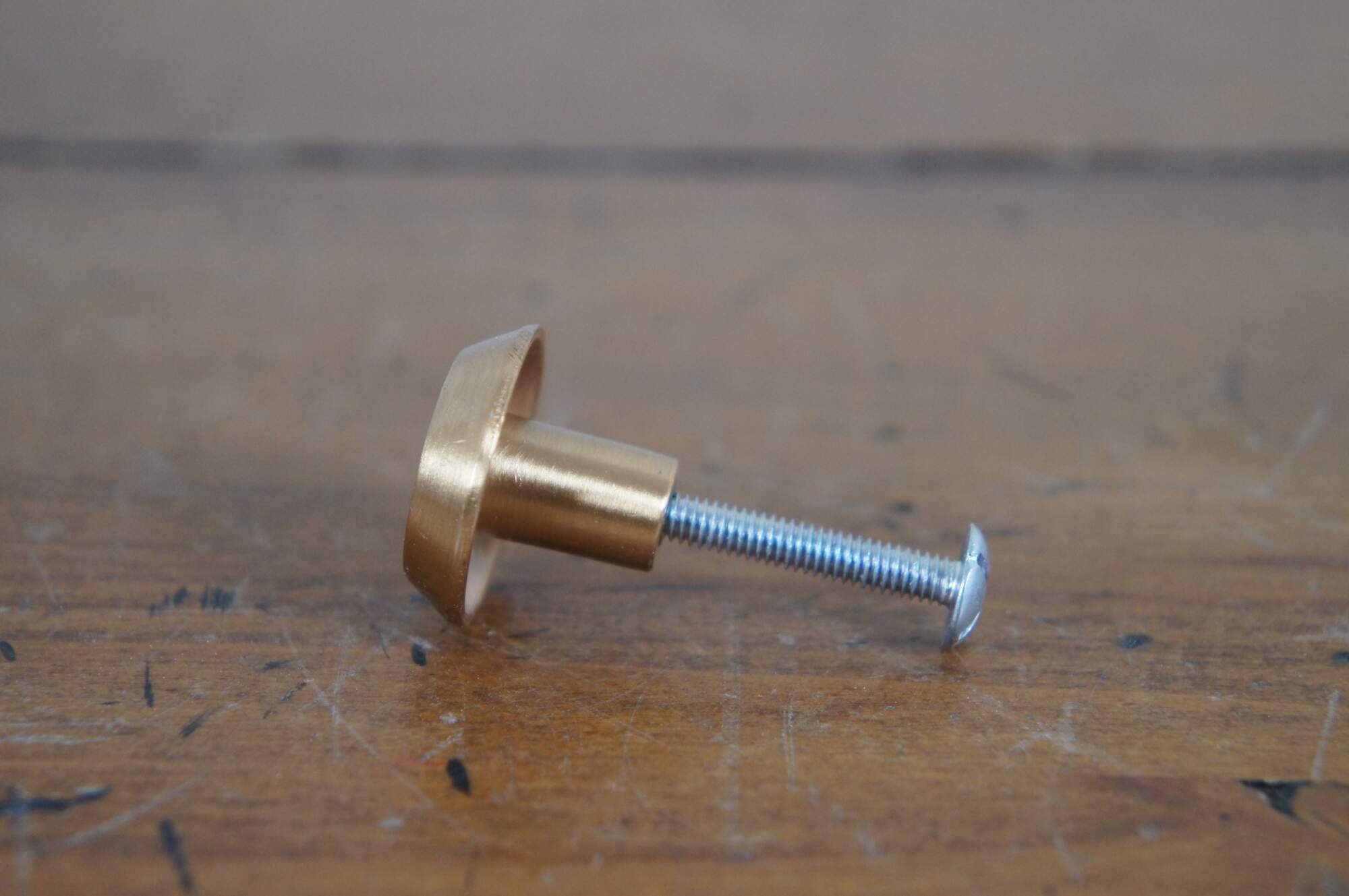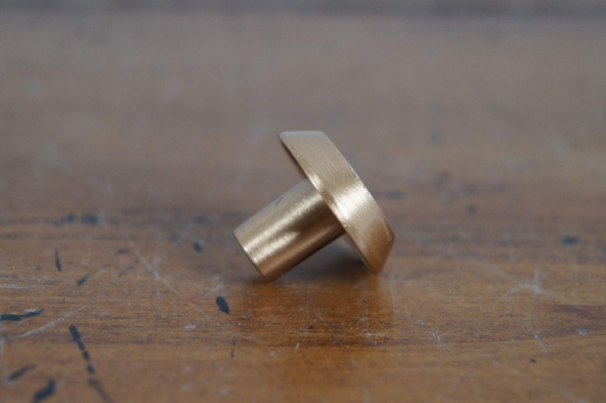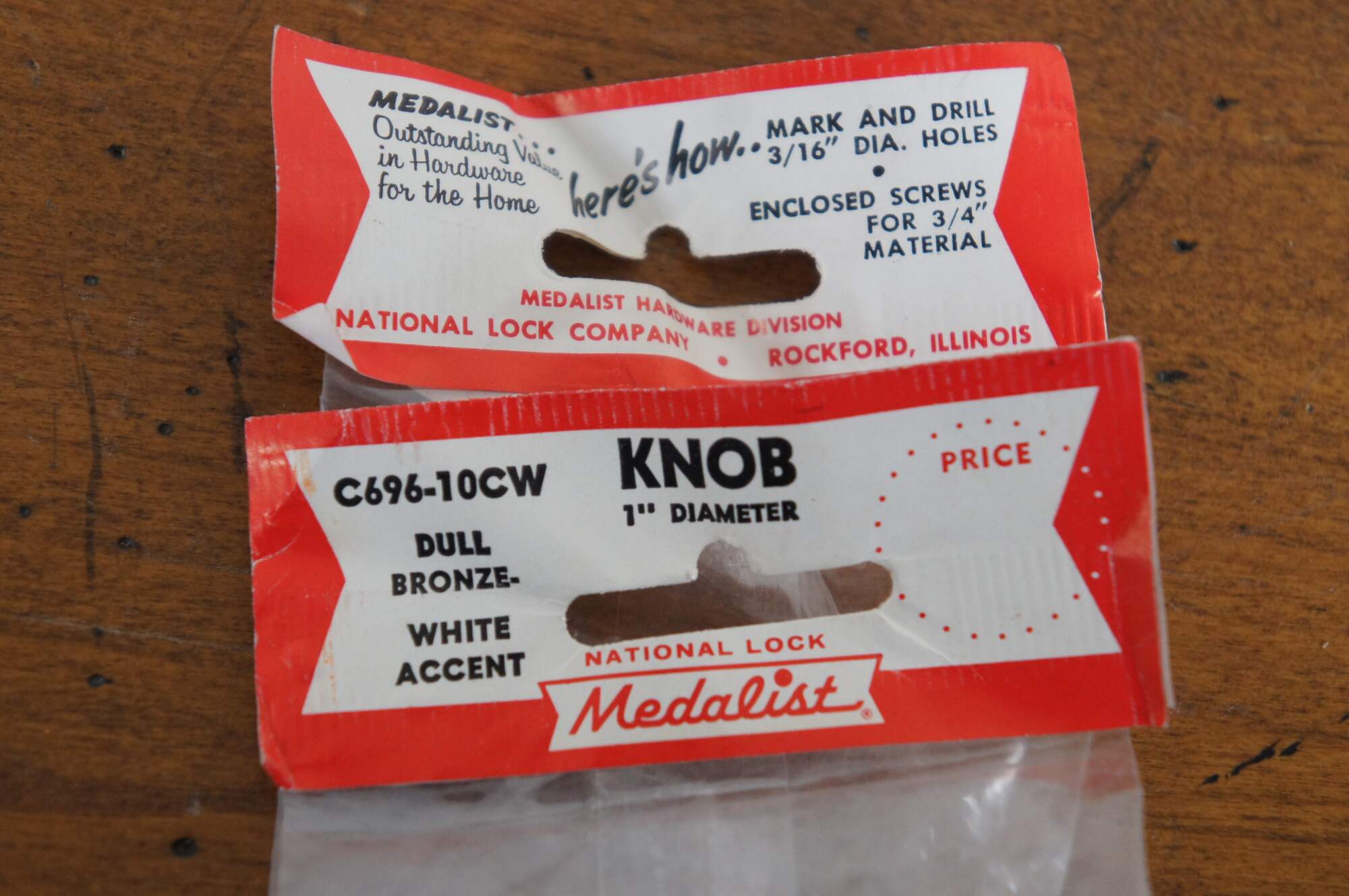 40 Available - Mid to late 20th century old-stock die cast drawer / cabinet pulls. National Lock Company - Medalist, item number C696-10CW Knob, Dull Bronze - White Accent. Mid Century Modern styling. Round shape with beveld outer edge and concave surface, decorated with mottled white enamel.