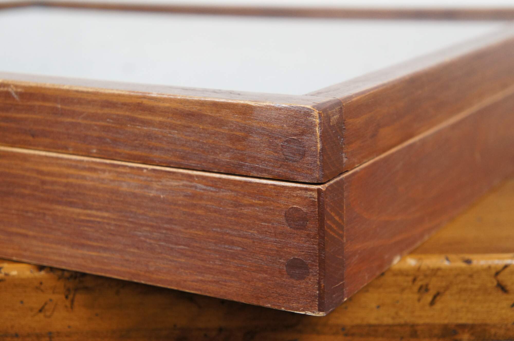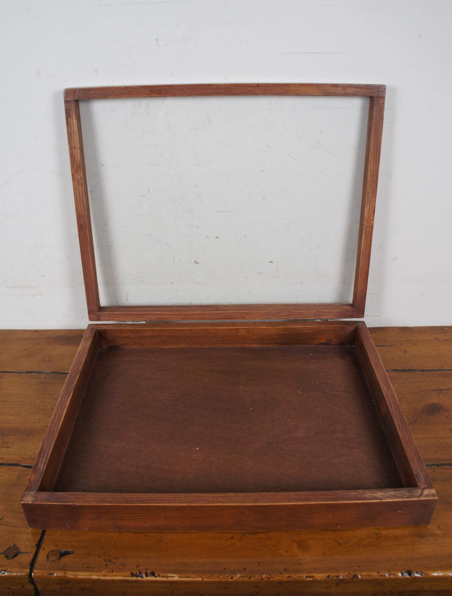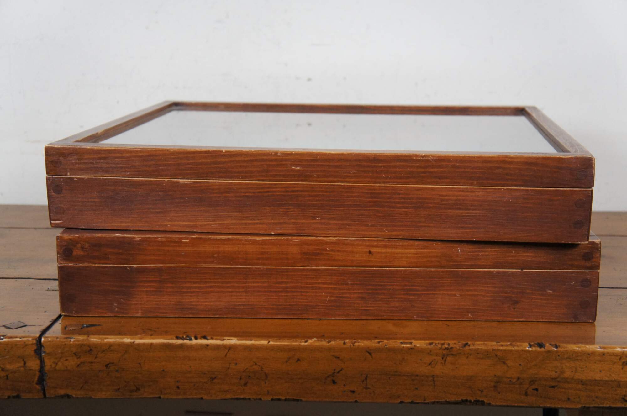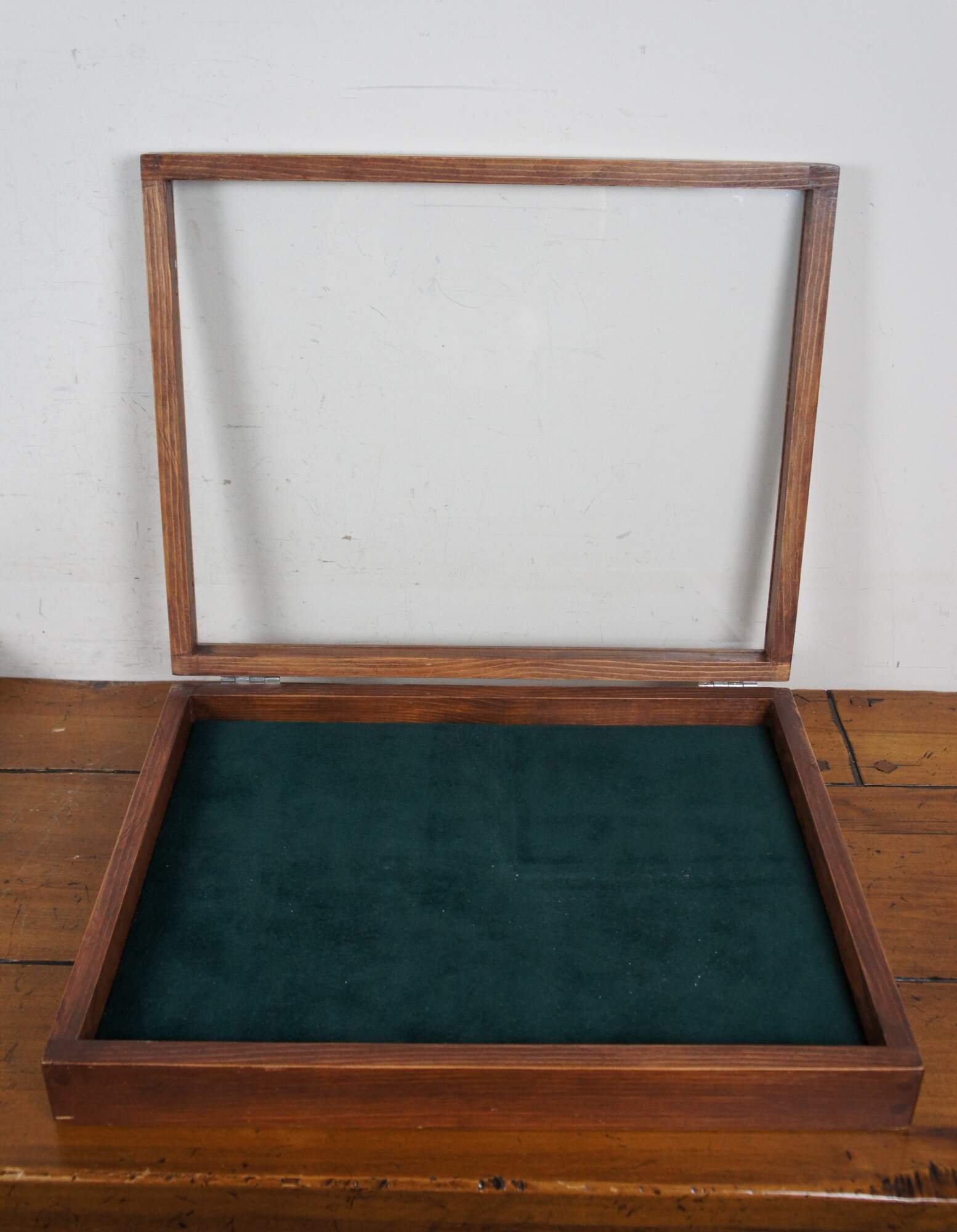 Pair of 20th century countertop / tabletop display cases / showcases / shadow boxes. Made of hardwood with glass fronted lids. One lined with a green velvet jewelry pad. One wood base, one particle board base. Perfect for displaying jewelry or trinkets.