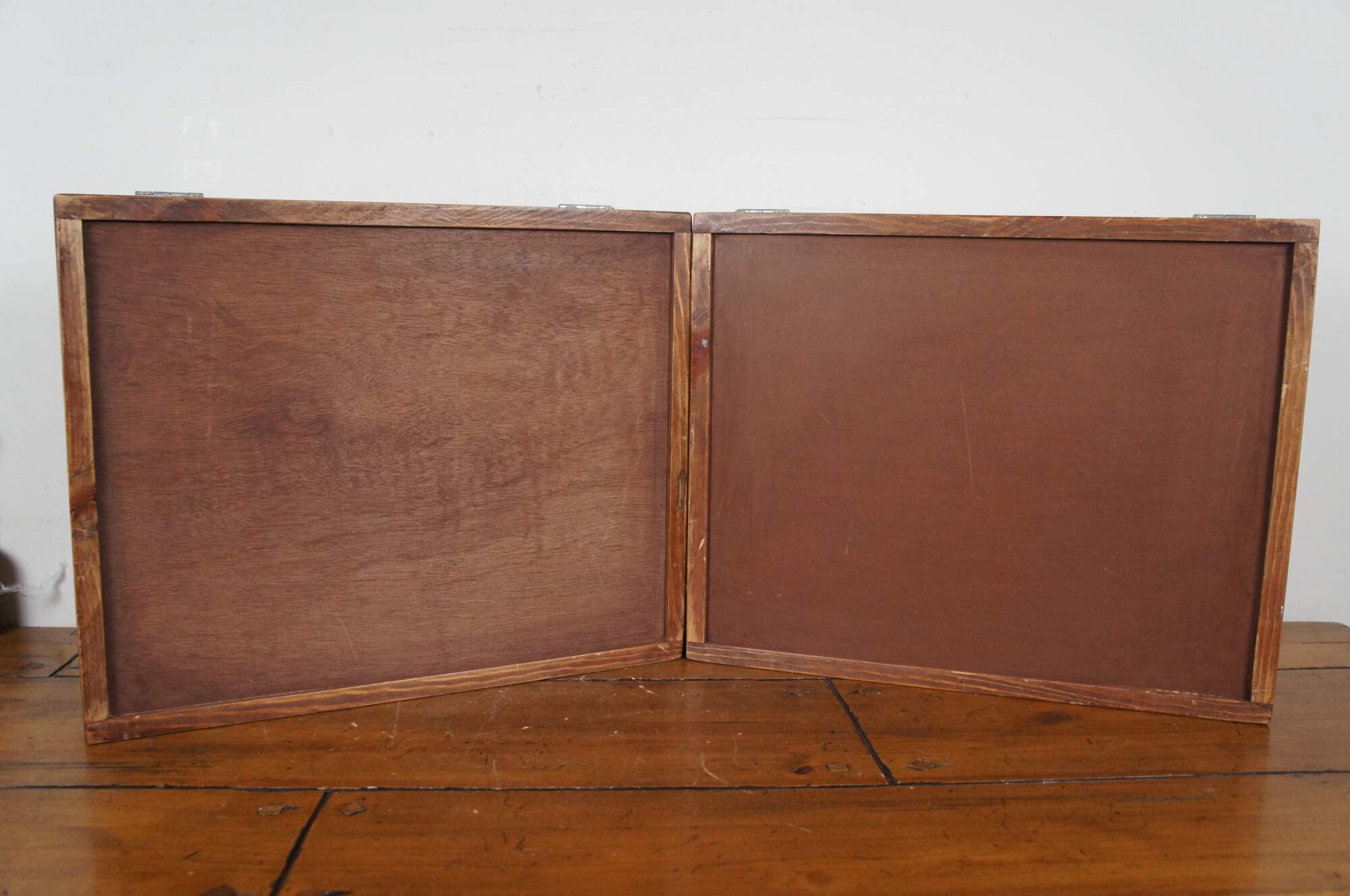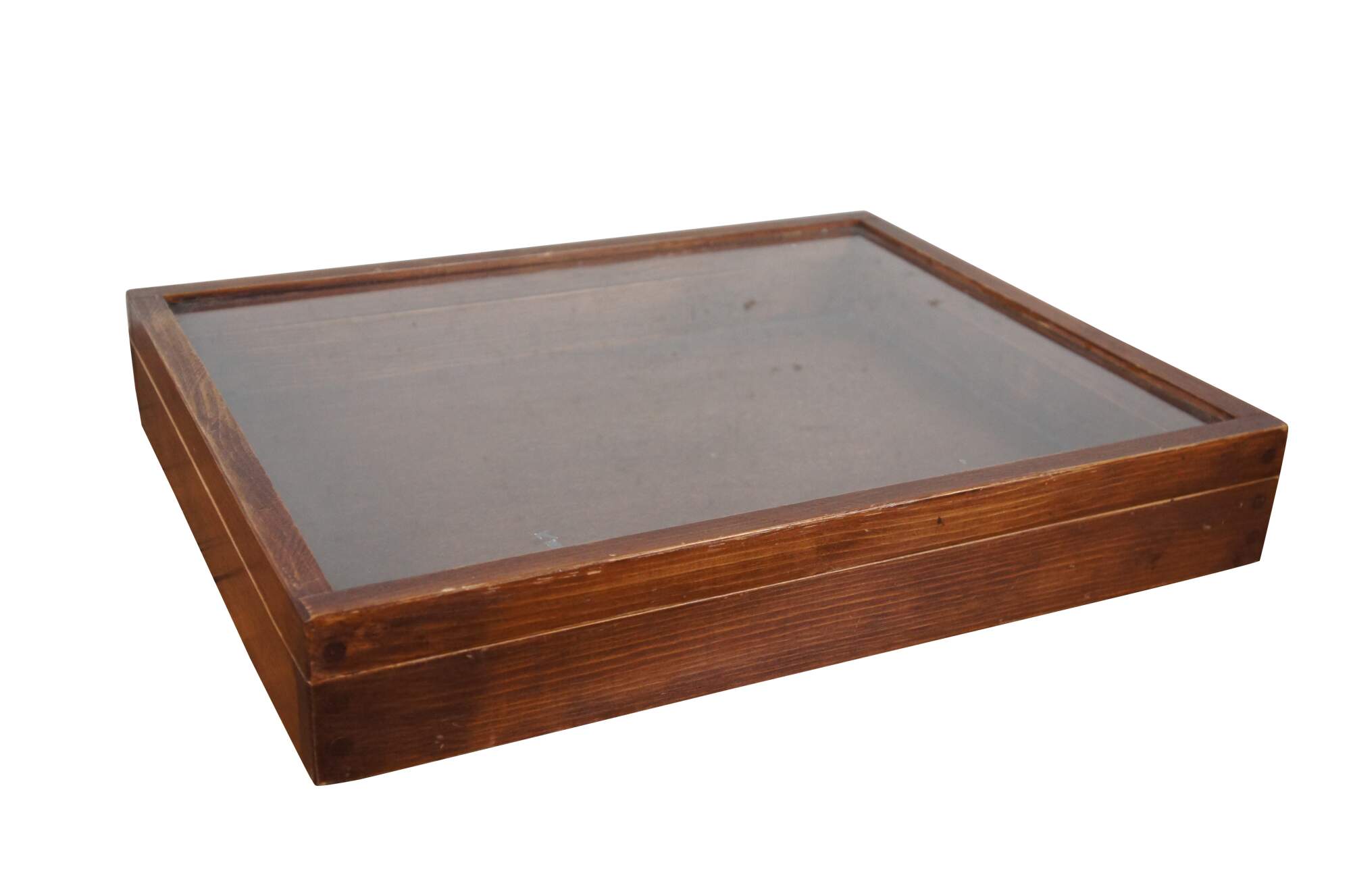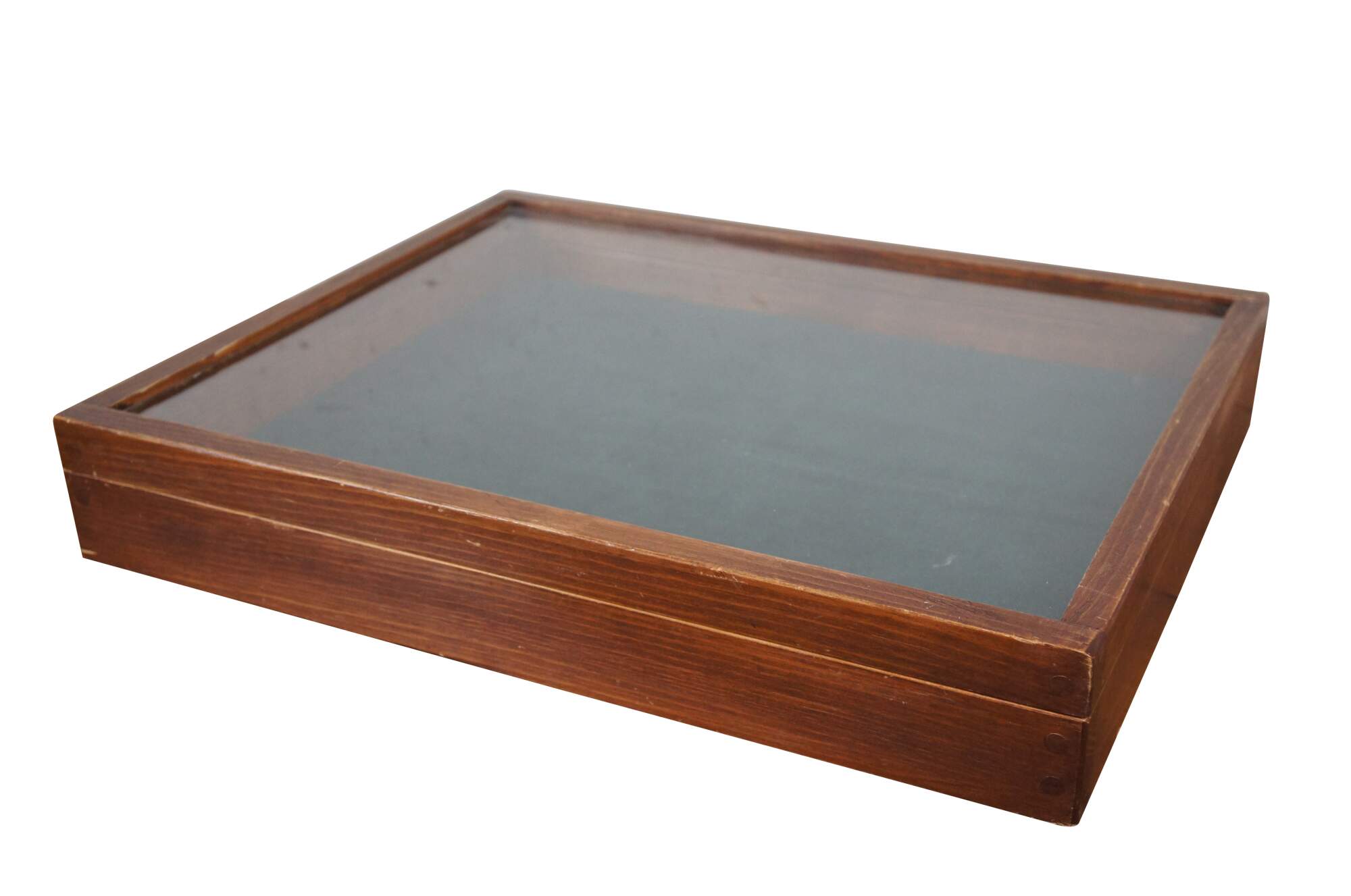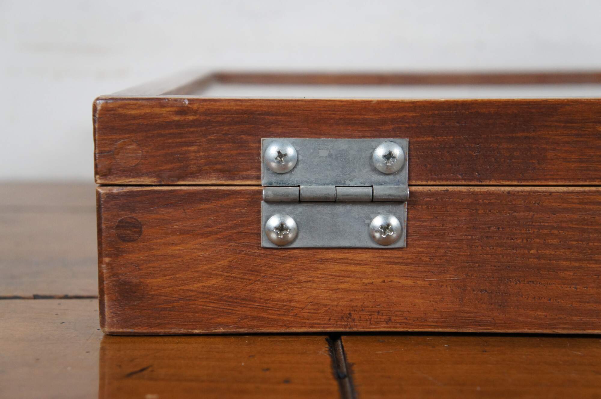 Pair of 20th century countertop / tabletop display cases / showcases / shadow boxes. Made of hardwood with glass fronted lids. One lined with a green velvet jewelry pad. One wood base, one particle board base. Perfect for displaying jewelry or trinkets.