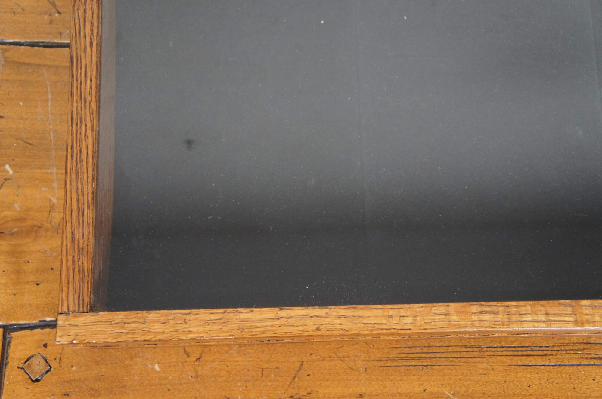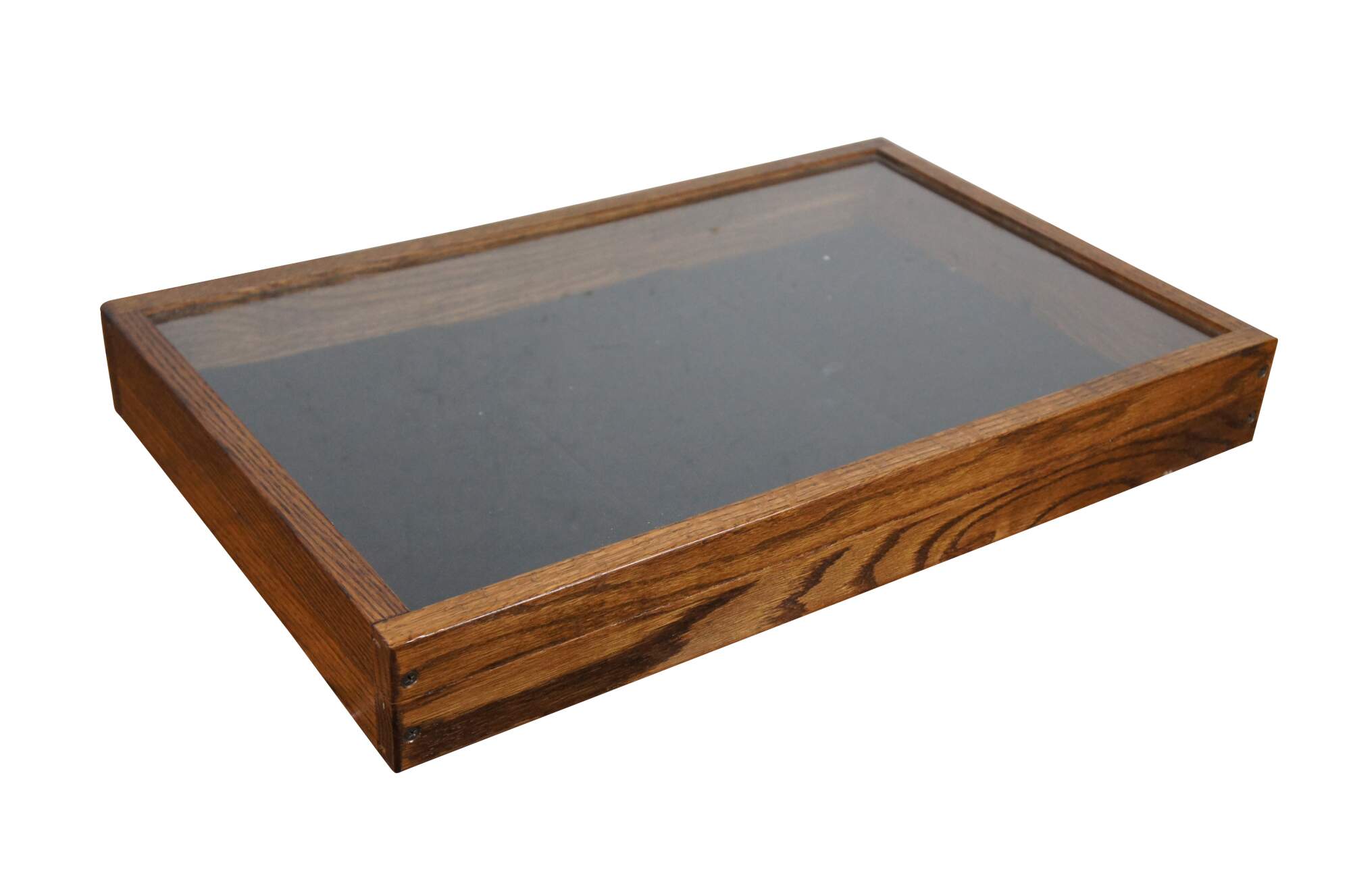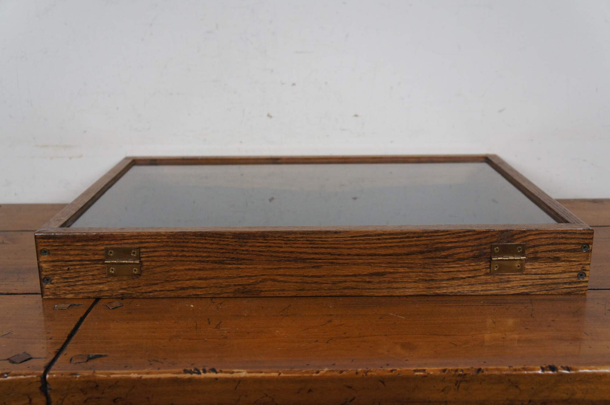 20th century counter top / tabletop display case / showcase / shadow box, made of oak with glass fronted lid. Three black velvet jewlery pads line the interior. Particle board base. Perfect for displaying jewelry or trinkets.
