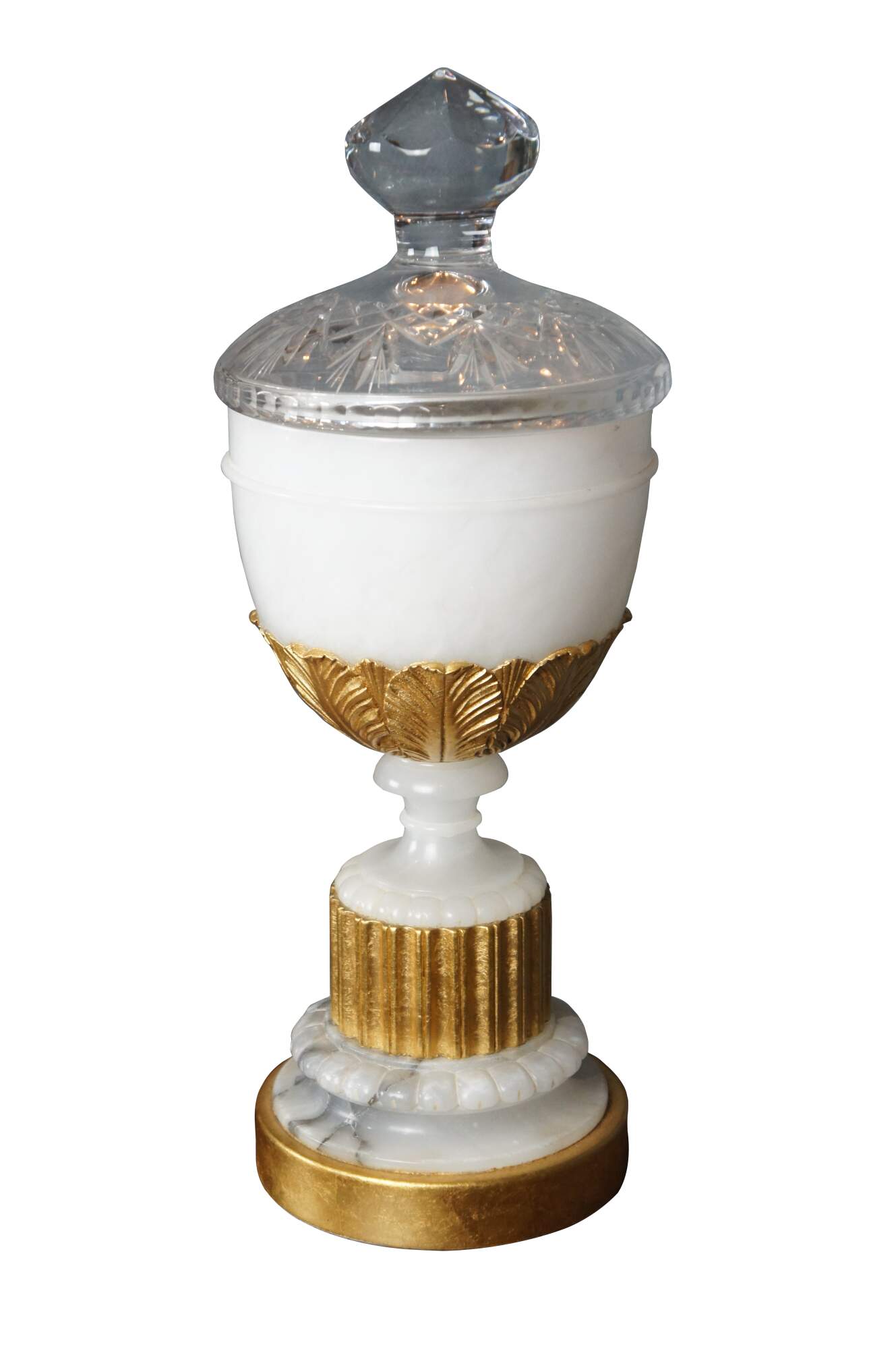 An exceptional marble, cut crystal 24 karet gold painted urn or vase by Lorin Marsh. Features a removable lid and white marble body with acanthus and fluted designs. A nice statement vessel for any setting. Signed along underside