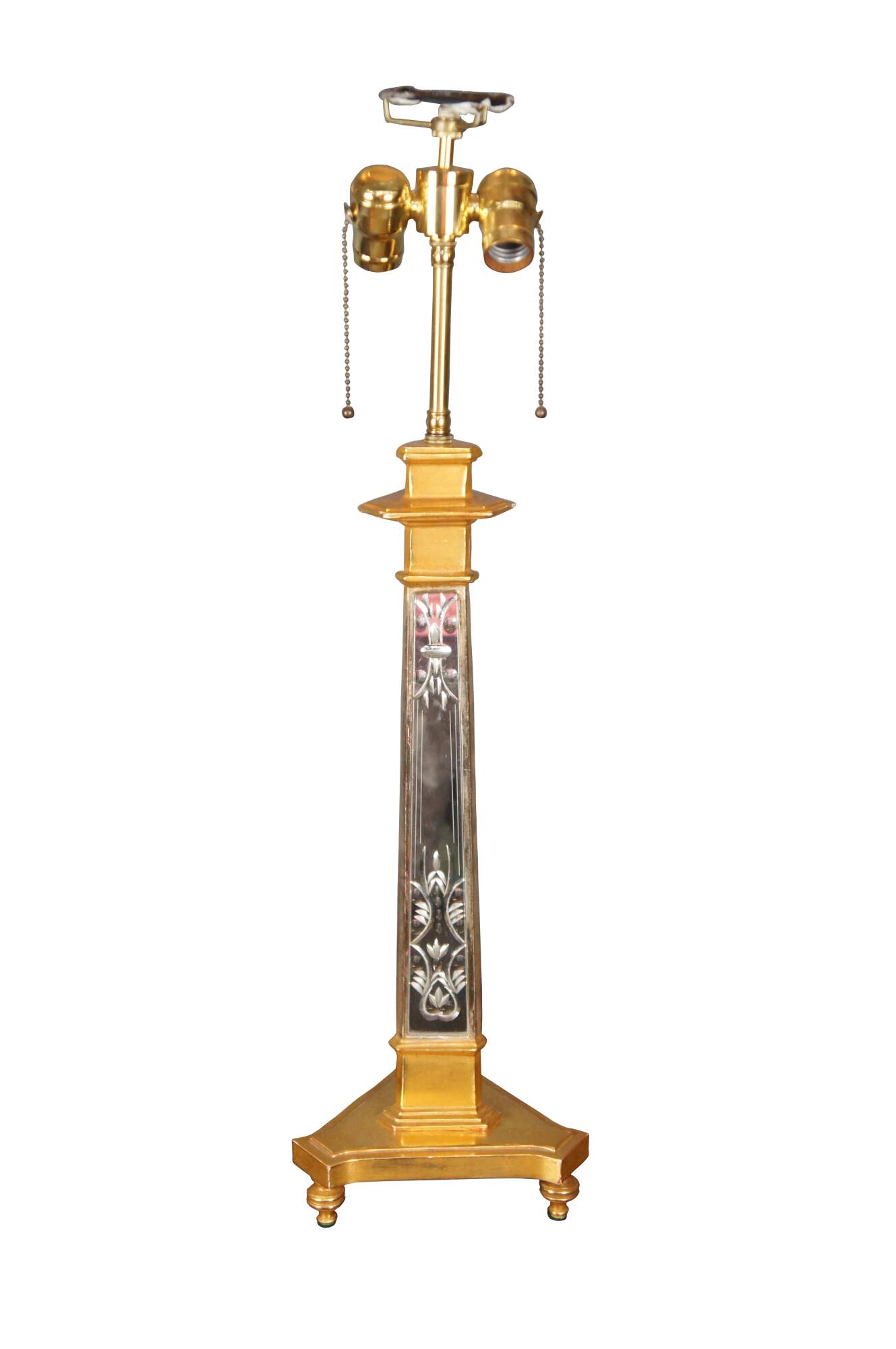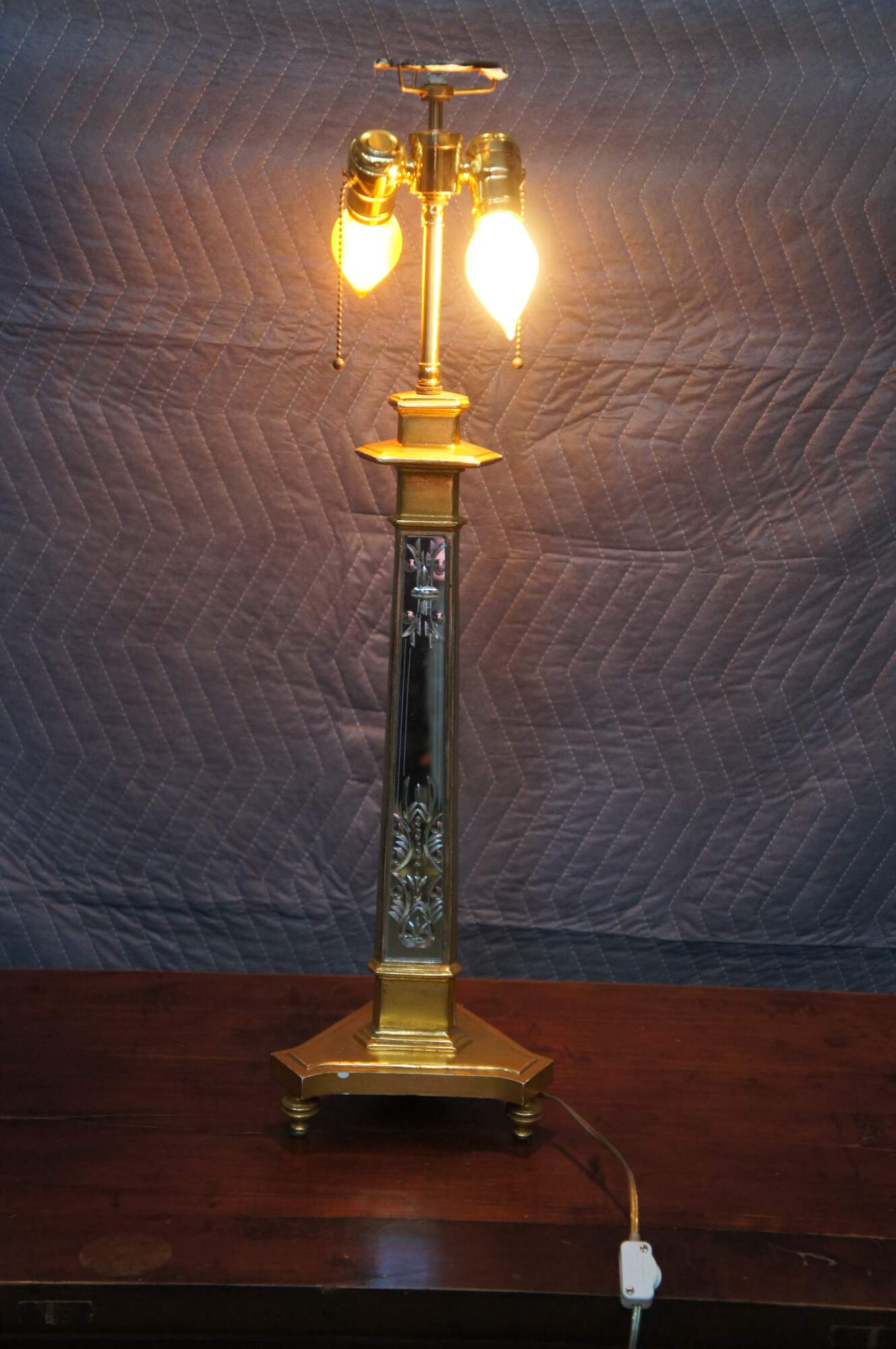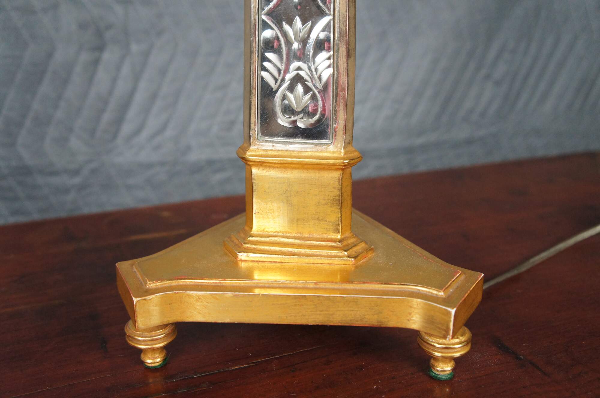 An Art Deco style table lamp. Features a giltwood footed base and triangular prism shaped column with elched and mirrired glass. The lamp has two light with pull switches.