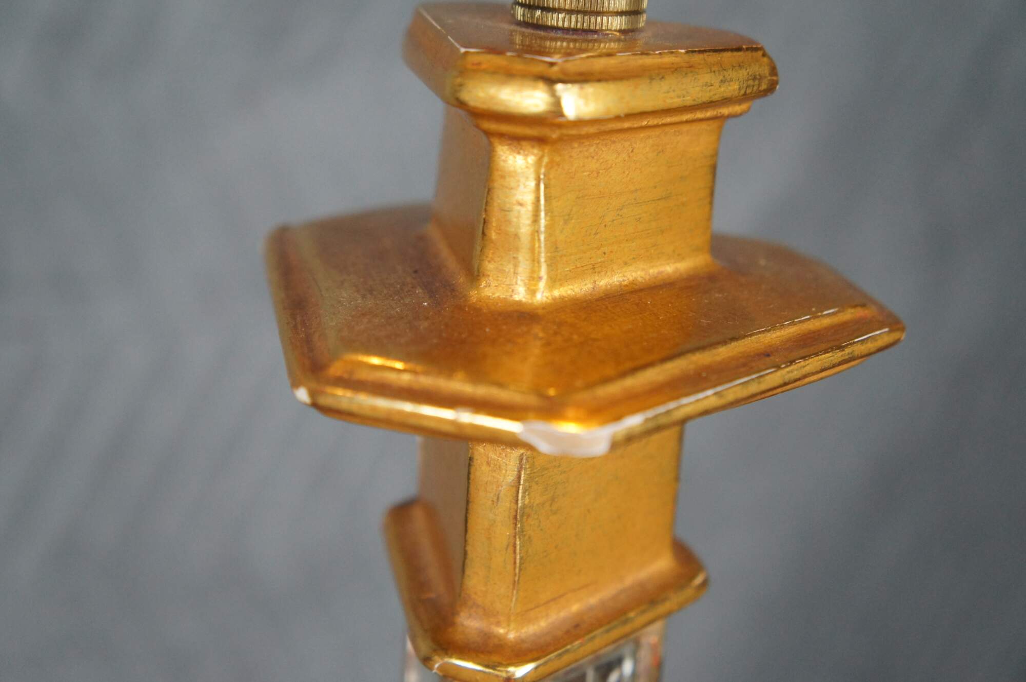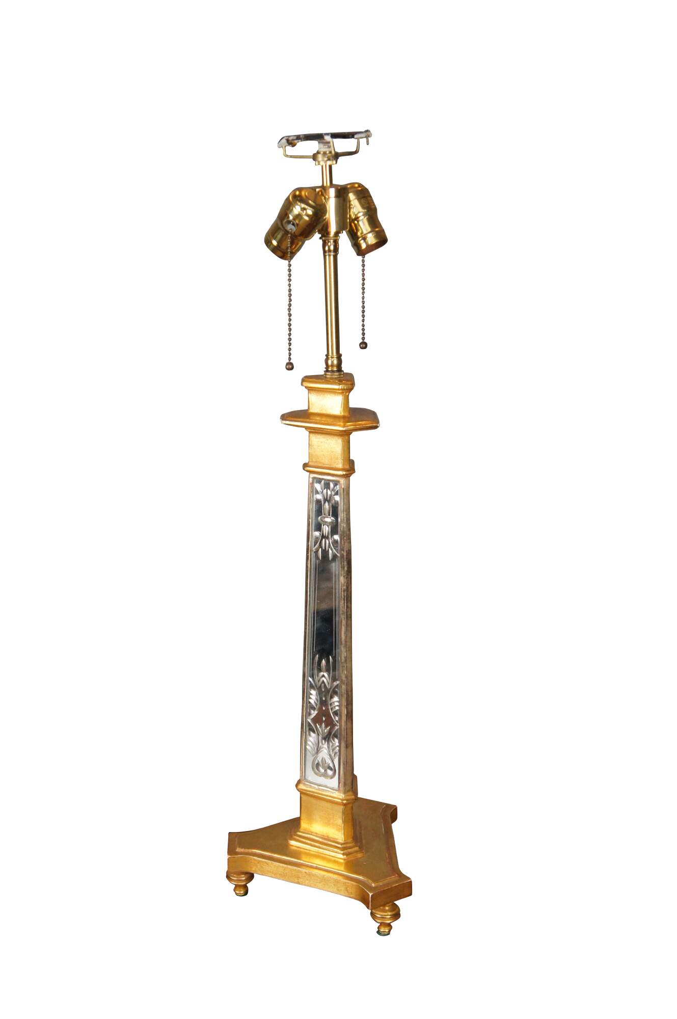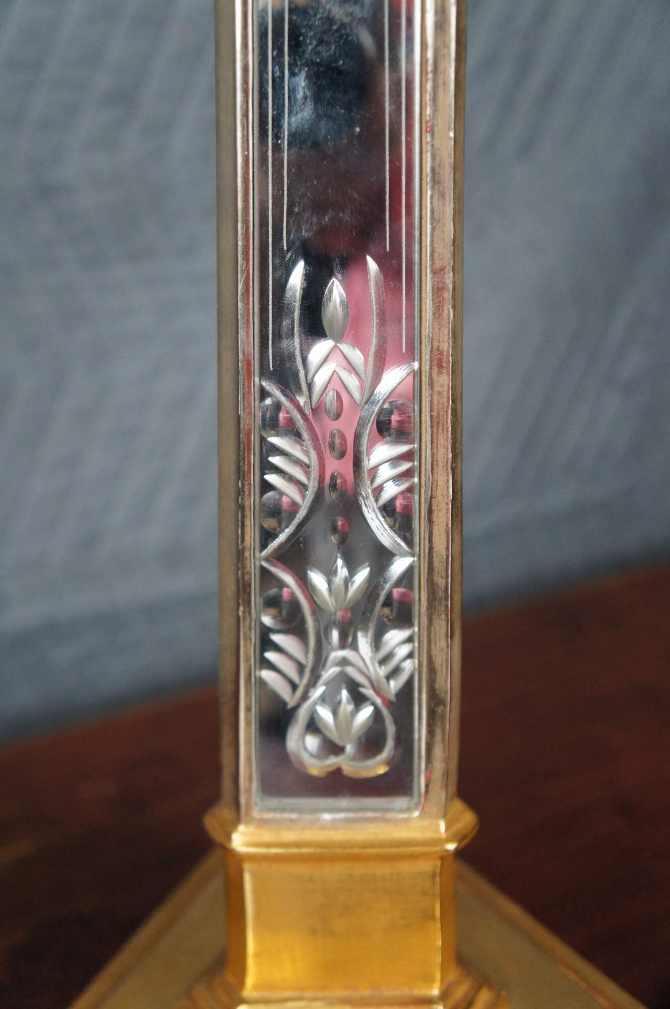 An Art Deco style table lamp. Features a giltwood footed base and triangular prism shaped column with elched and mirrired glass. The lamp has two light with pull switches.