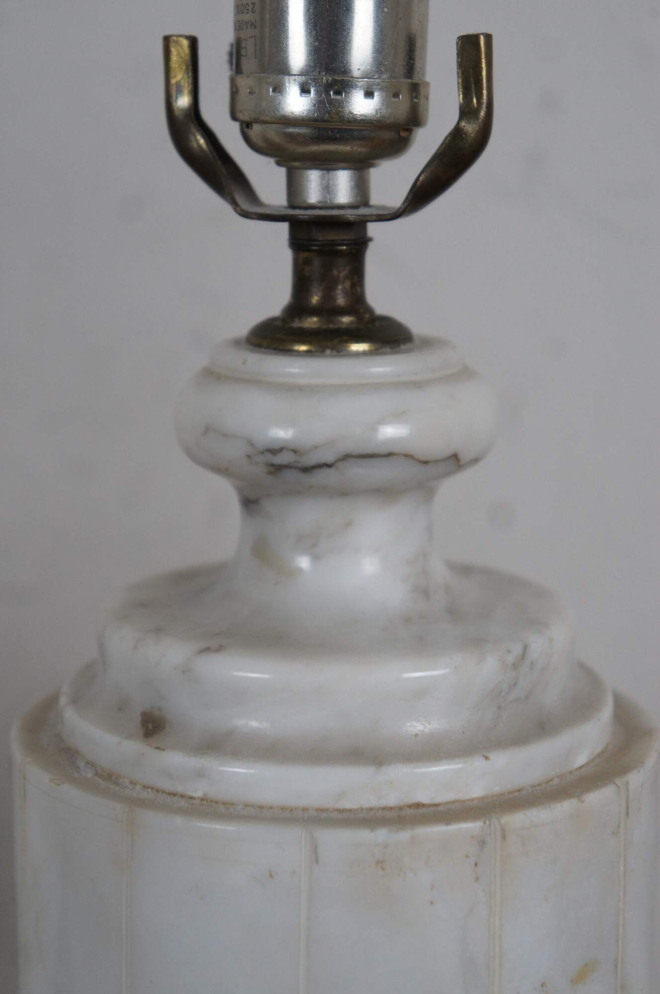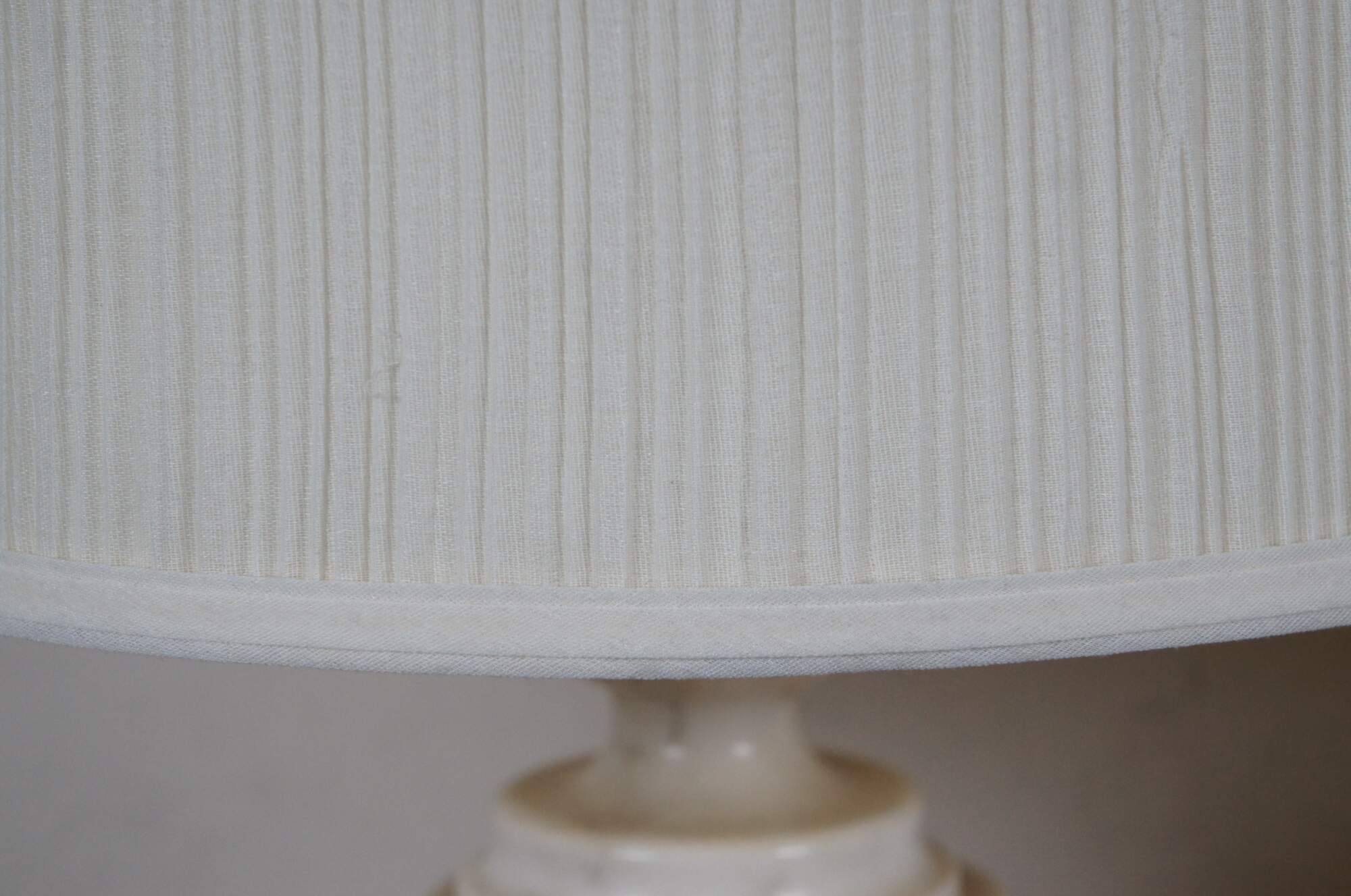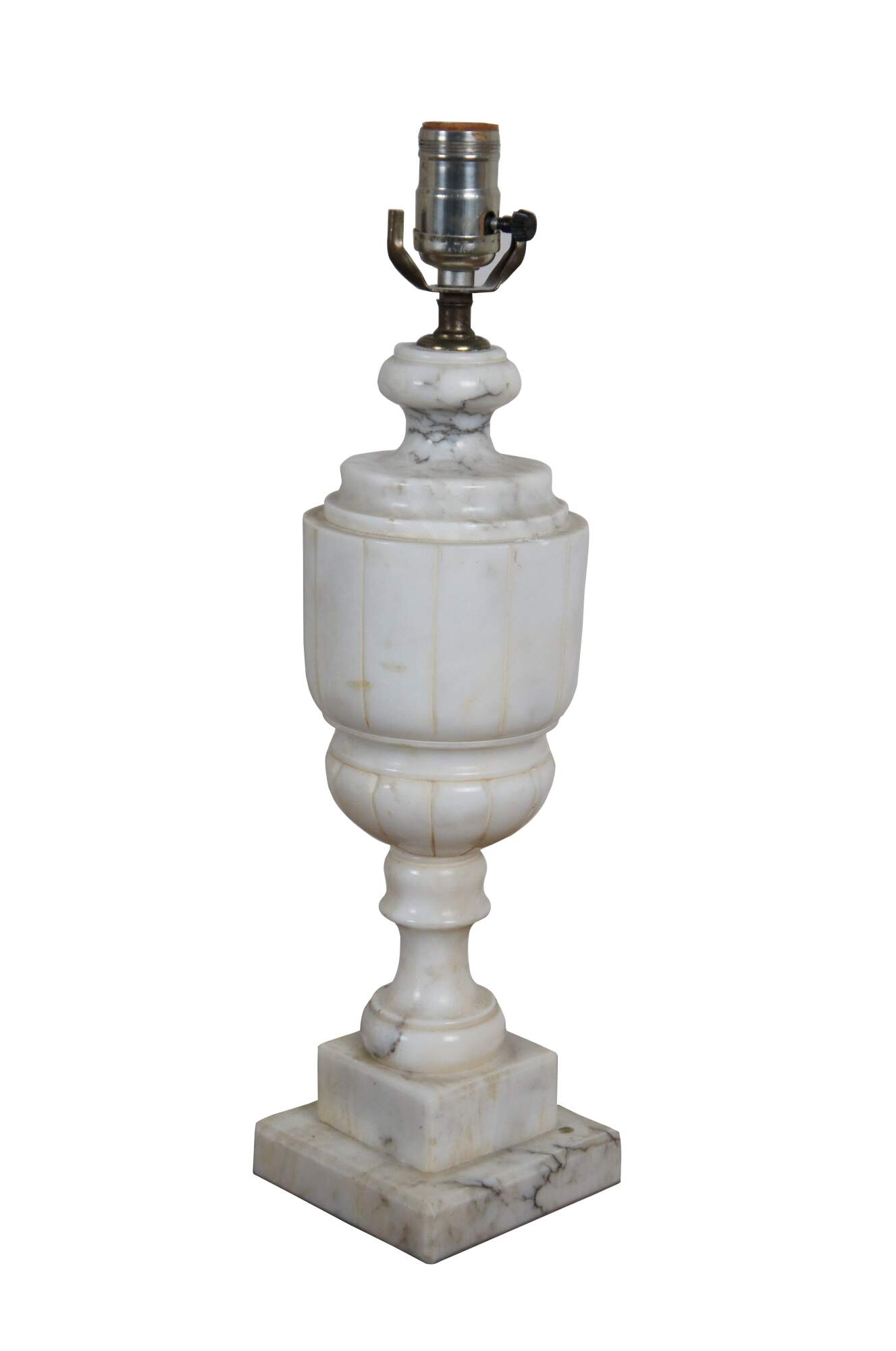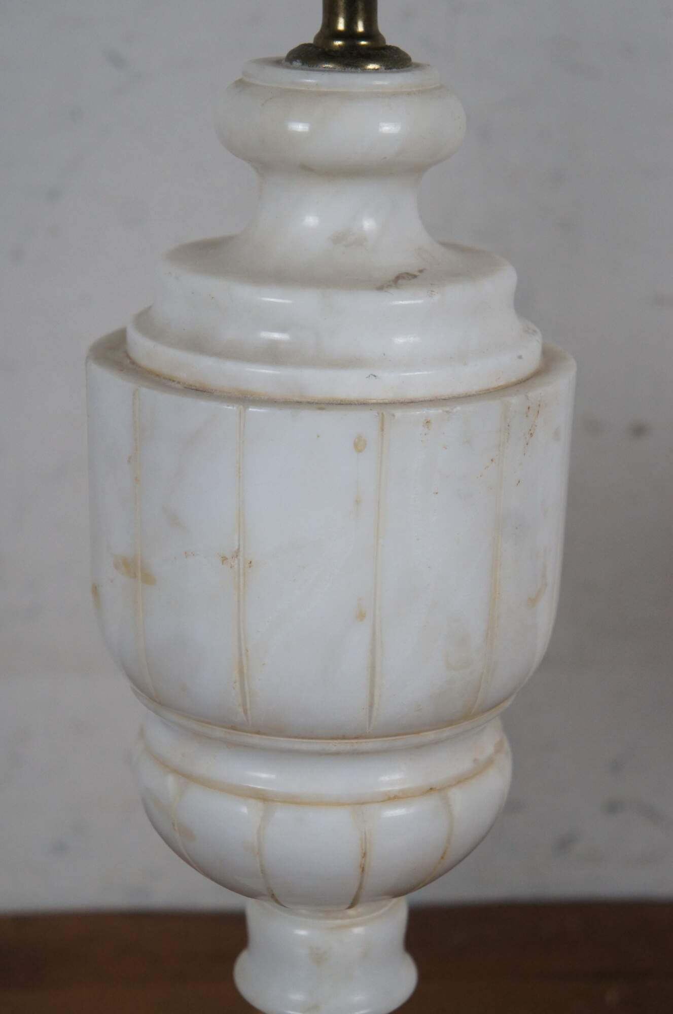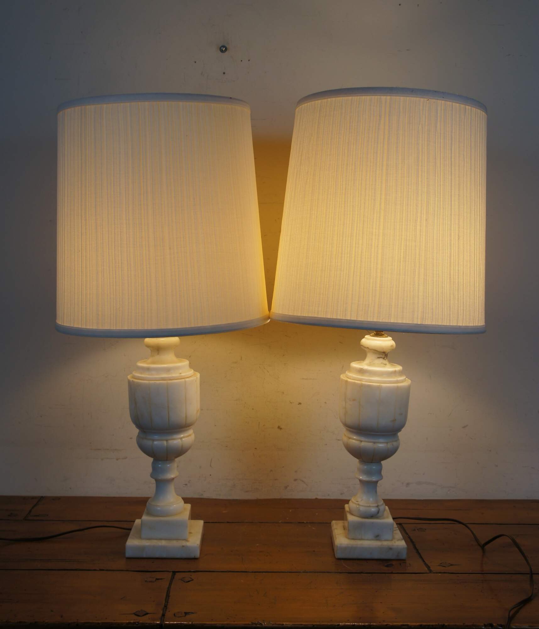 Pair of antique albaster / white marble table lamps, carved in the shape of neoclassical urns. Lamps include dark, turned finials, harps, and pleated cloth shades.