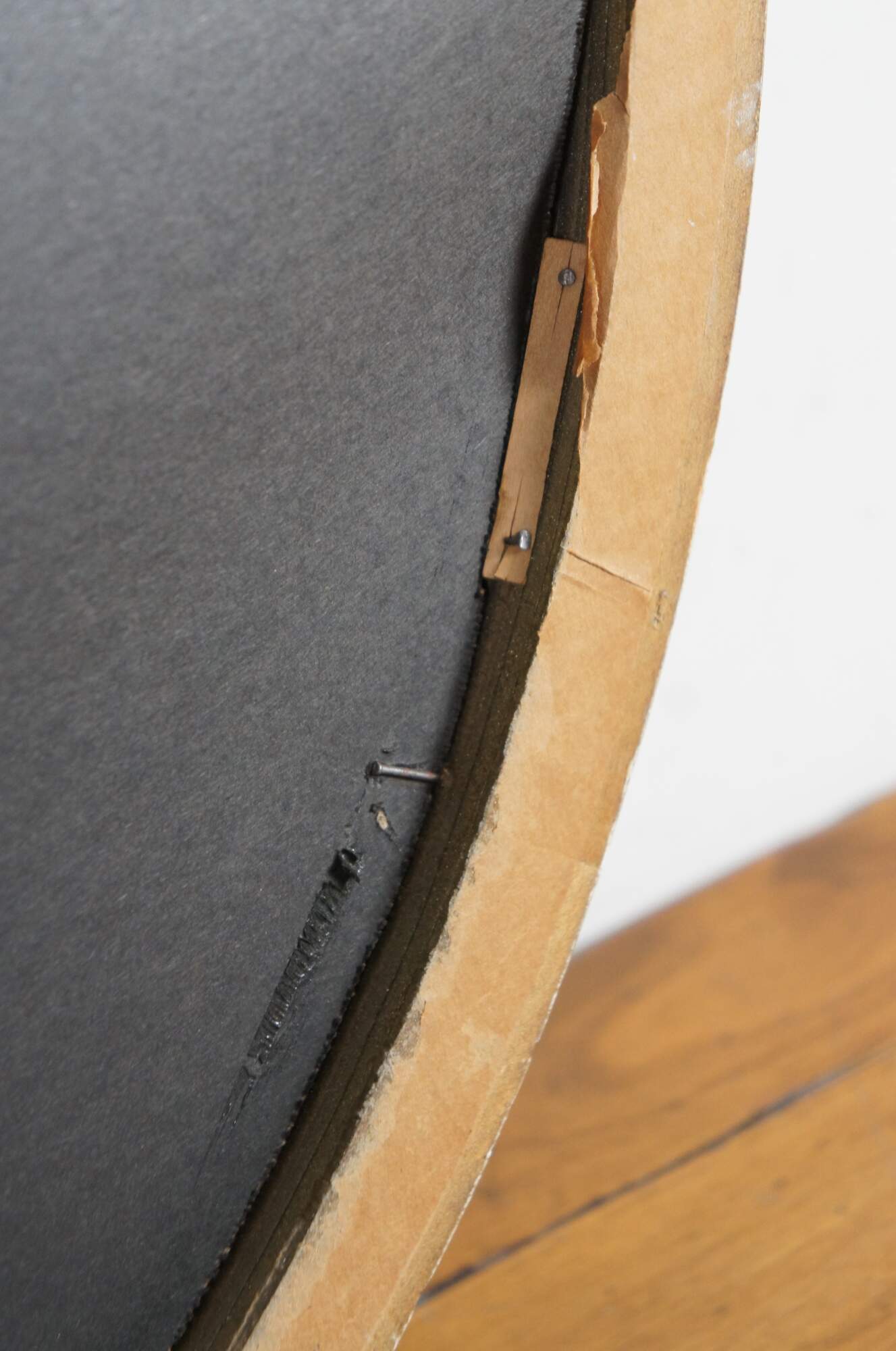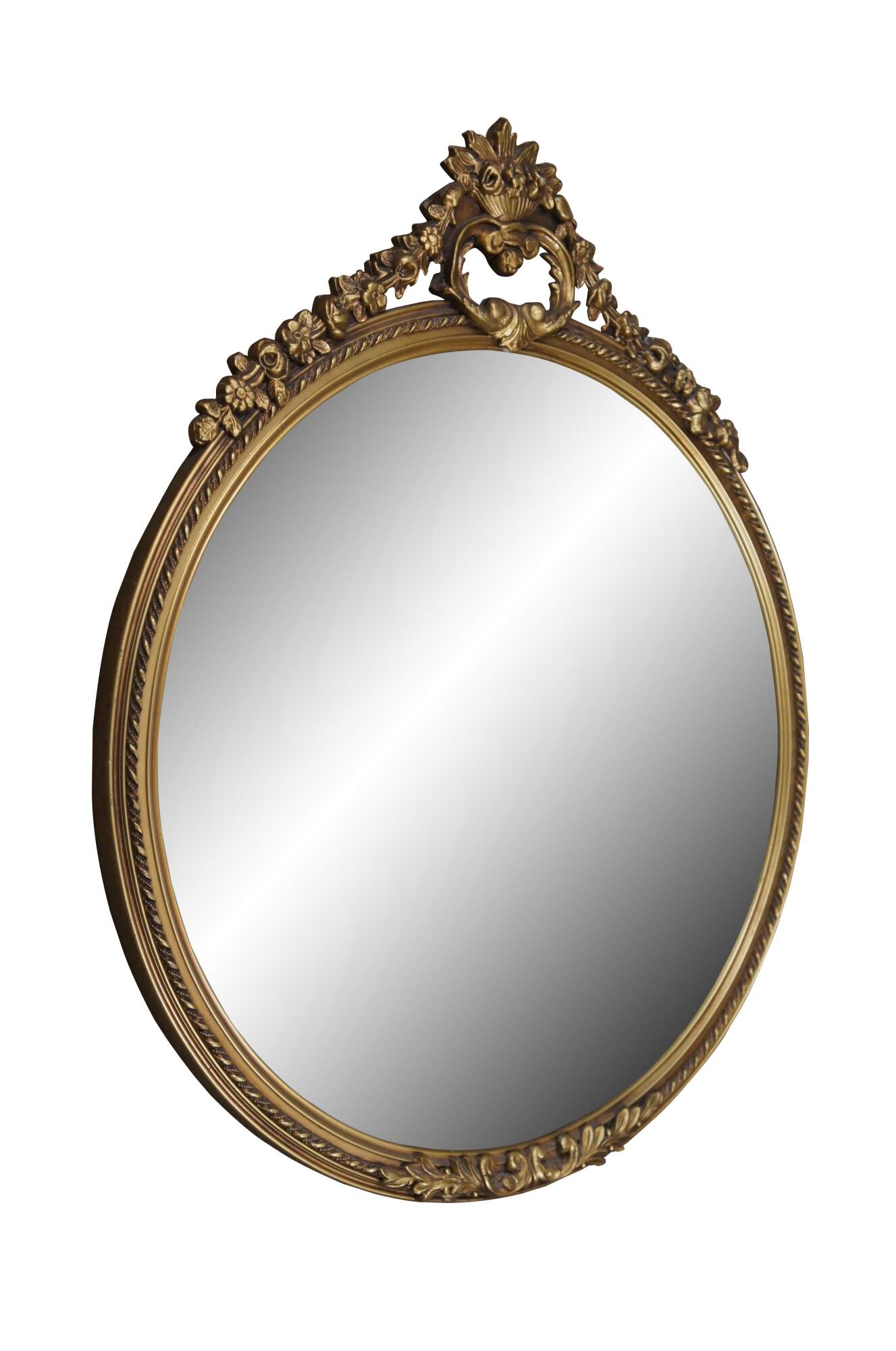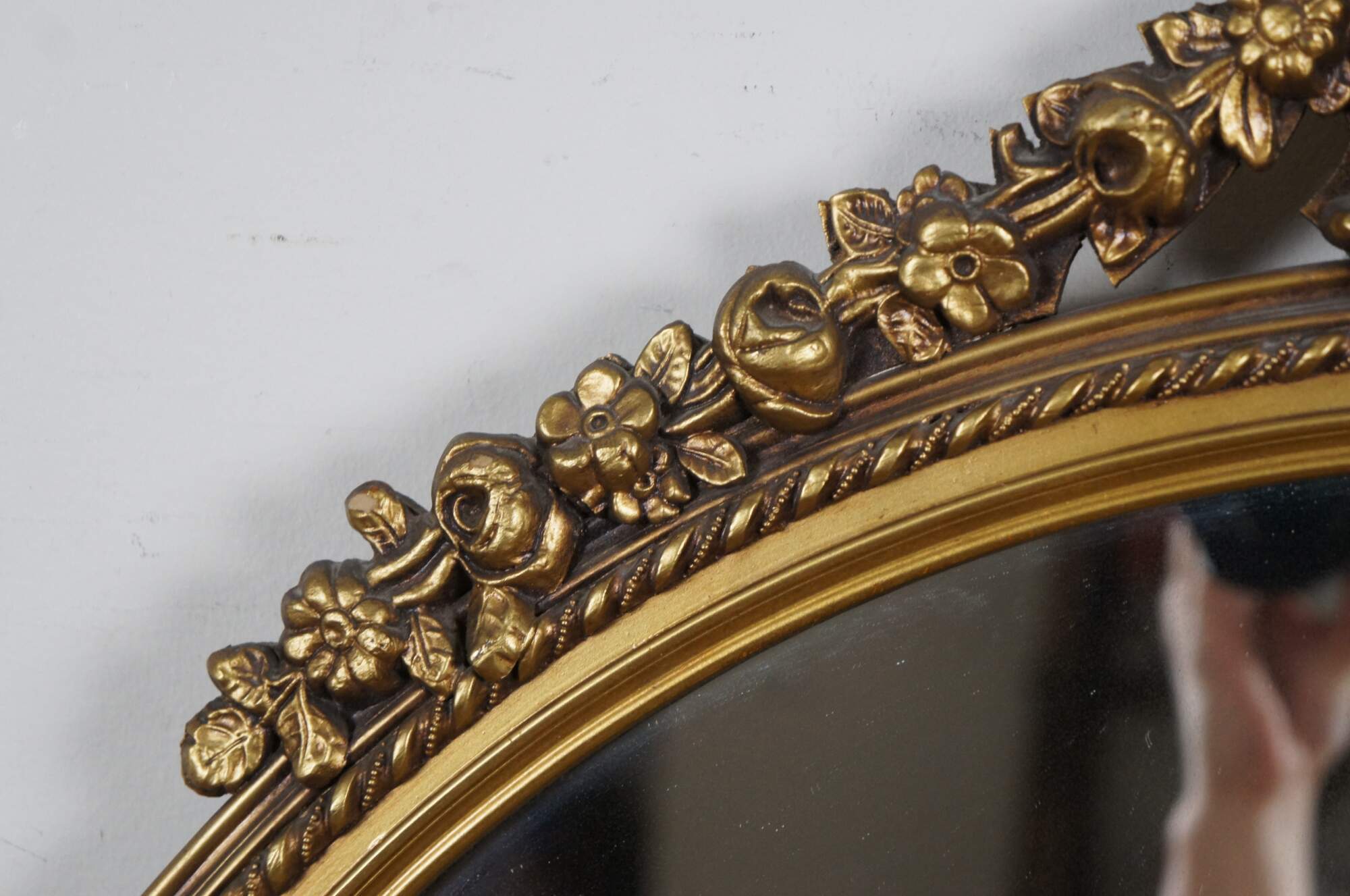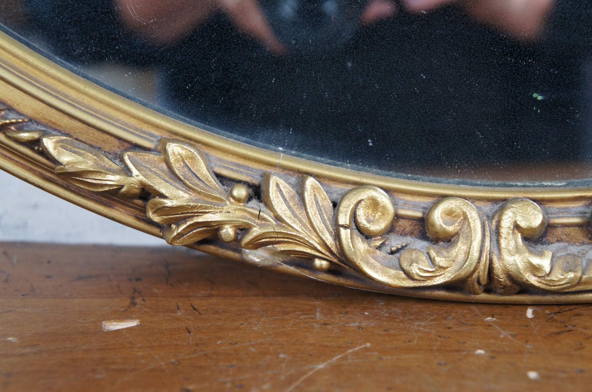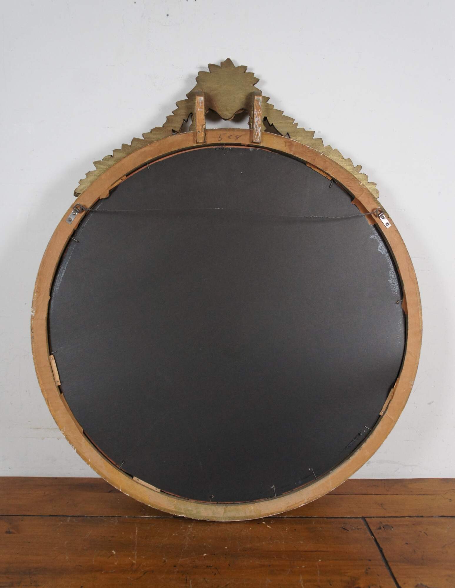 Early 20th century round wall mirror featuring Hollywood Regency / Empire / Neoclassical styling with a carved gold frame, beveled and beaded rope twist border, laurel leaves / acanthus / foliate designs and a crest in the shape of a bouquet spilling with flowers.