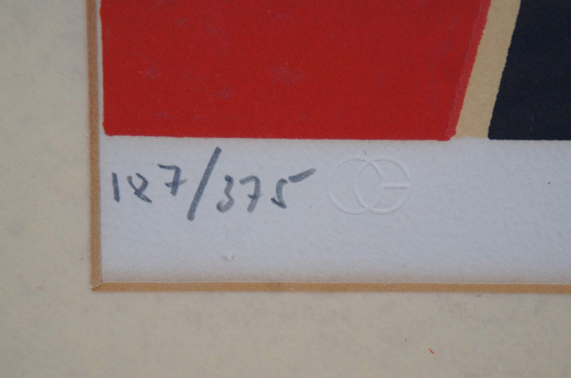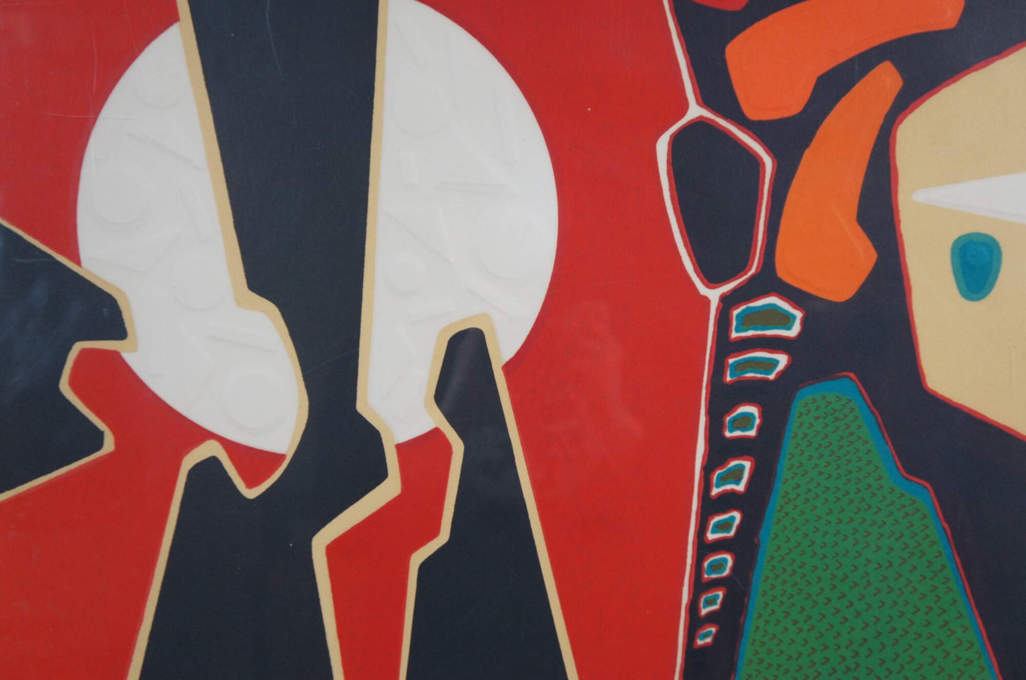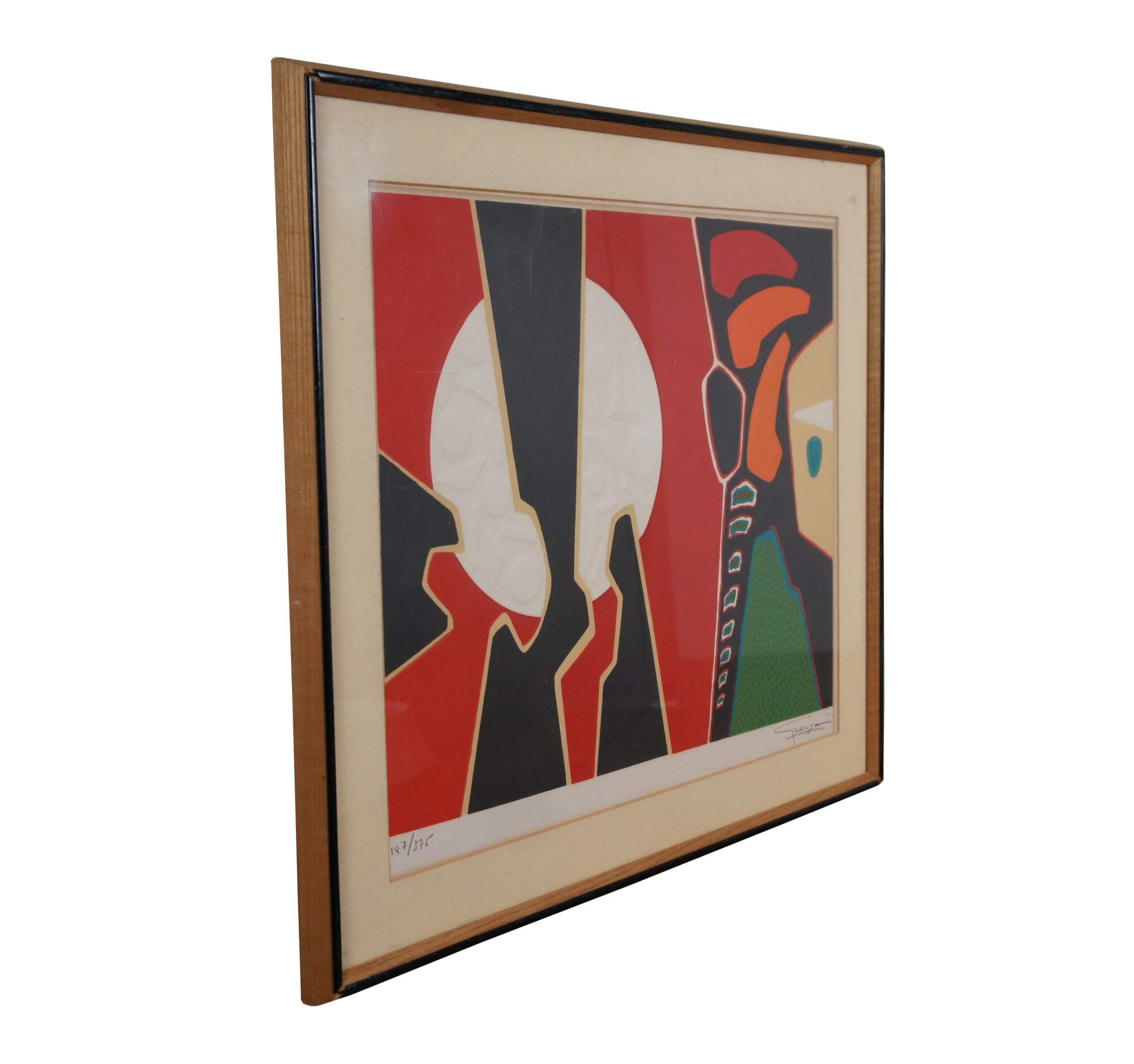 Mid 20th century lithograph art print by Spanish painter Antonio Guanse Brea (Born: January 1, 1926, Tortosa, Spain / Died: November 22, 2008, Paris, France) featuring a bold abstract design in red, black, orange and green, with embossed details. Pencil signed and numbered 187/375 along lower edge. Wood frame with black plastic detail; off white mat with red line detail. Backing marked 7953. Purchased at A.P.F. Inc, New York City.