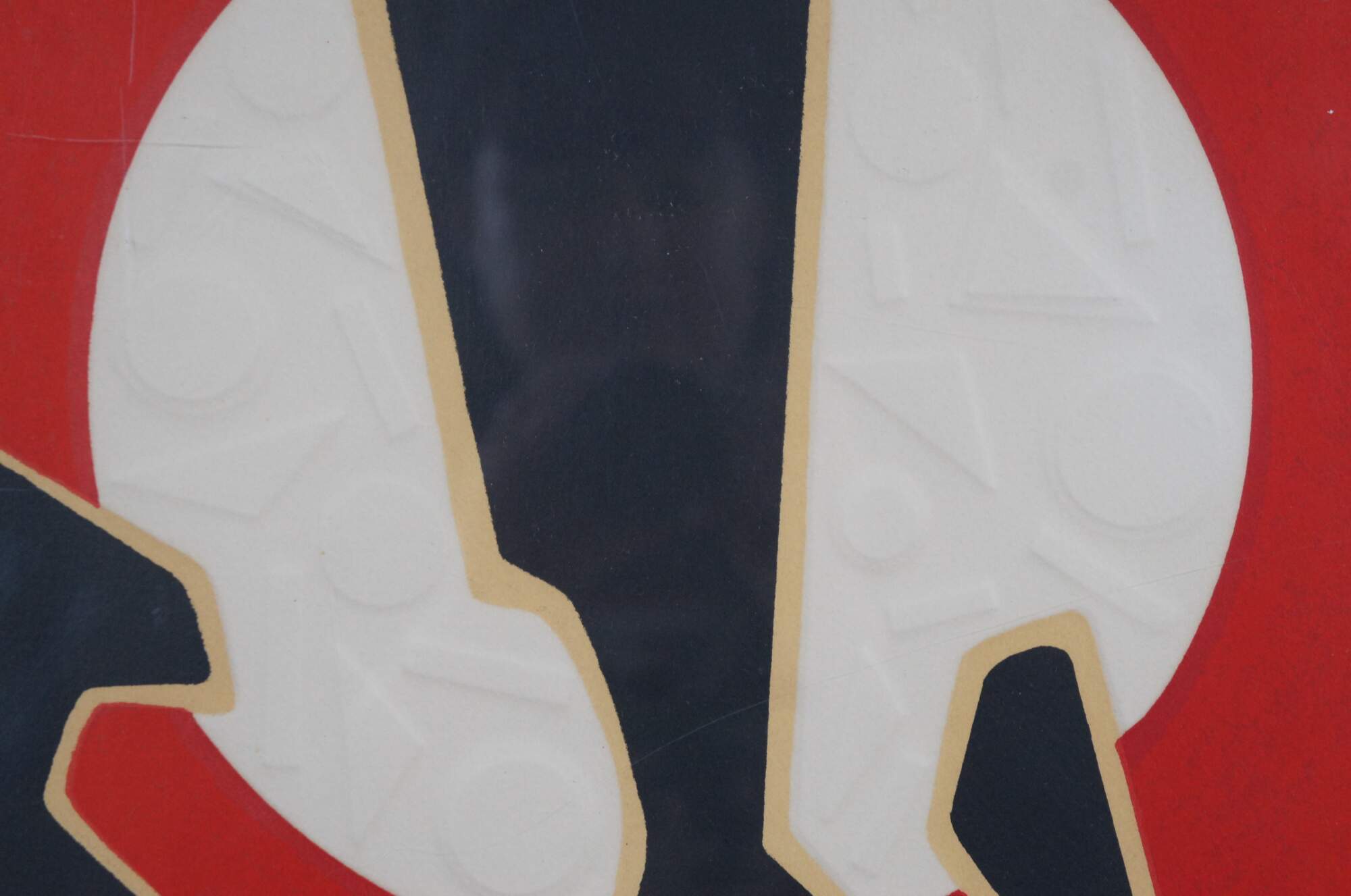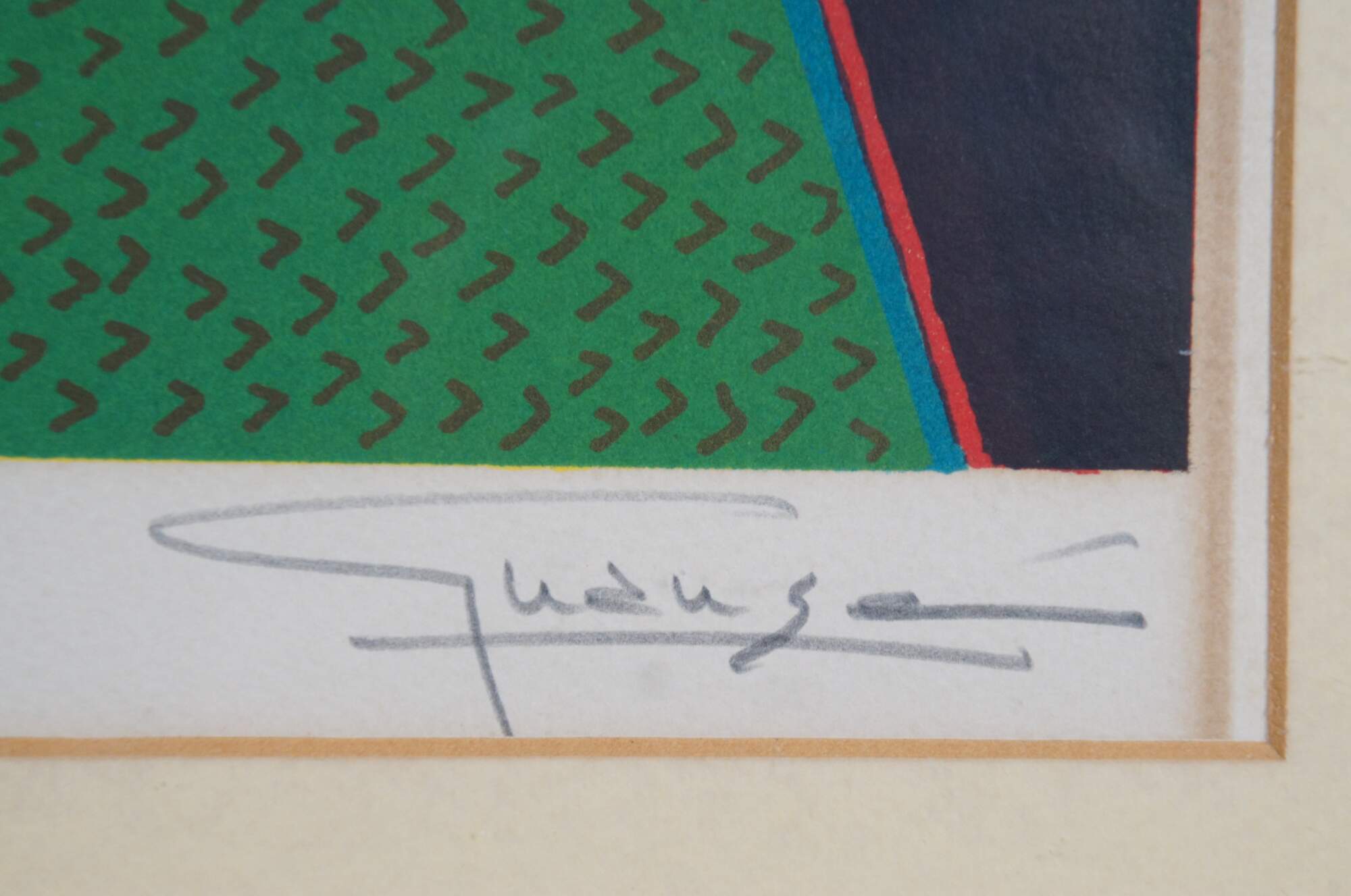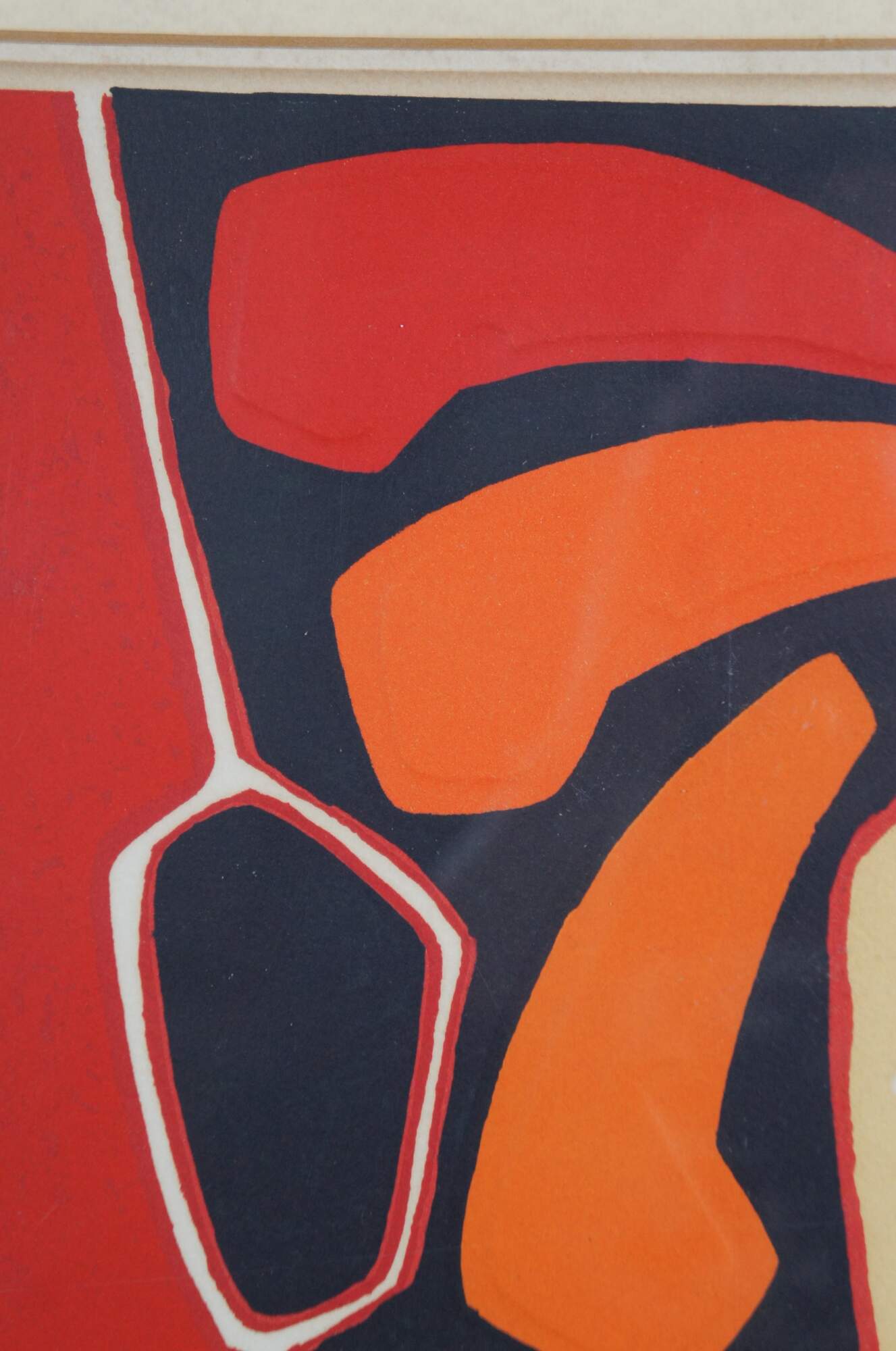 Mid 20th century lithograph art print by Spanish painter Antonio Guanse Brea (Born: January 1, 1926, Tortosa, Spain / Died: November 22, 2008, Paris, France) featuring a bold abstract design in red, black, orange and green, with embossed details. Pencil signed and numbered 187/375 along lower edge. Wood frame with black plastic detail; off white mat with red line detail. Backing marked 7953. Purchased at A.P.F. Inc, New York City.