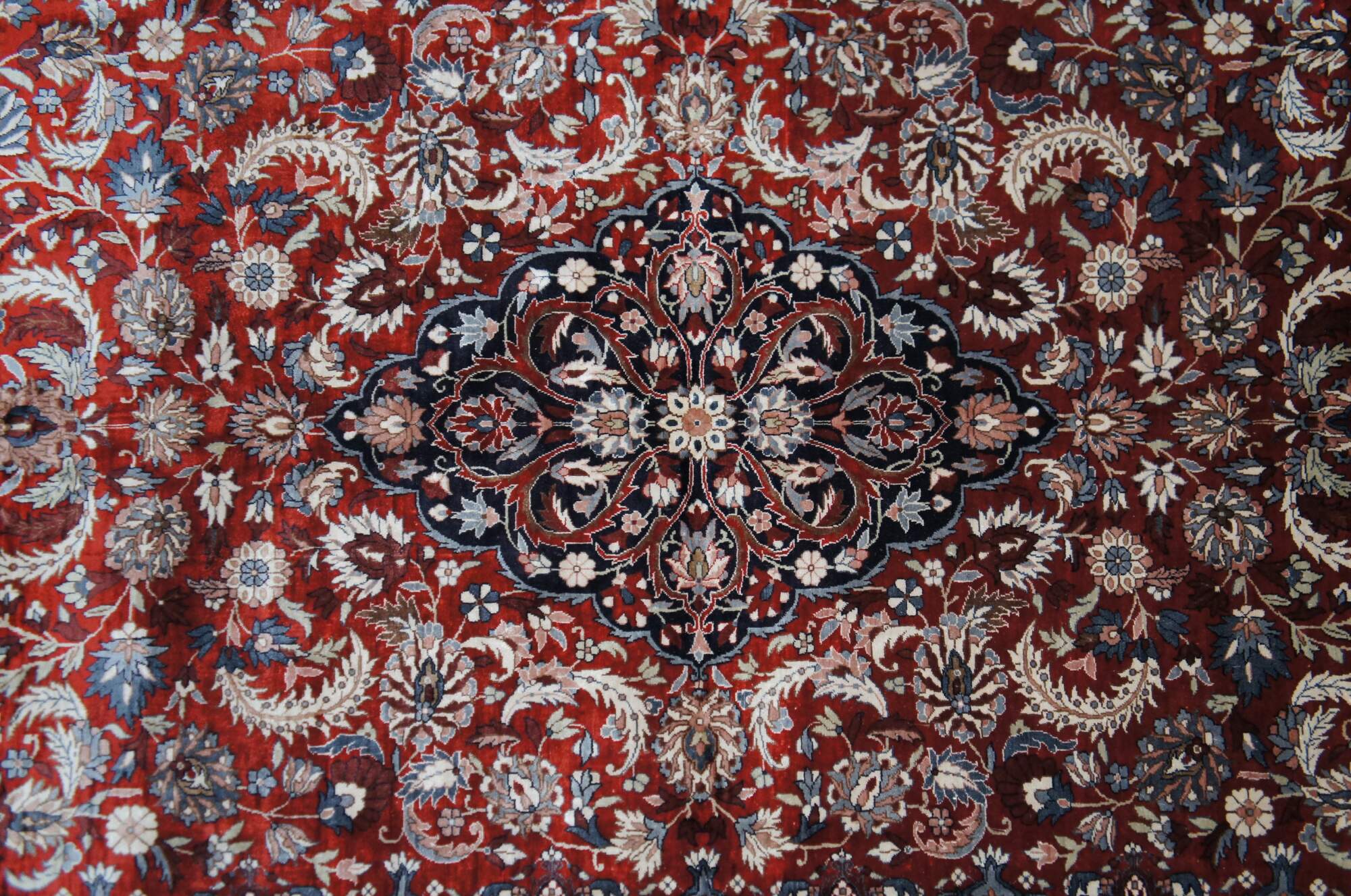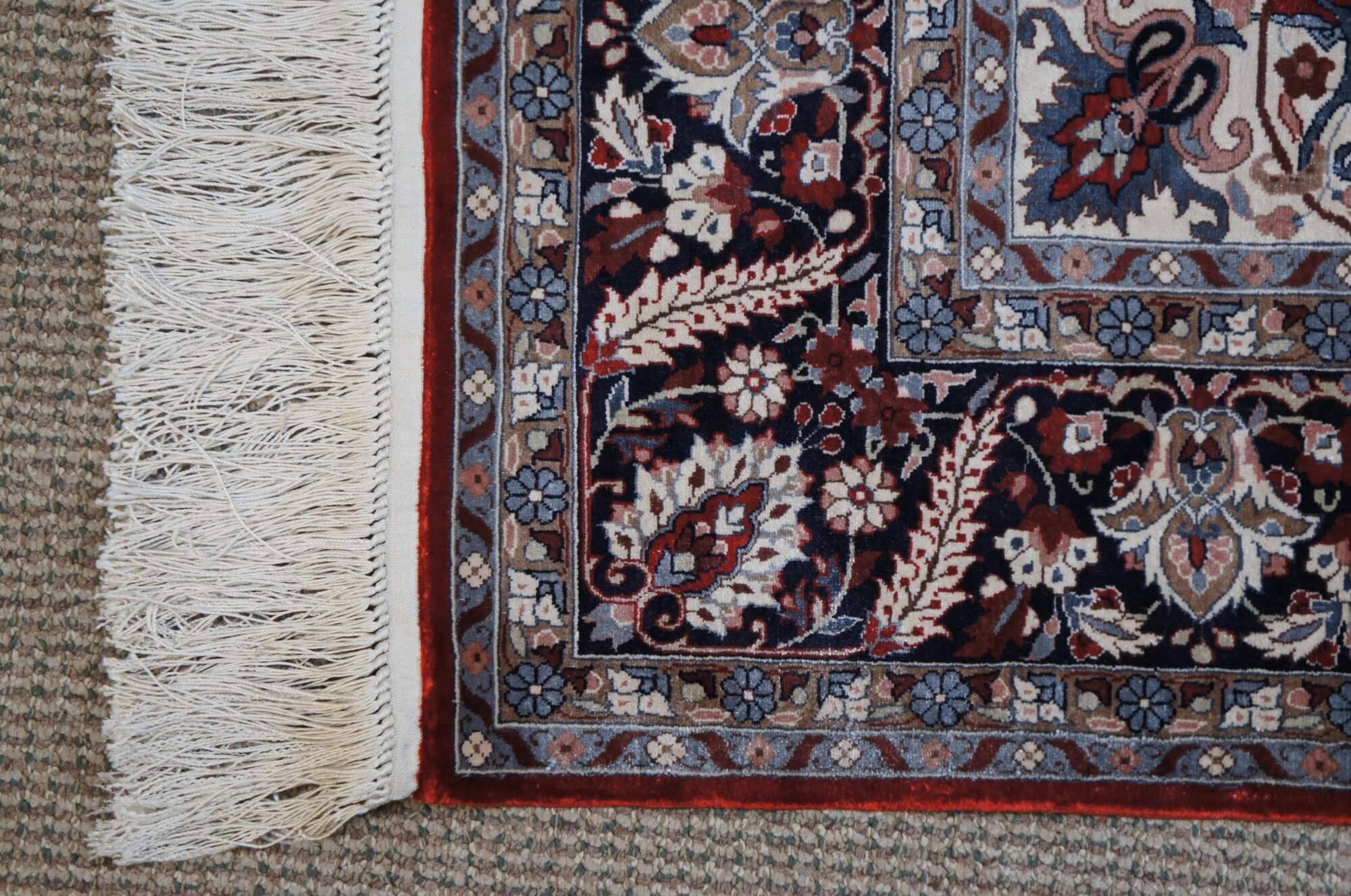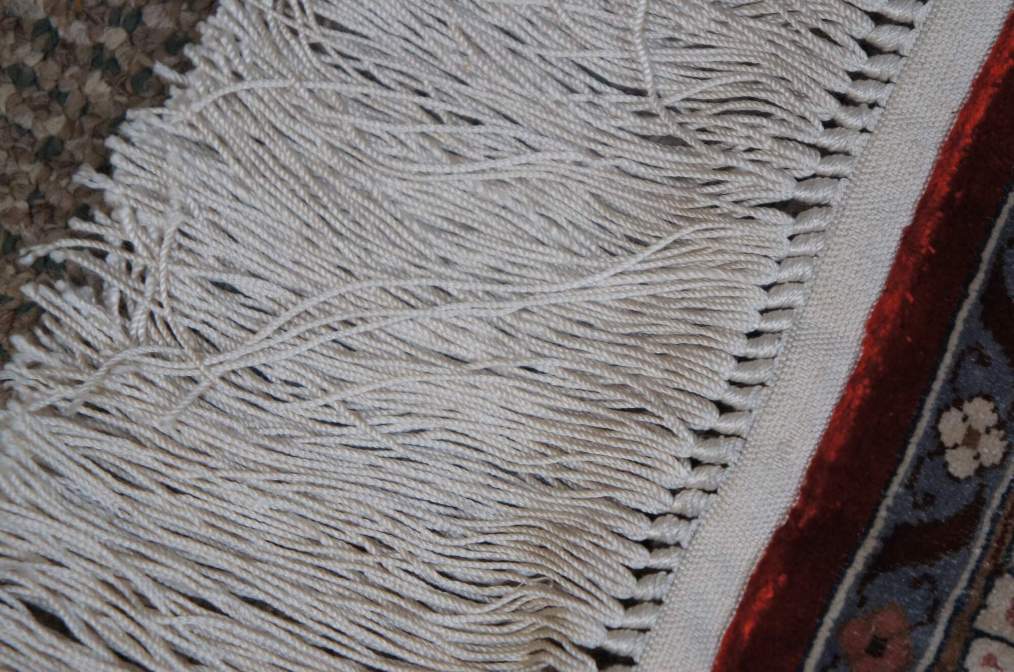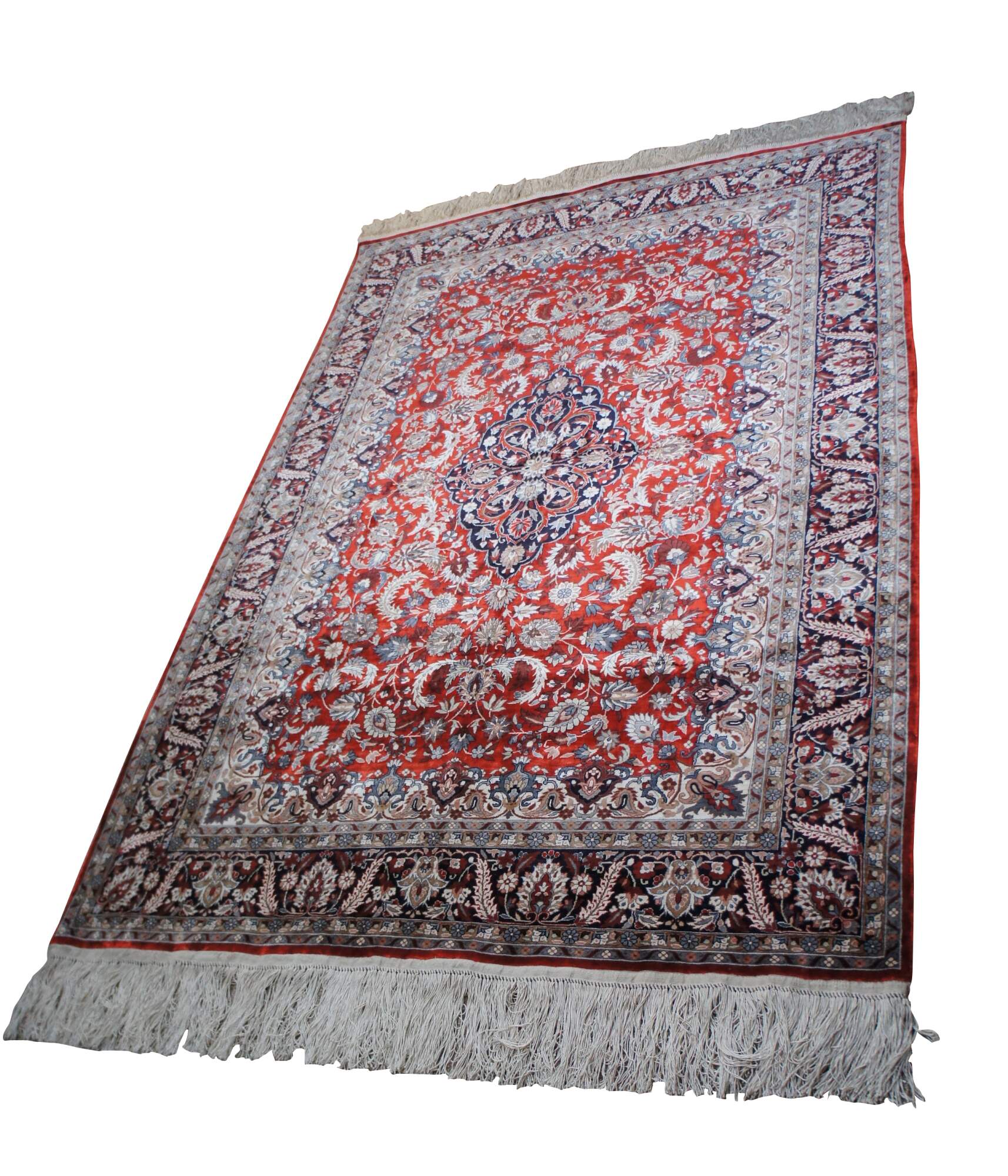 20th century hand knotted Persian Sino silk area rug / carpet with long fringe, decorated with a floral / foliate / acanthus design with central medallion in red, blue, and white.