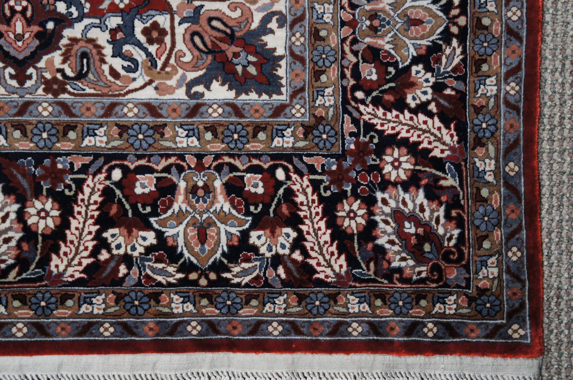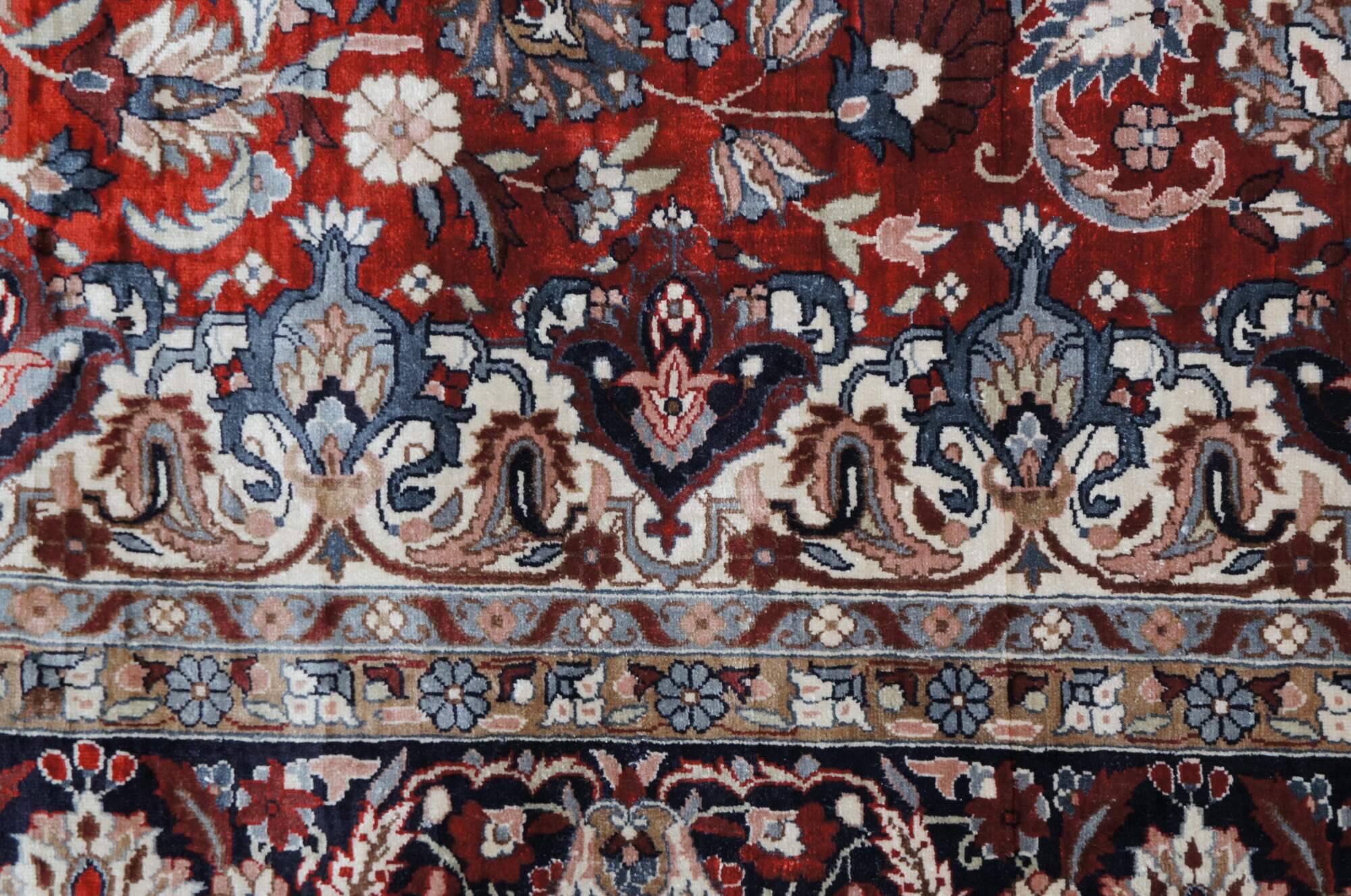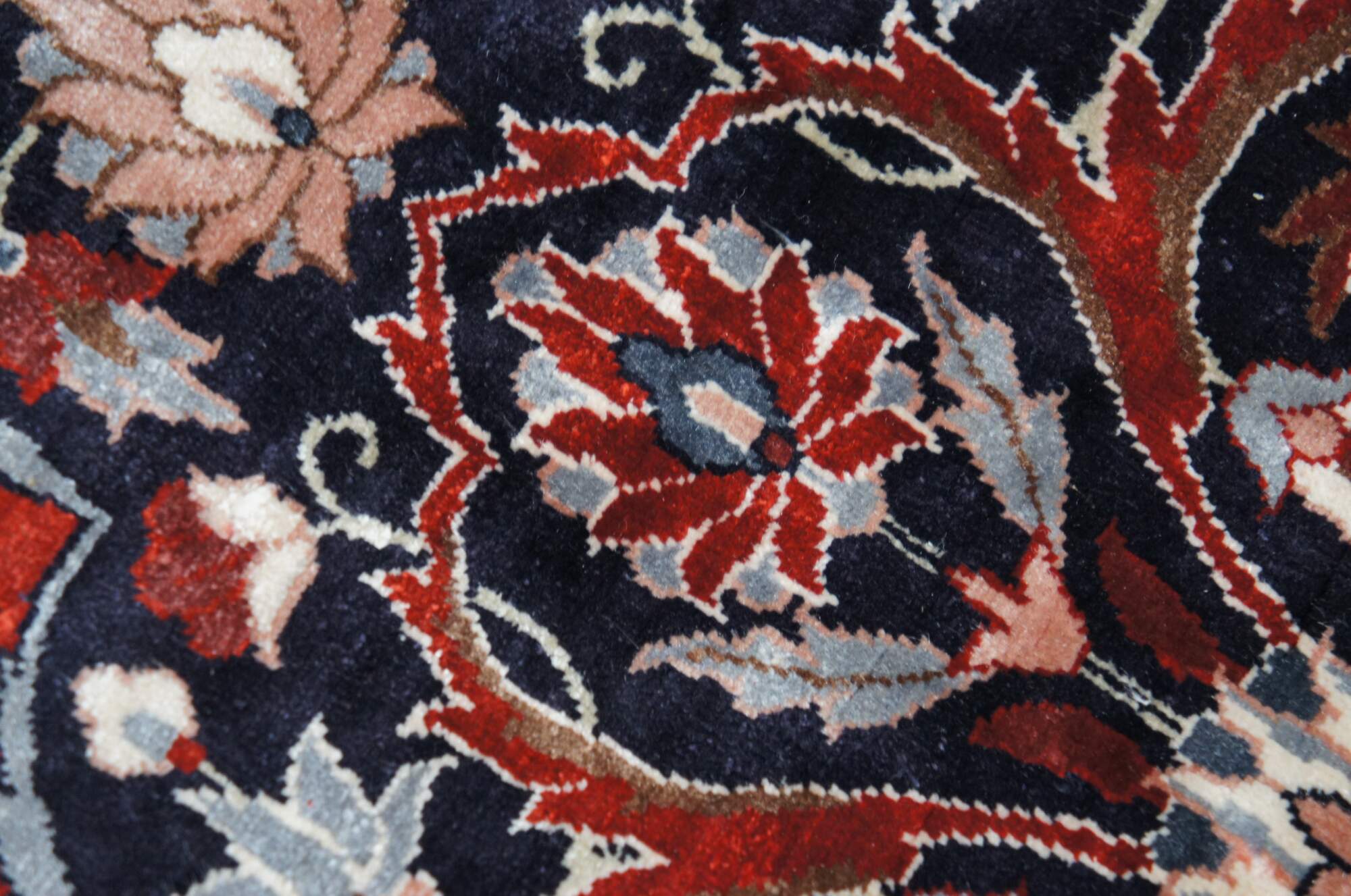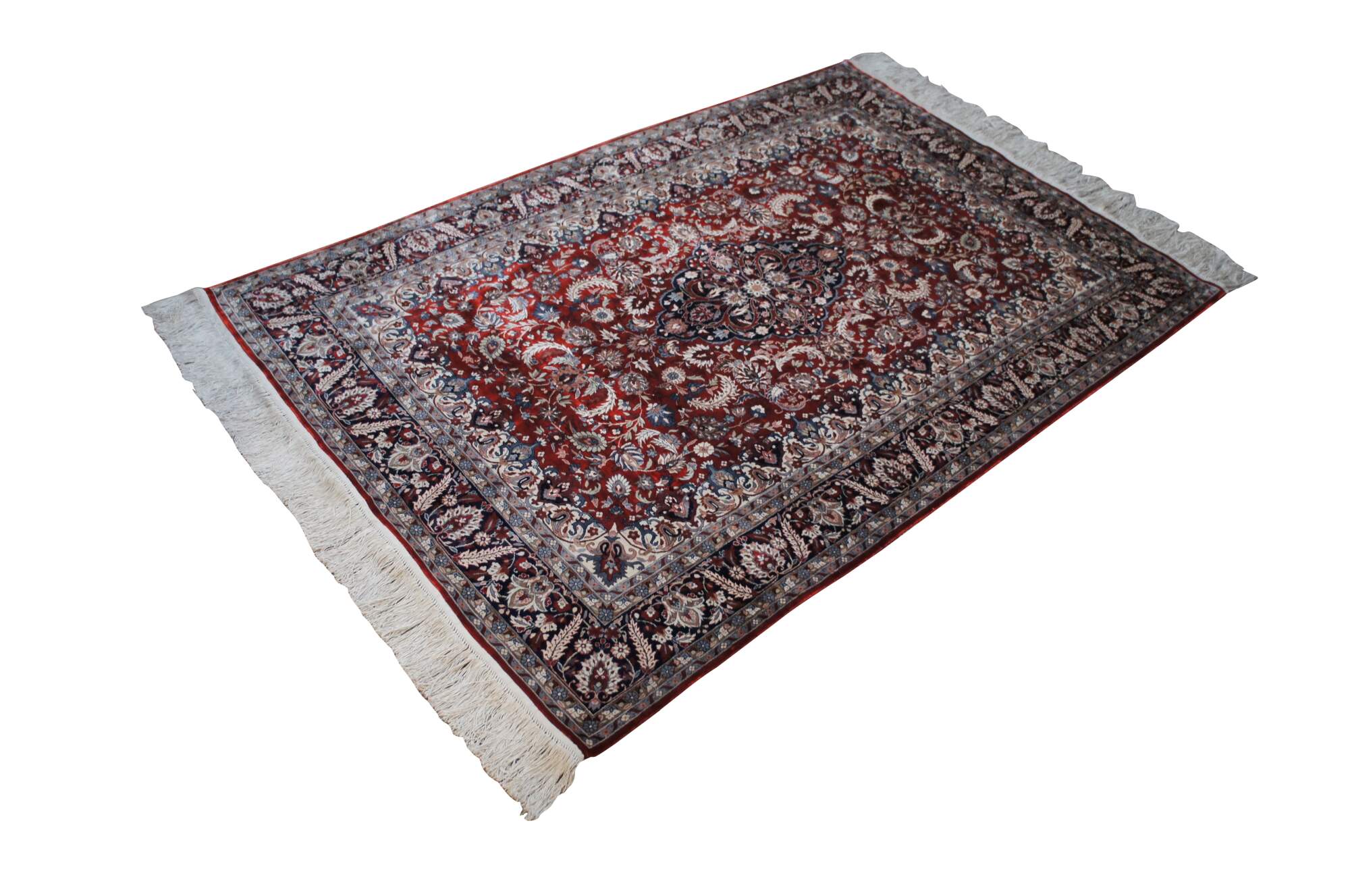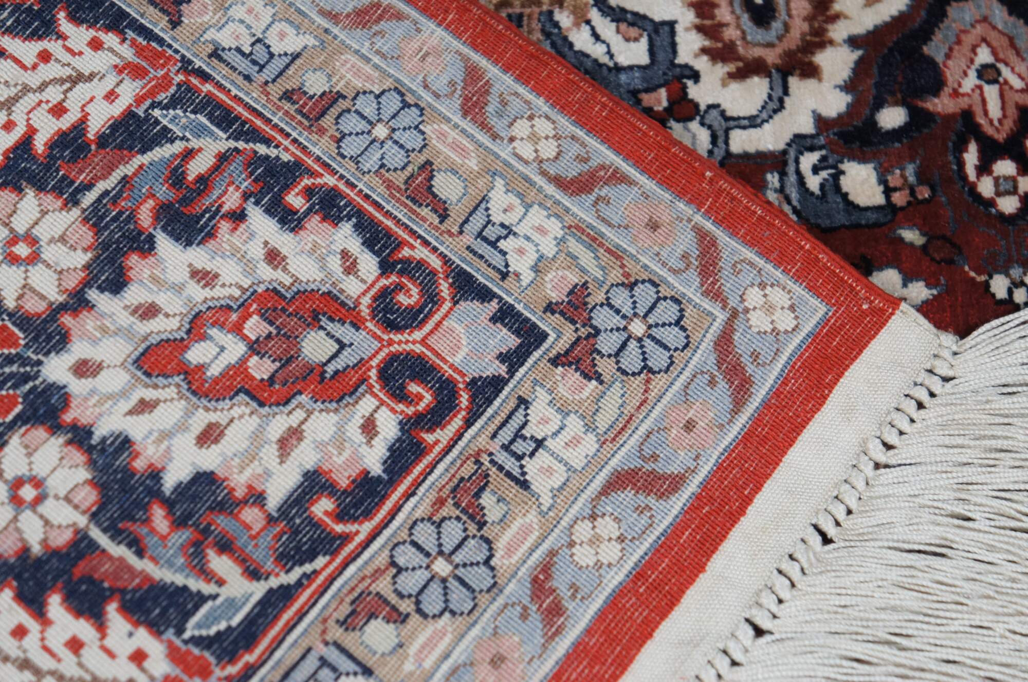 20th century hand knotted Persian Sino silk area rug / carpet with long fringe, decorated with a floral / foliate / acanthus design with central medallion in red, blue, and white.
